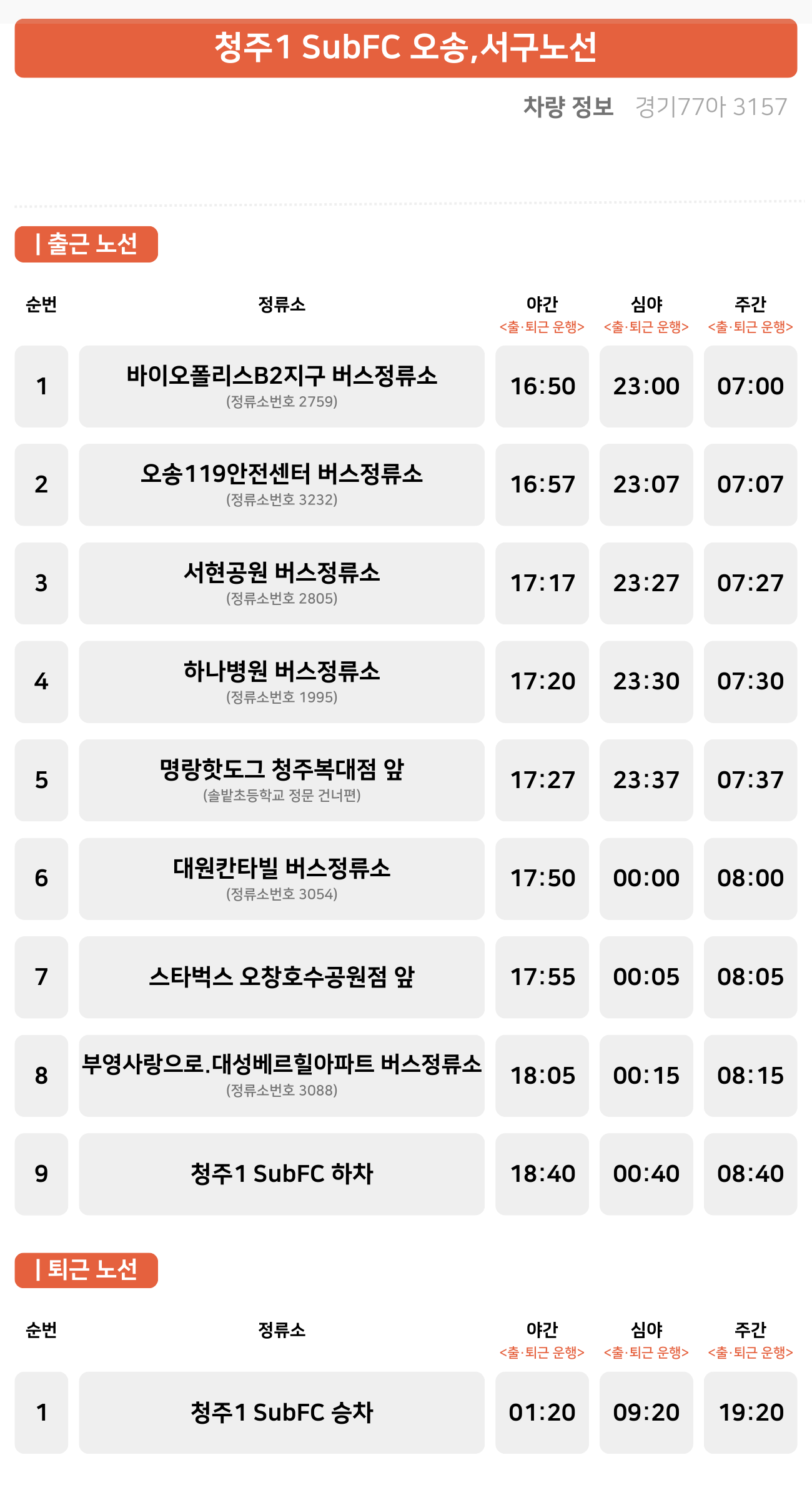 바이오폴리스B2지구 버스정류소 ↔ 오송119안전센터 버스정류소 ↔ 서현공원 버스정류소 ↔ 하나병원 버스정류소 ↔ 명랑핫도그 청주복대점 앞 ↔ 대원칸타빌 버스정류소 ↔ 스타벅스 오창호수공원점 앞 ↔ 부영사랑으로.대성베르힐아파트 버스정류소 ↔ 청주 1 Sub FC