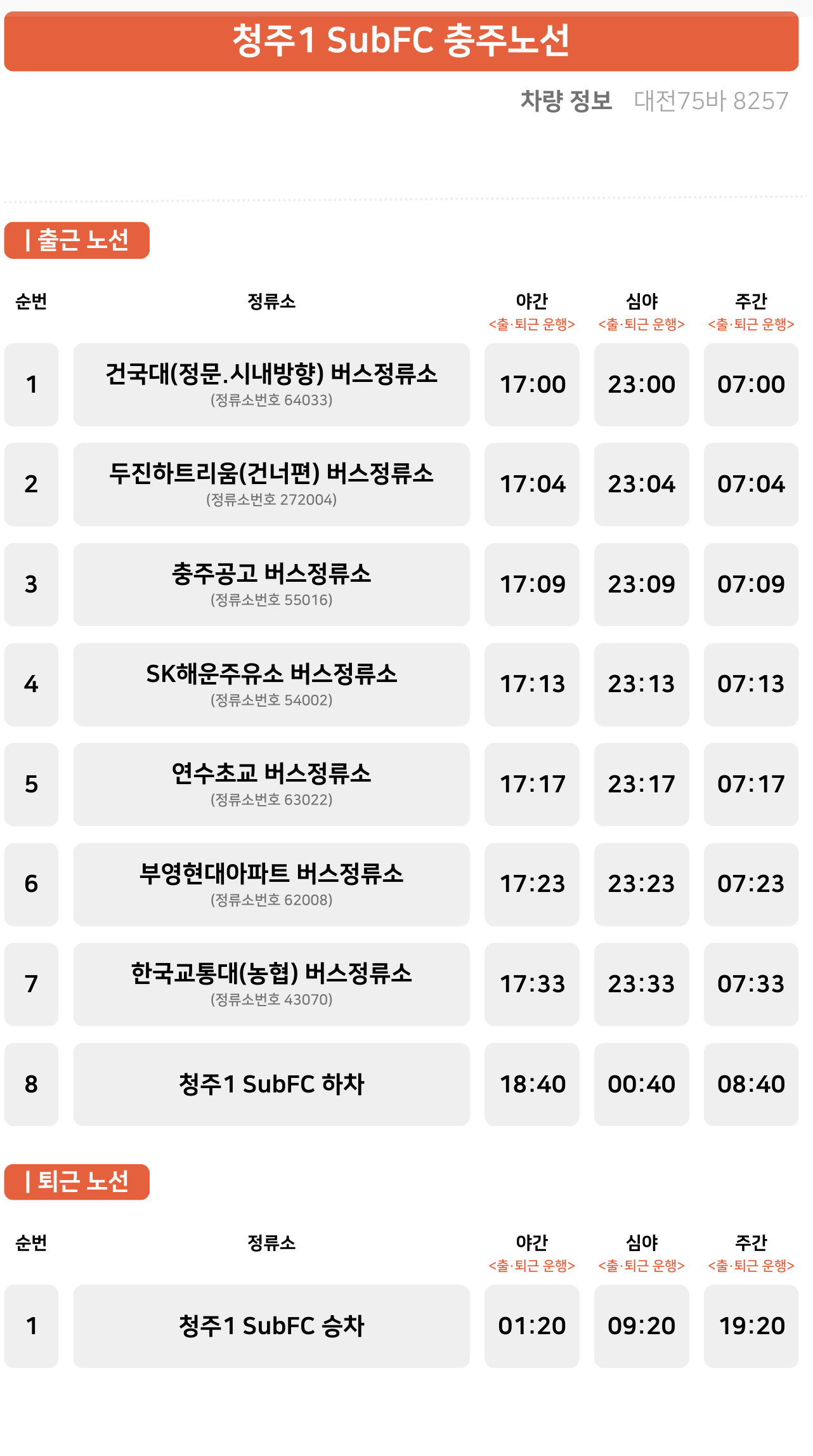 건국대(정문.시내 방향)버스 정류소 ↔ 두진하트리움(건너편)버스정류소 ↔ 충주공고 버스정류소 ↔ SK해운주유소 버스정류소 ↔ 연수초교 버스정류소 ↔ 부영현대아파트 버스정류소 ↔ 한국교통대(농협) 버스정류소 ↔ 청주 1 Sub FC