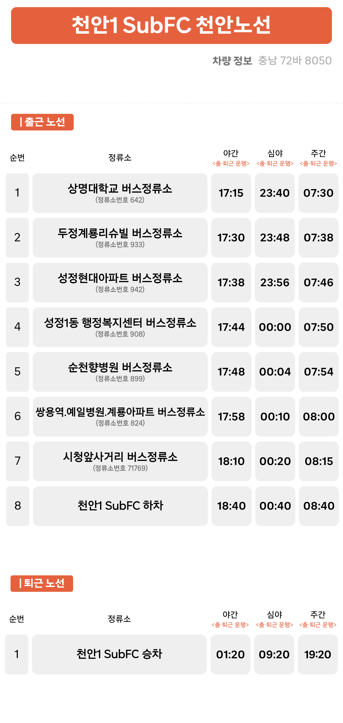 상명대학교 버스정류소 ↔ 계룡리슈빌아파트 ↔ 성정현대아파트 ↔ 성정1동 행정복지센터 ↔ 순천향병원 ↔ 쌍용역예일병원계롱아파트 ↔ 시청앞사거리 ↔ 천안1 SubFC