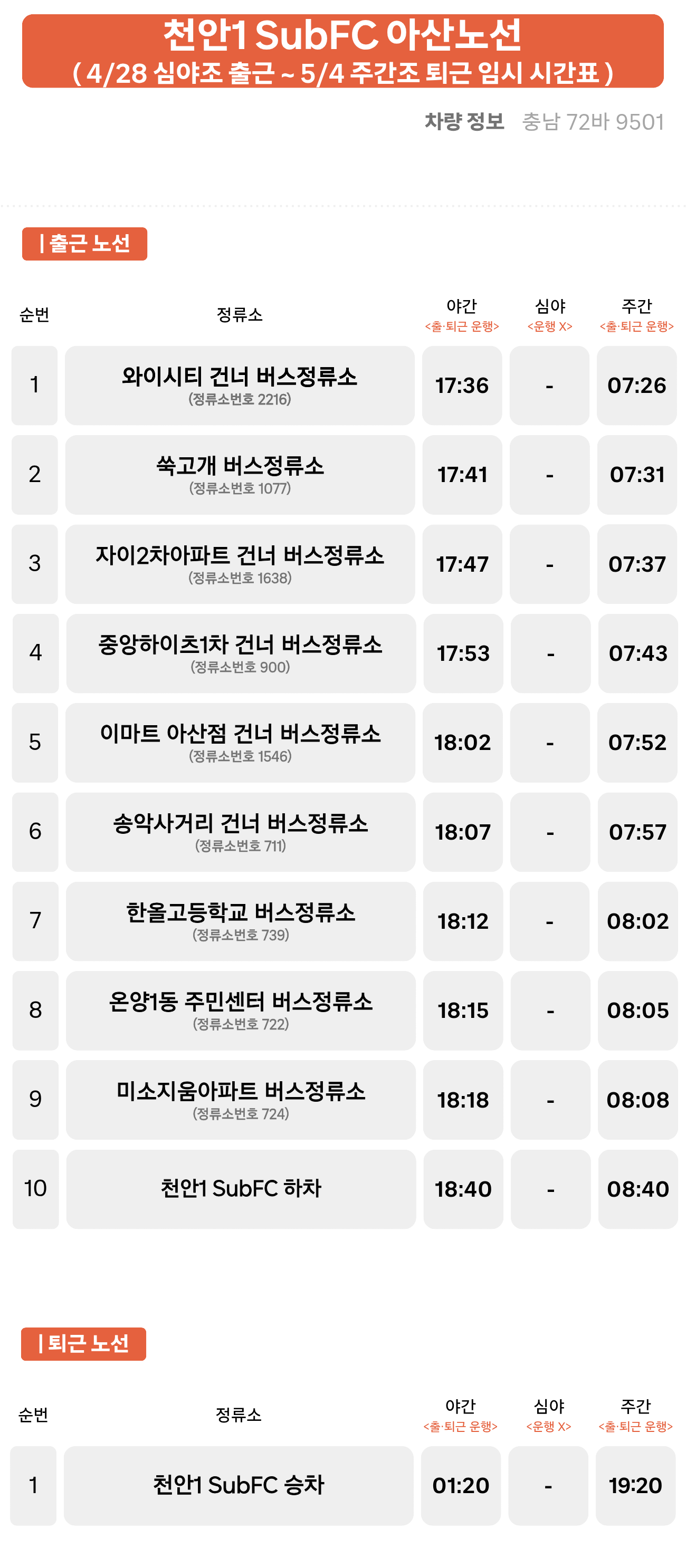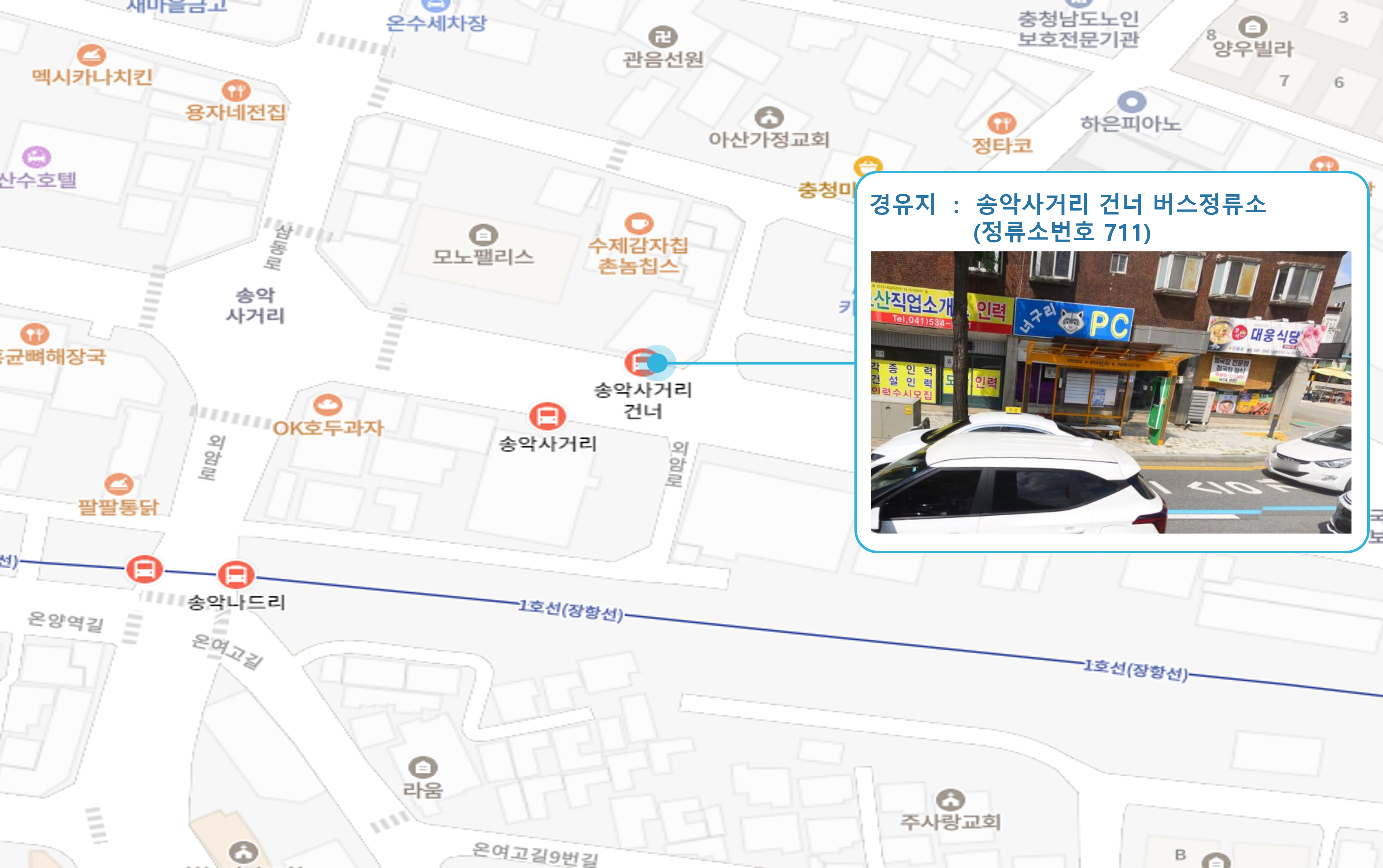 와이시티 ↔ 쑥고개 ↔ 자이2차아파트 ↔ 중앙하이츠 1차 ↔ 이마트 아산점 ↔송악사거리 건너 버스정류소 ↔ 한올고등학교 ↔ 온양1동 주민센터 ↔ 미소지움아파트 ↔ 천안1 SubFC