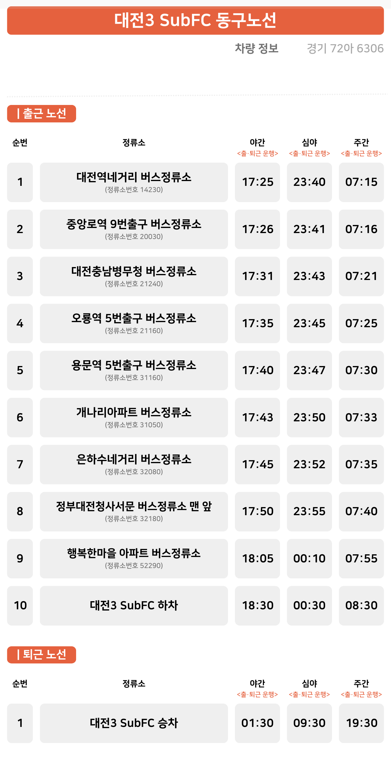 대전역네거리 ↔ 중앙로역 ↔ 대전충남병무청 ↔  오룡역 ↔ 용문역 ↔ 개나리아파트 ↔ 은하수네거리 ↔ 정부대전청사서문 ↔ 행복한마을아파트 ↔ 대전 3 Sub FC