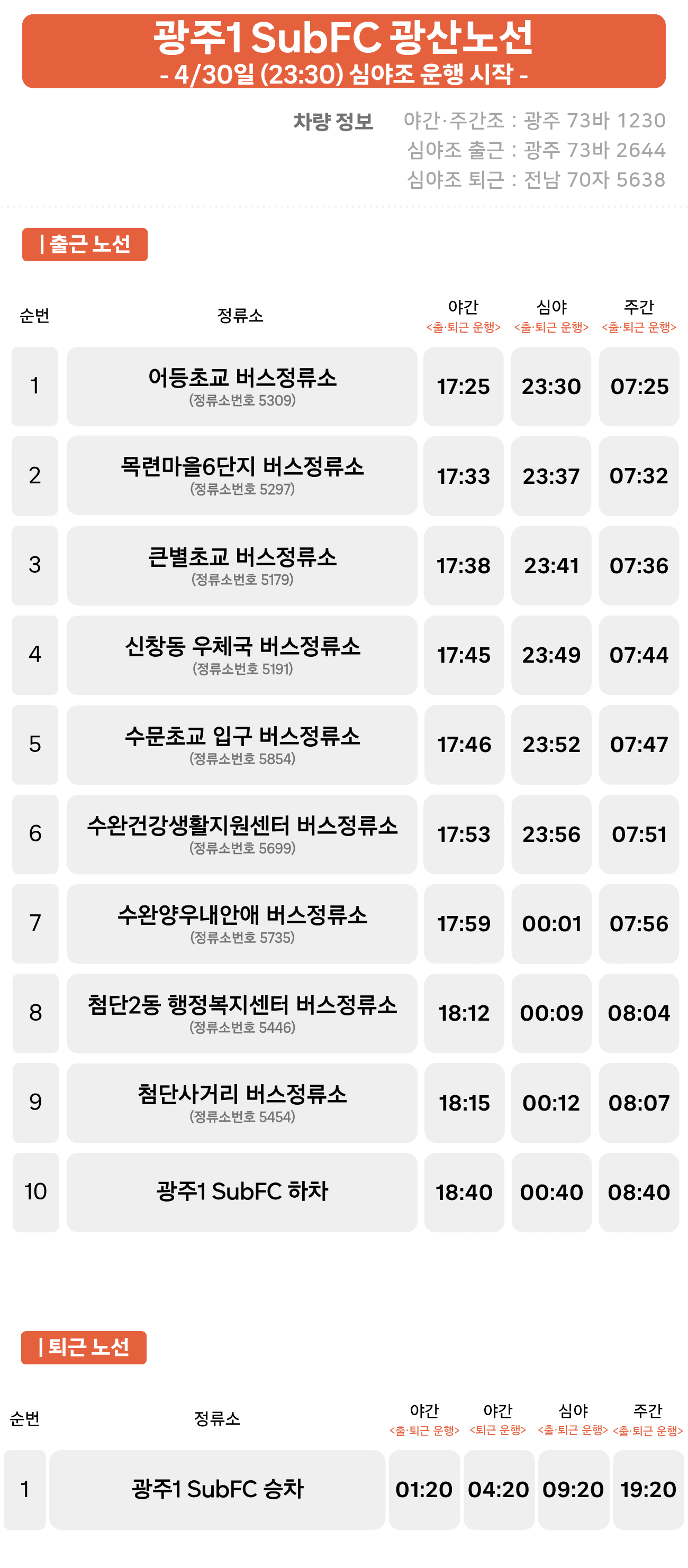 어등초교 ↔ 목련마을6단지 ↔ 큰별초교 ↔ 신창동우체국 ↔ 수문초교입구 ↔ 수완건강생활지원센터 ↔ 수완양우내안애 ↔ 첨단2동행정복지센터 ↔ 첨단사거리 ↔ 광주1 Sub FC