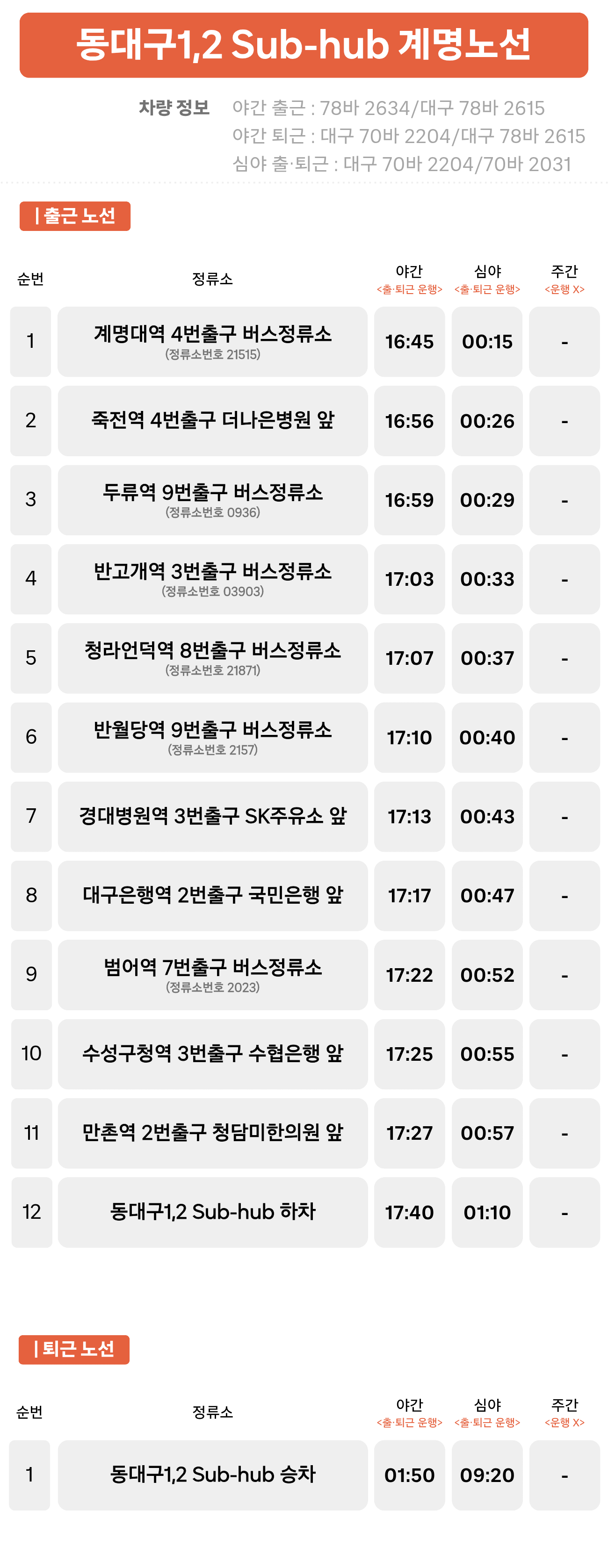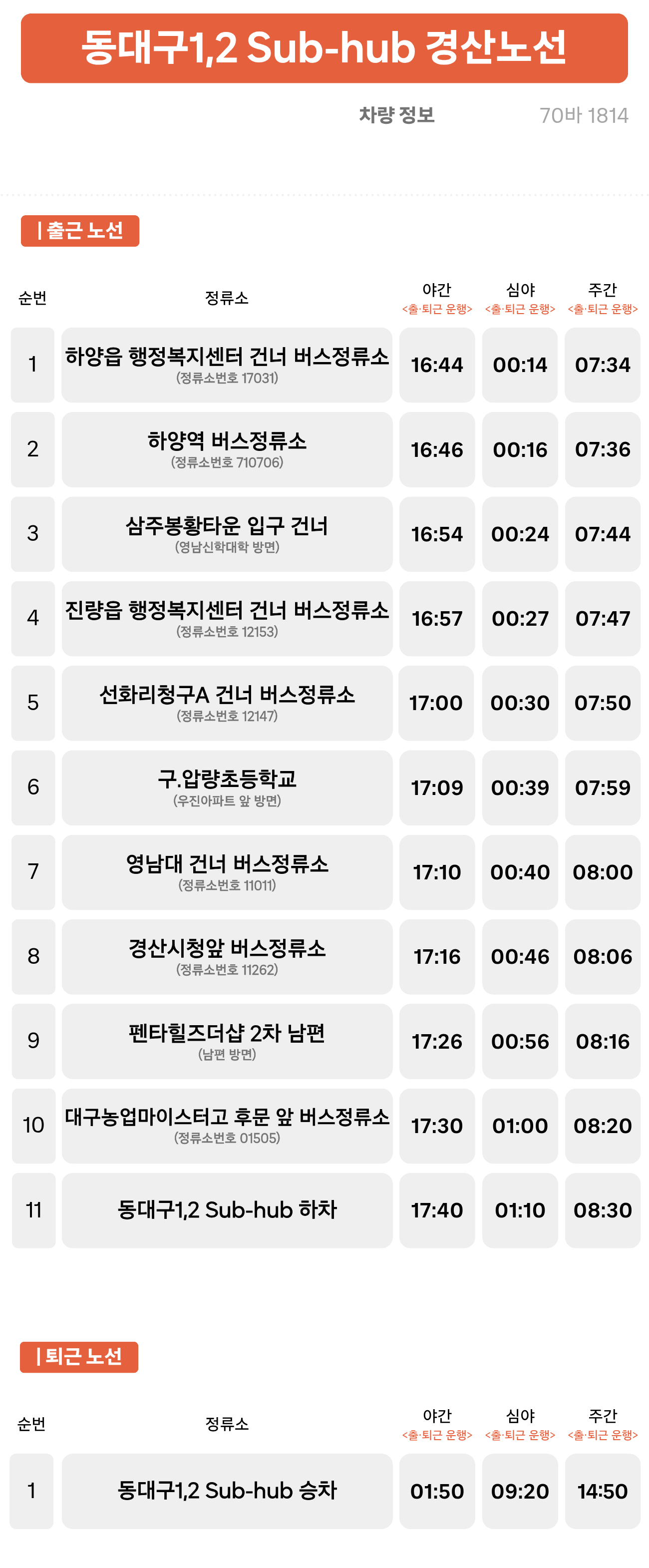 하양읍 행정복지센터 ↔ 하양역 ↔ 삼주봉황타운 ↔ 진량읍 행정복지센터 ↔ 선화리청구A ↔ 구.압량초등학교 (우진아파트) ↔ 영남대 ↔ 경산시청 ↔ 펜타힐즈더샵 2차 ↔ 대구농업마이스터고 후문 ↔ 동대구2 Sub-hub