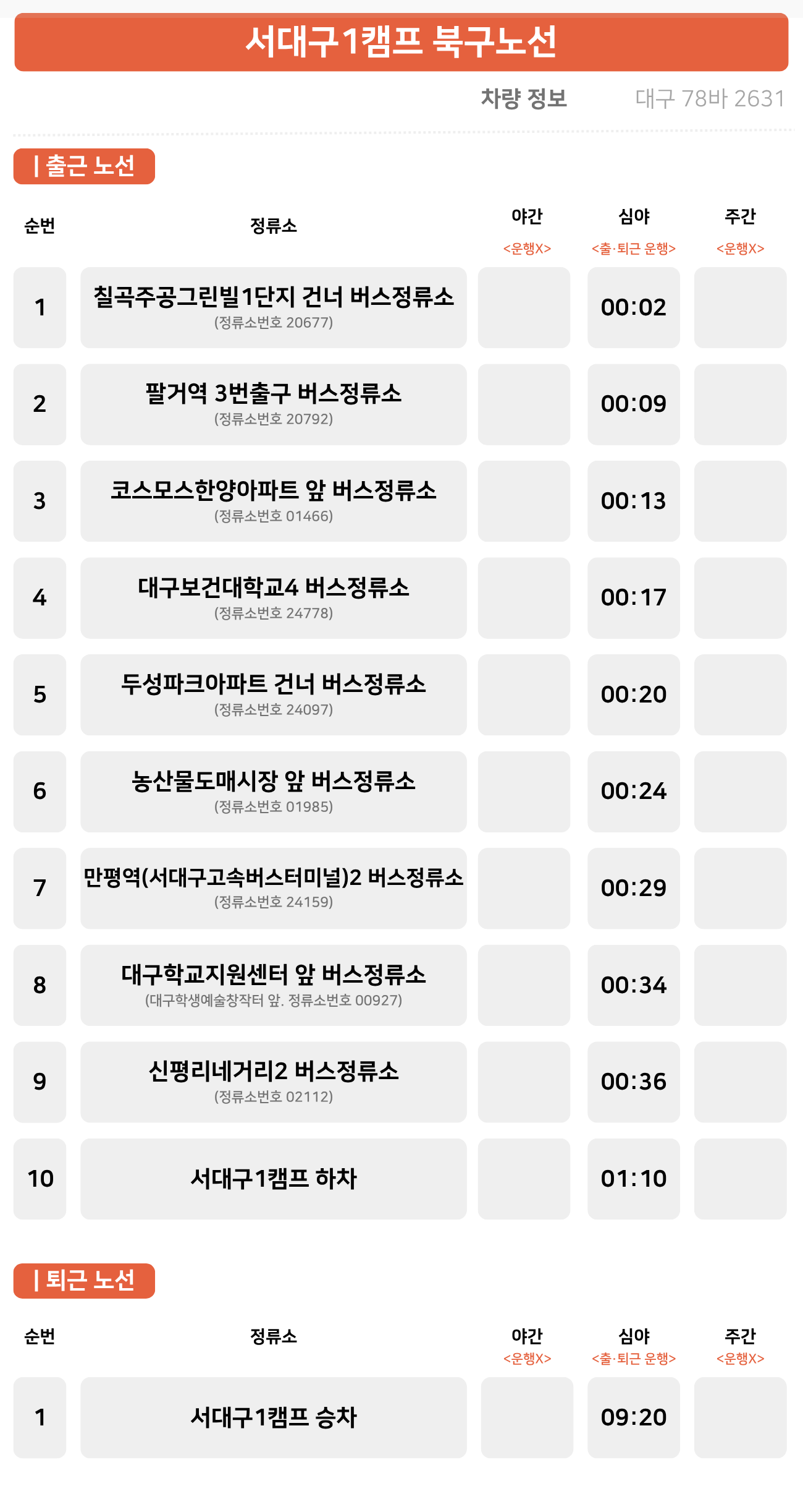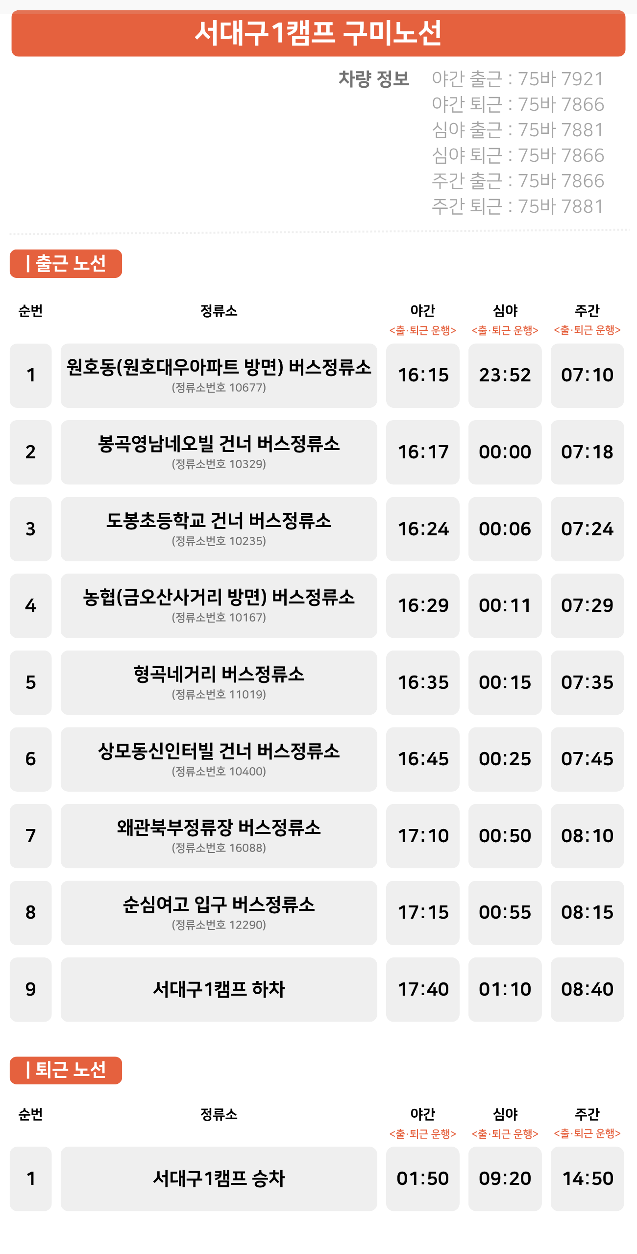 원호동(원호대우아파트방면)버스정류소 ↔ 봉곡영남네오빌 건너 버스정류소↔ 도봉초등학교 건너 버스정류소 ↔ 농협(금오산사거리 방면) 버스정류소 ↔ 형곡네거리 ↔ 상모동신인터빌 건너 버스정류소 ↔ 왜관북부정류장 버스정류소 ↔ 순심여고 입구 버스정류소 ↔ 서대구1 캠프