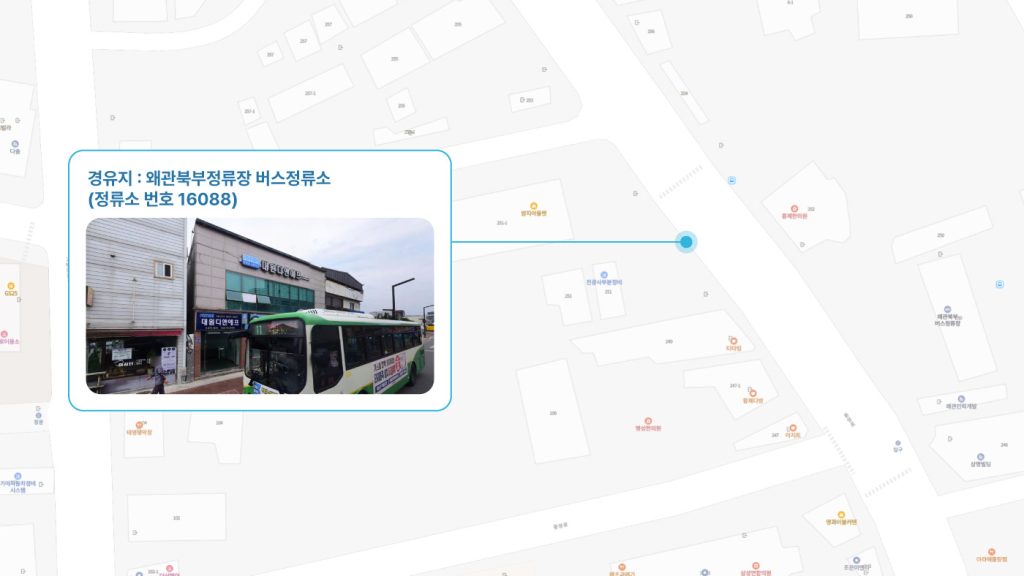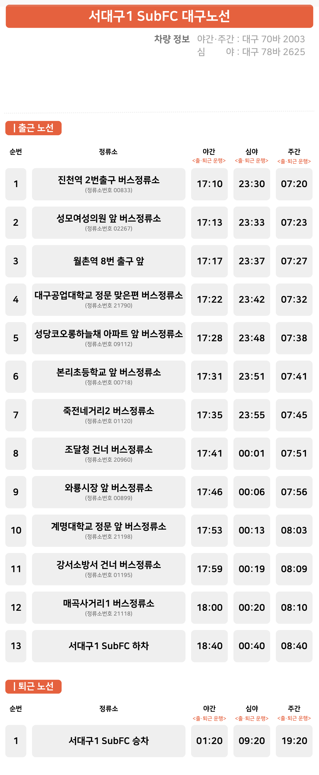 원호동(원호대우아파트 방면)정류소 ↔ 봉곡영남네오빌 건너 정류소 ↔ 도봉초등학교 건너 정류소 ↔ 농협(금오산사거리 방면)정류소 ↔ 형곡네거리 ↔ 상모동신인터빌 건너 정류소 ↔ 왜관북부정류장 정류소 ↔ 순심여고 입구 정류소 ↔ 서대구1 Sub FC