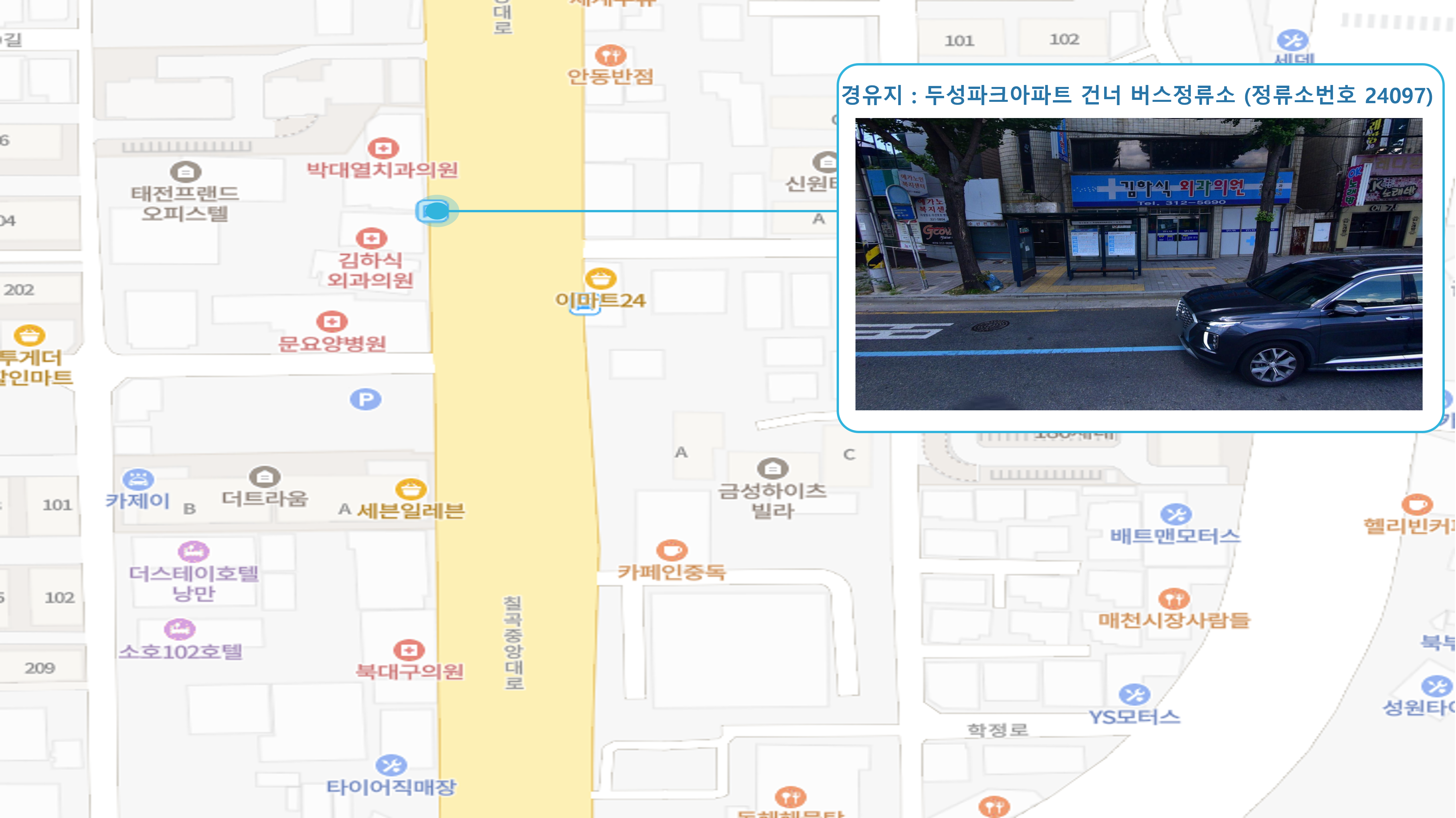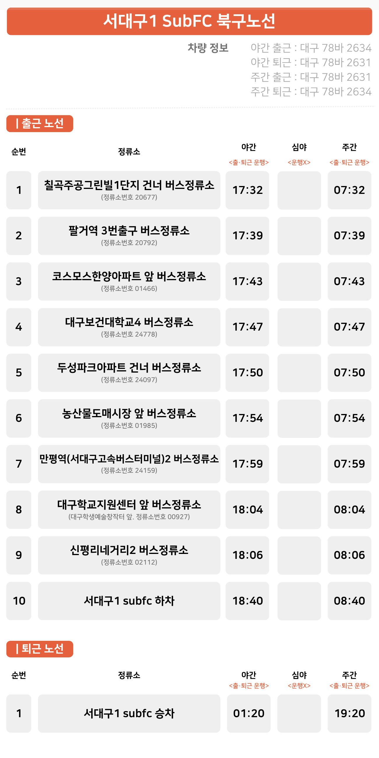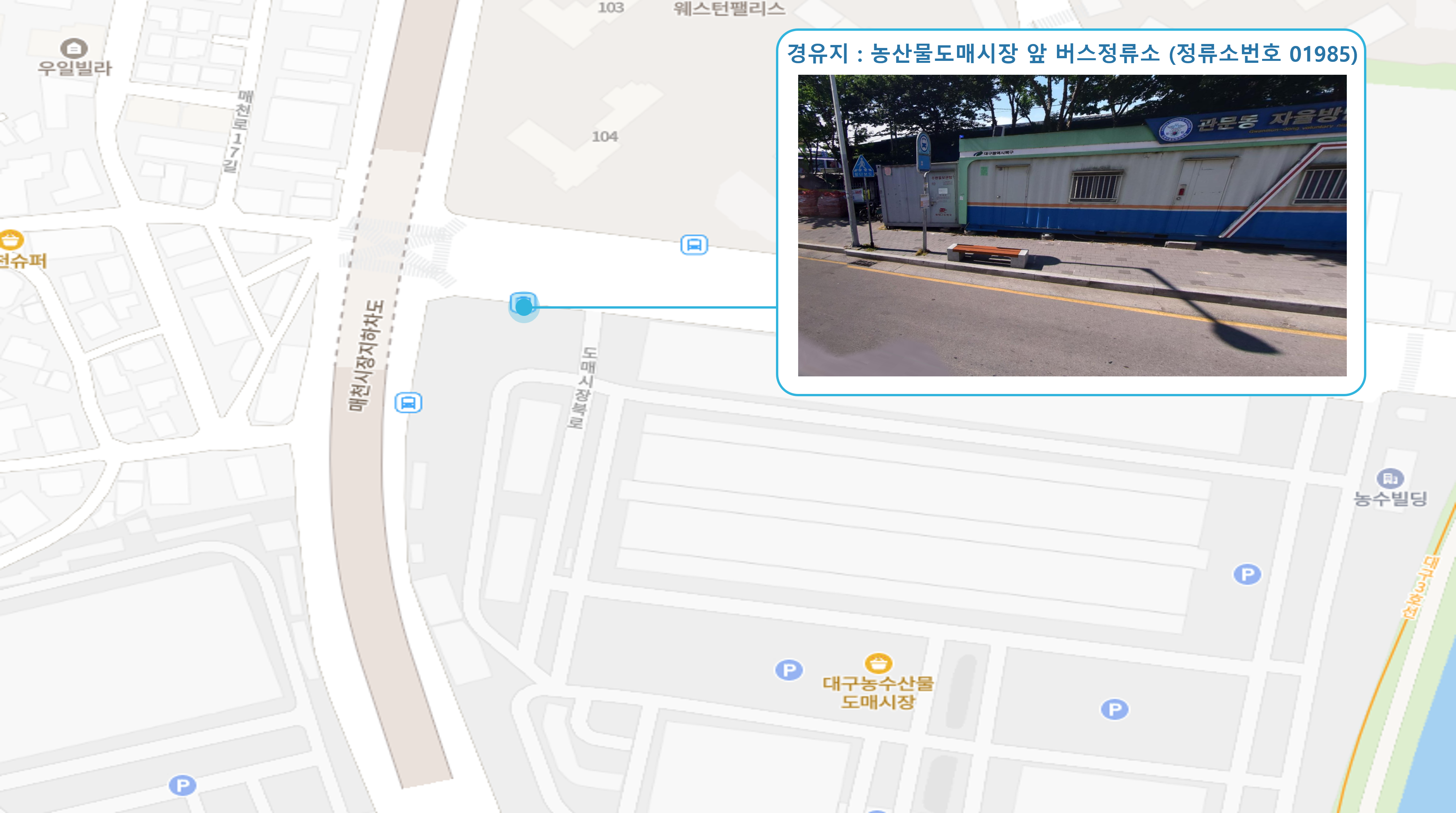 칠곡주공그린빌 1단지 건너 ↔ 팔거역 ↔ 코스모스한양아파트 ↔ 대구보건대학교4 버스정류소 ↔ 두성파크아파트 건너↔ 농산물도매시장 ↔ 만평역(서대구고속버스터미널) ↔ 대구학교지원센터 ↔ 신평리네거리2 버스정류소 ↔ 서대구1 Sub FC