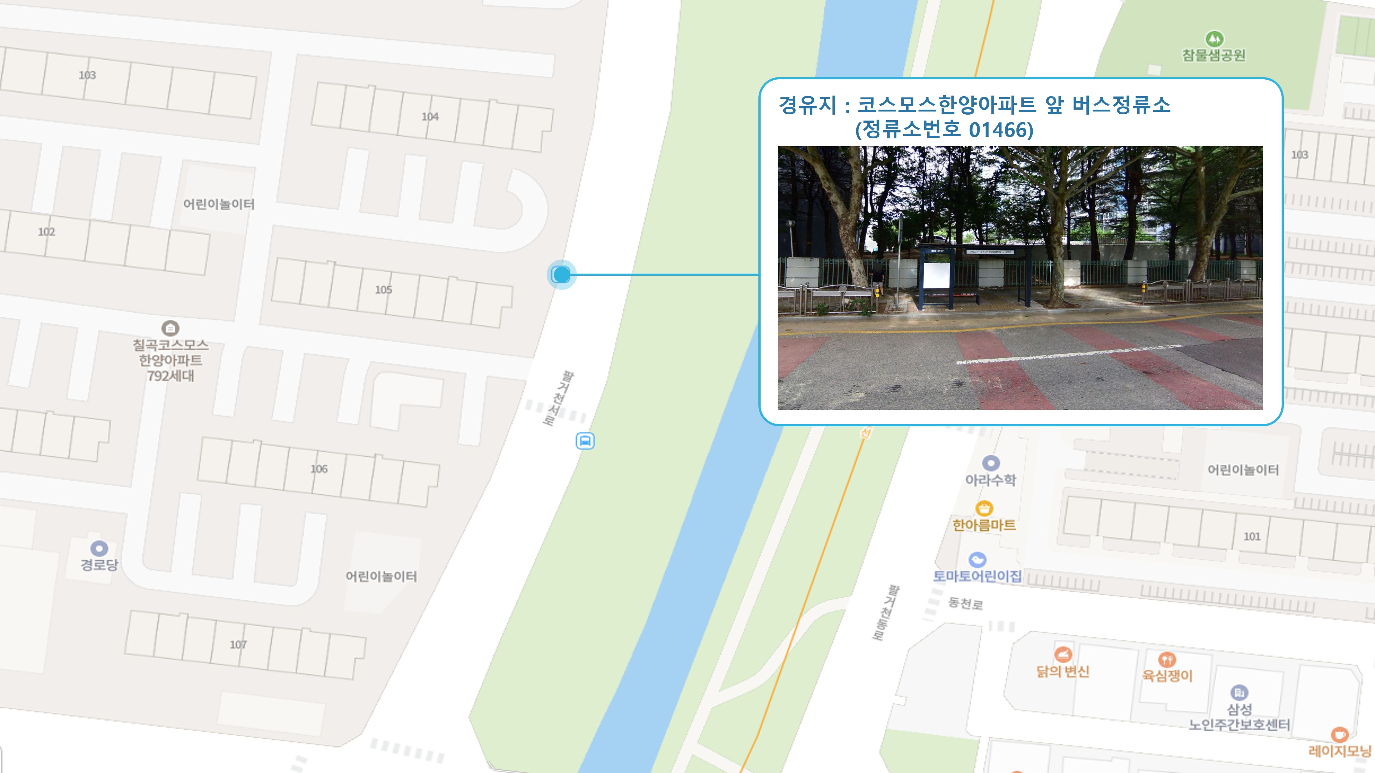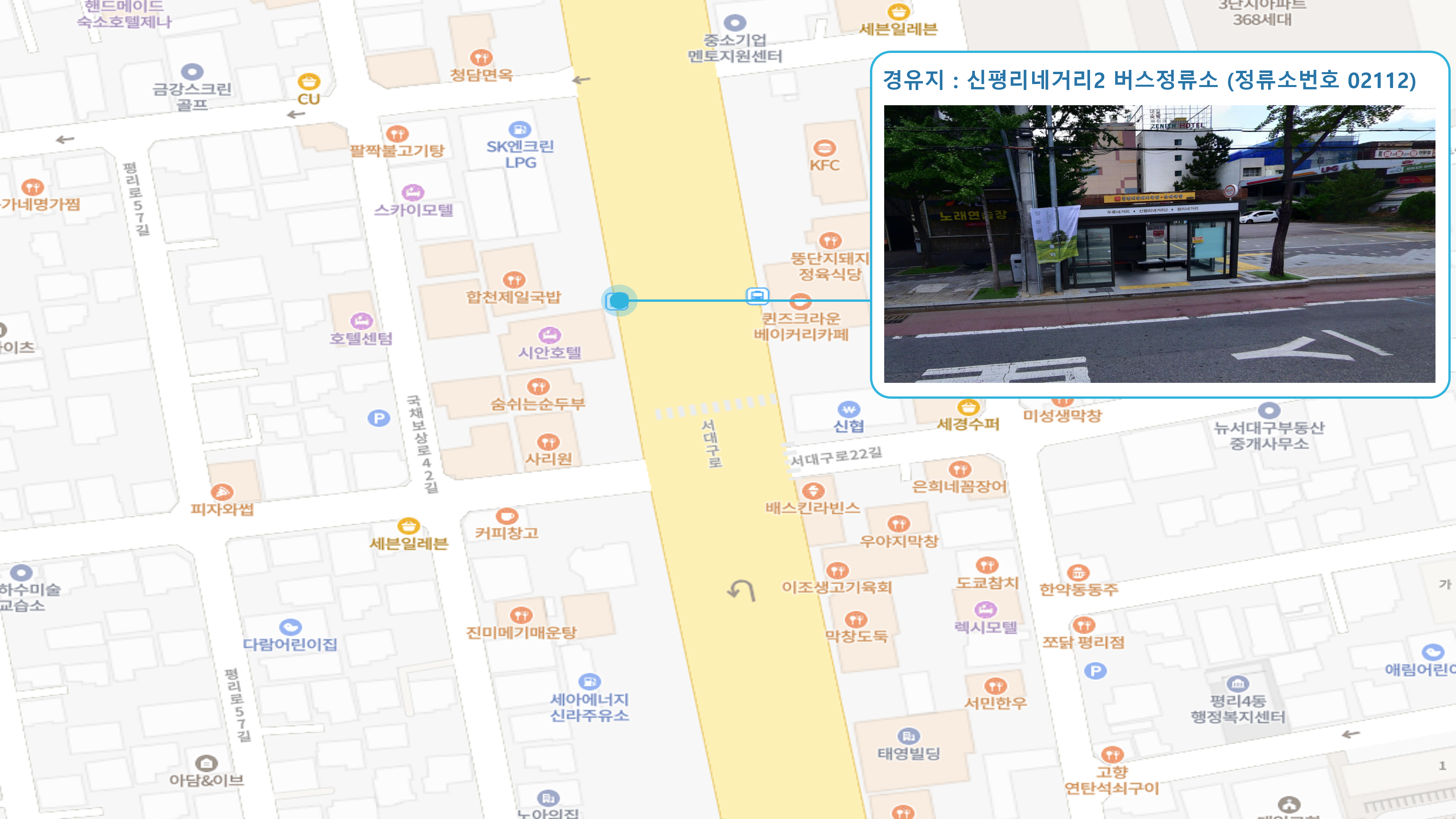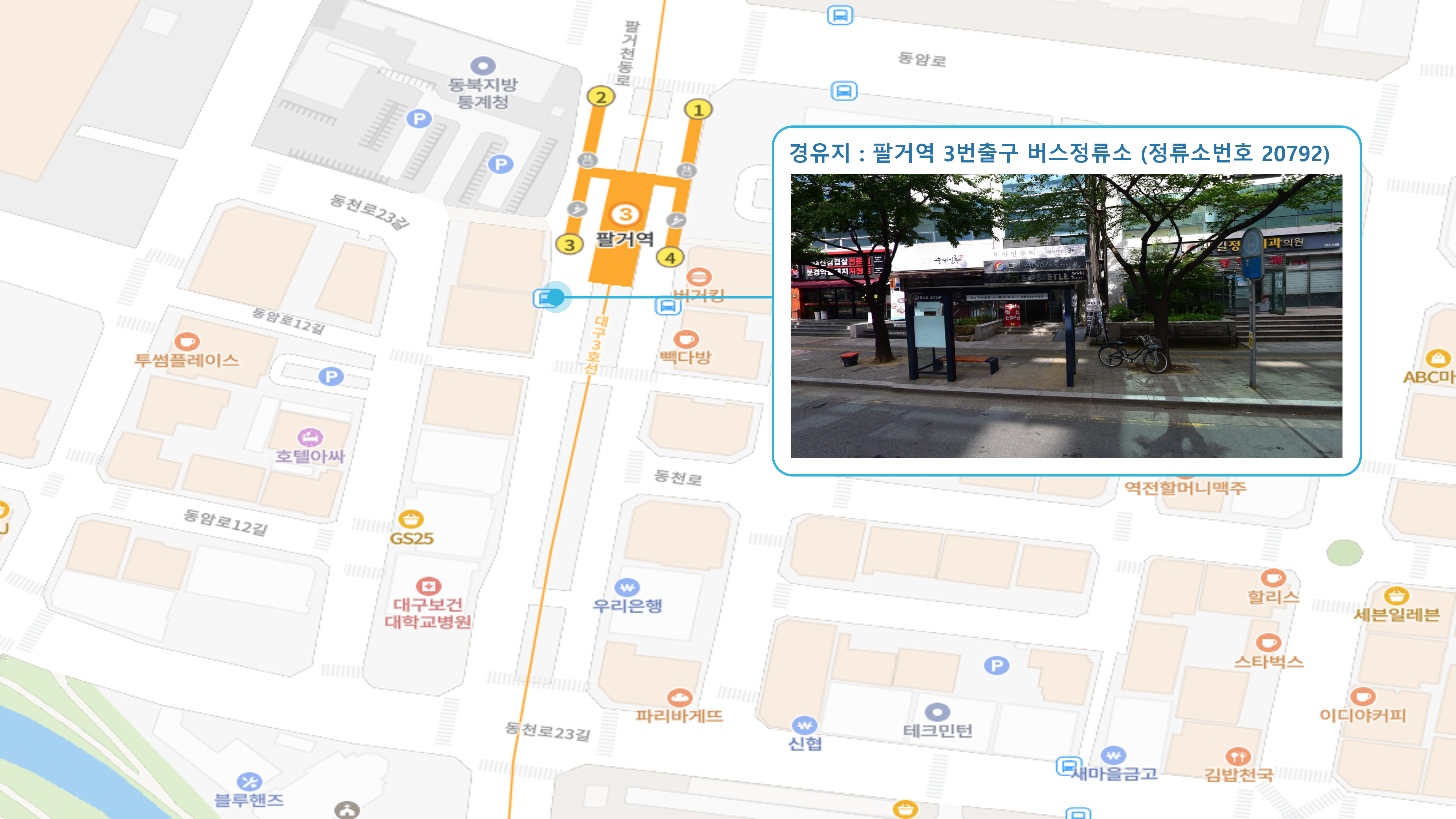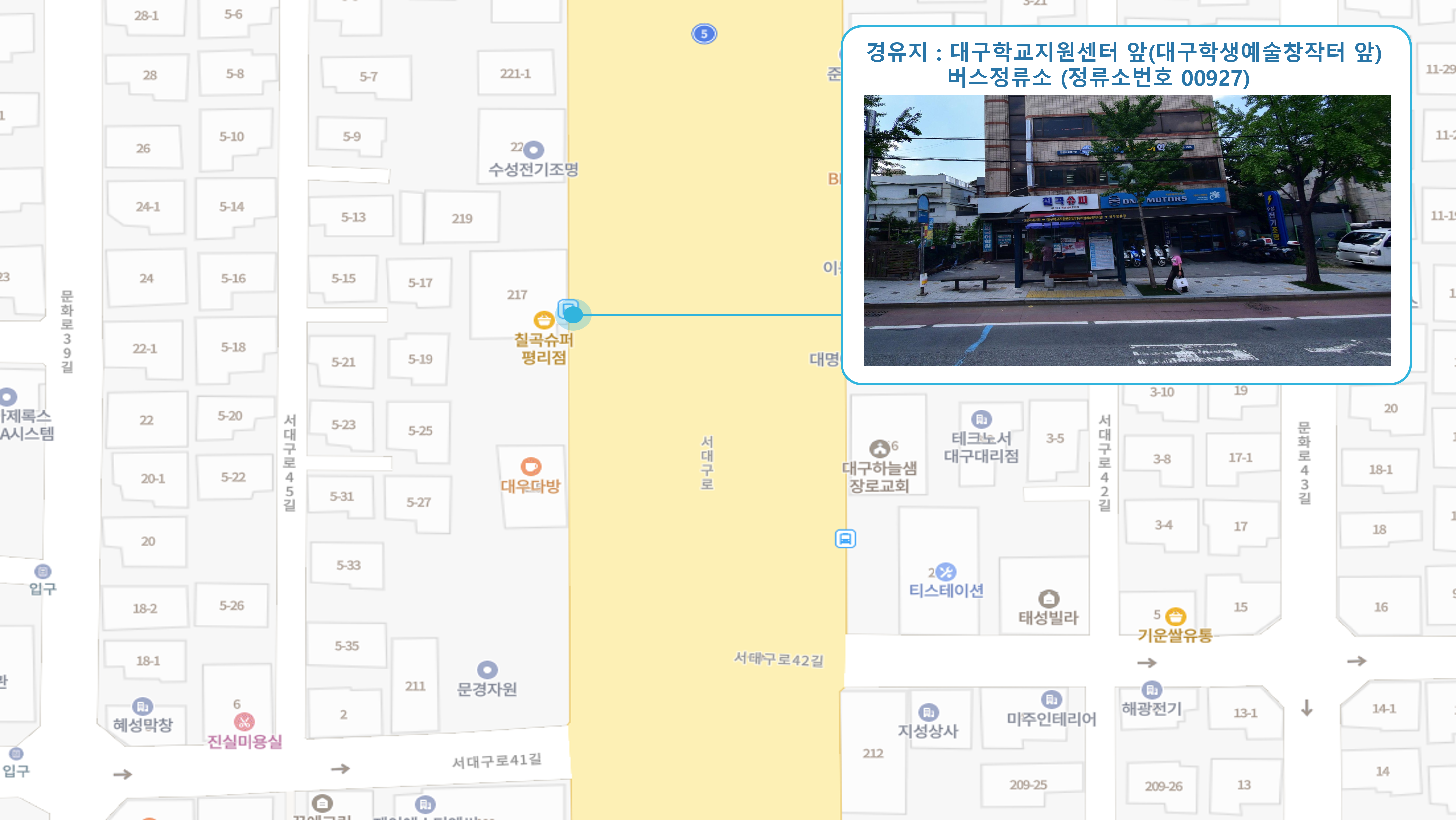 칠곡주공그린빌 1단지 건너 ↔ 팔거역 ↔ 코스모스한양아파트 ↔ 대구보건대학교4 버스정류소 ↔ 두성파크아파트 건너↔ 농산물도매시장 ↔ 만평역(서대구고속버스터미널) ↔ 대구학교지원센터 ↔ 신평리네거리2 버스정류소 ↔ 서대구1 Sub FC