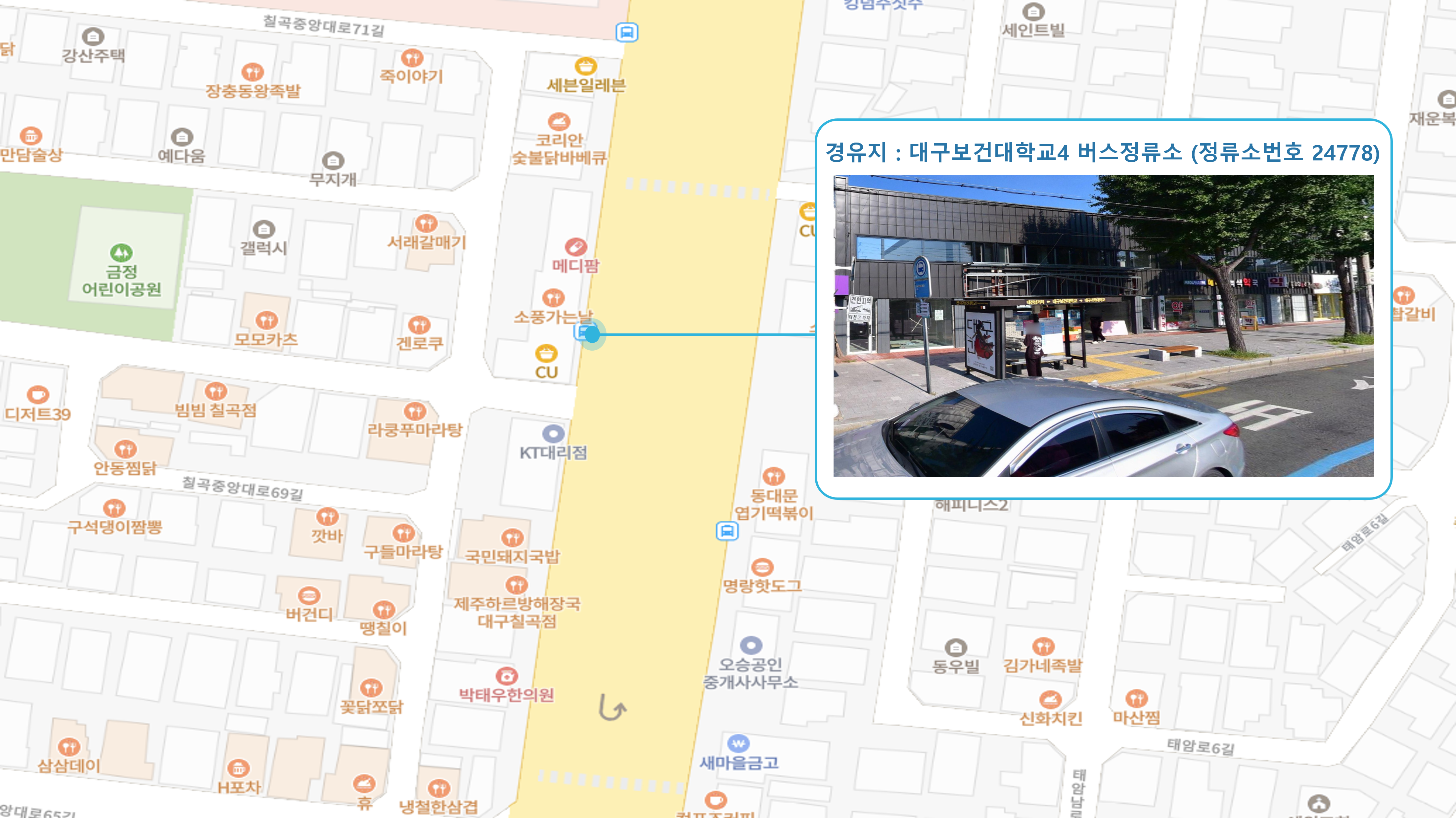 진척역2번출구 ↔ 성모여성의원 ↔ 월촌역6번출구 ↔ 서부정류장(관문시장앞) ↔ 남부초등학교 앞 2 정류소 ↔ 본리초등학교 ↔ 죽전네거리 2 정류소 ↔ 조달청 건너 정류소 ↔ 와룡시장 앞 정류소 ↔ 계명대학교 정문 앞 정류소 ↔ 메곡사거리 1 정류소 ↔ 서대구1 Sub FC