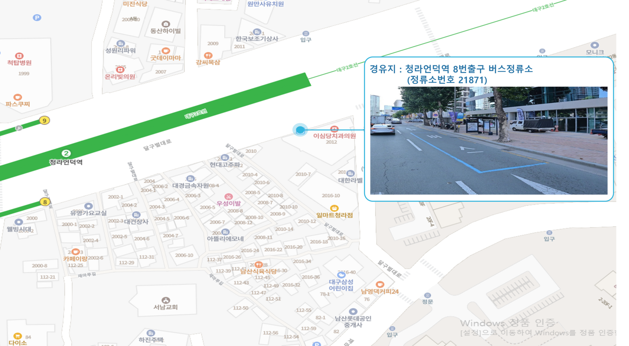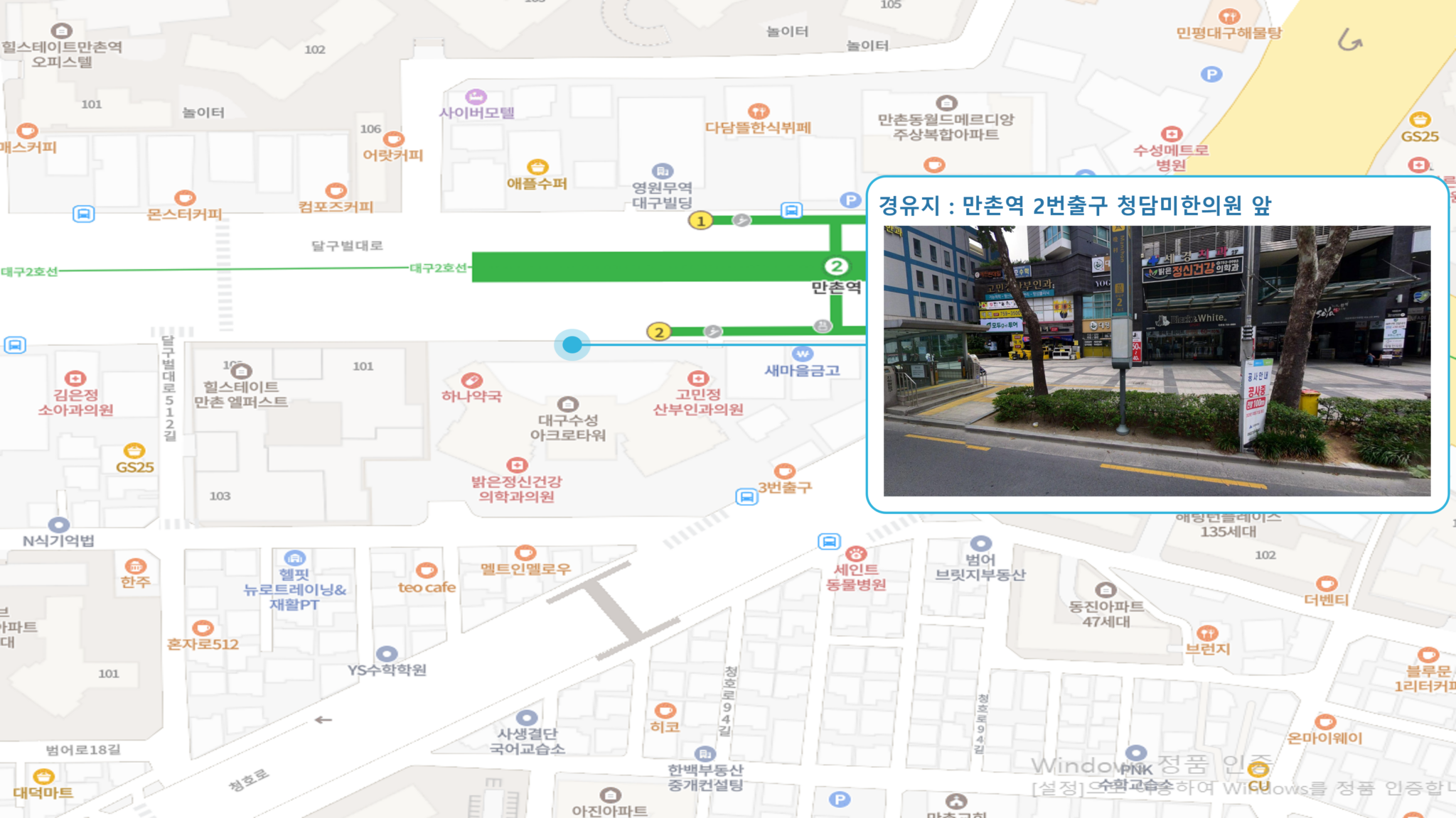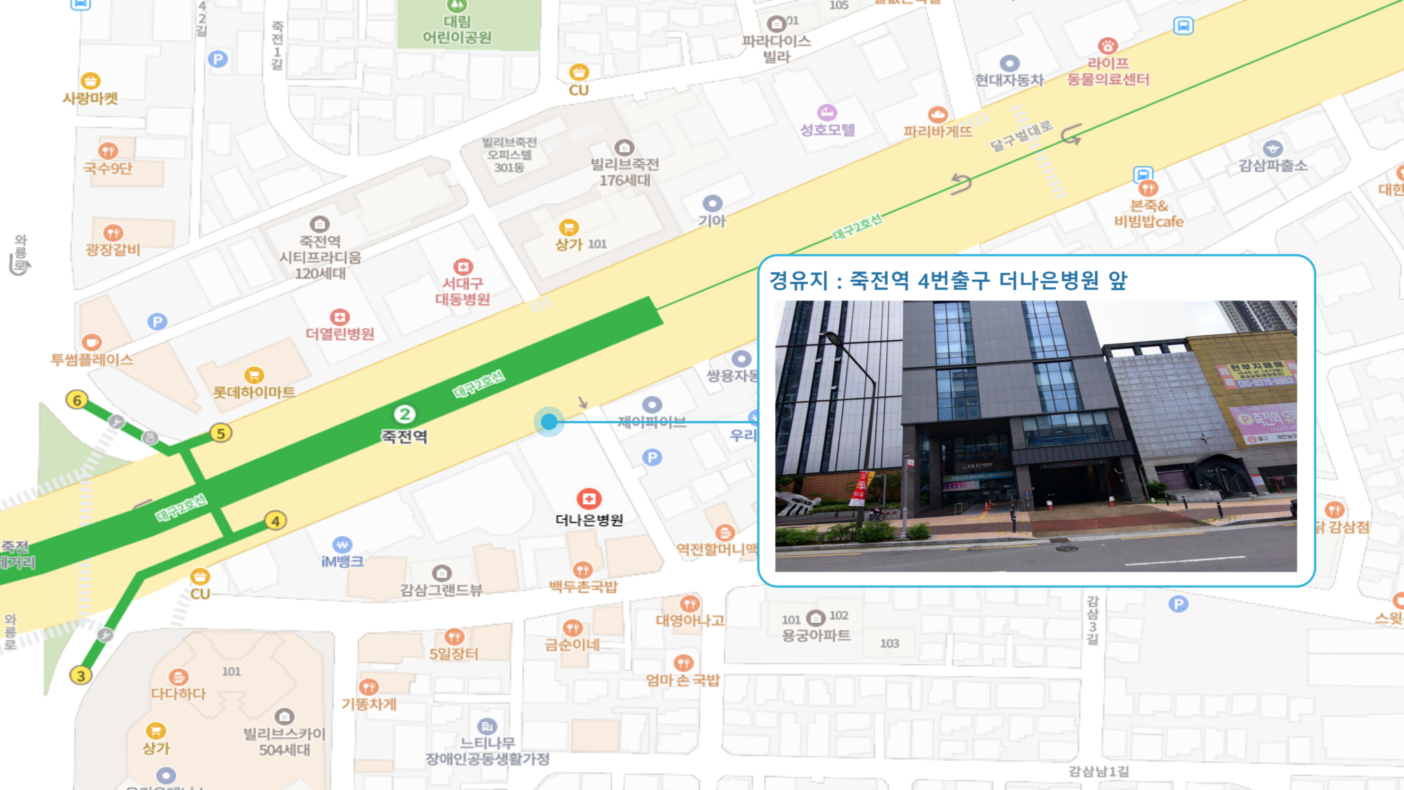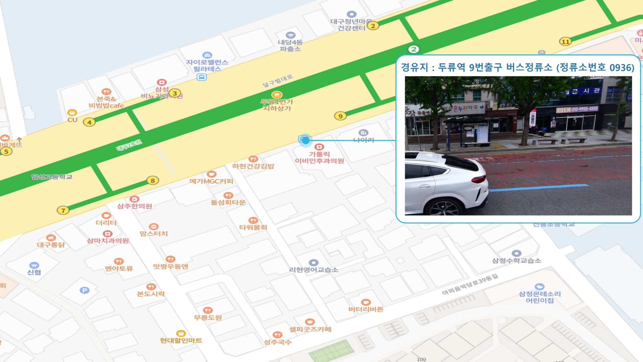 계명대역 ↔ 죽전역 ↔ 두류역 ↔ 반고개역 ↔ 청라언덕역 ↔ 반월당역 ↔ 경대병원역 ↔ 대구은행역 ↔ 범어역 ↔ 수성구청역 ↔ 만촌역 ↔ 동대구1 Sub-hub