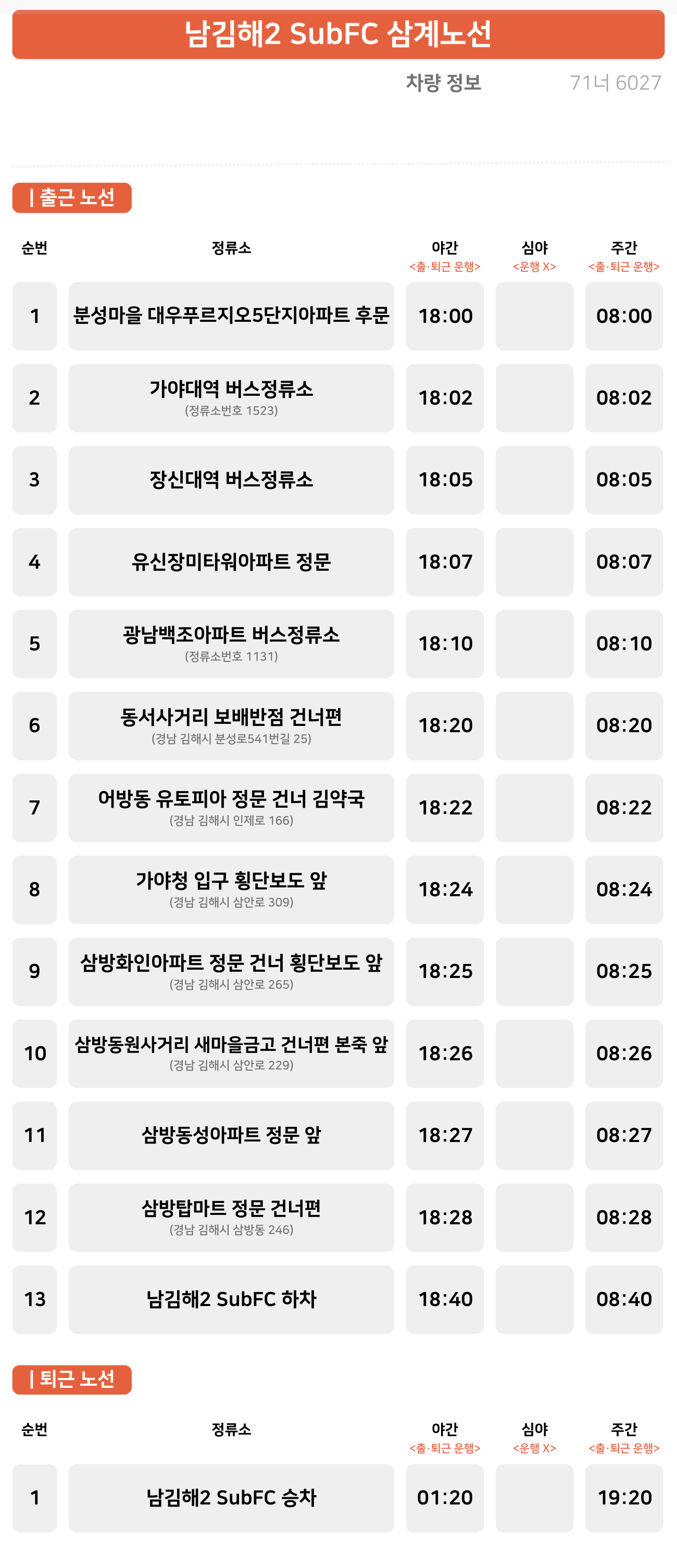 삼계푸르지오1차 후문 입구 앞 ↔ 가야대역 버스정류소 ↔ 장신대역 버스정류소 ↔ 구산장미아파트 정문 앞 ↔ 구산백조 정문 버스정류소 ↔ 동서사거리 보배반점 건너편 ↔ 어방동 유토피아 정문 건너 김약국 ↔ 가야청 입구 횡단보도 앞 ↔ 삼방화인아파트 정문 건너 횡단보도 앞 ↔ 삼방동원사거리 새마을 금고 건너편 본죽 앞 ↔ 삼방동성아파트 정문 앞 ↔ 삼방탑마트 정문 건너편 ↔ 남김해2 FC