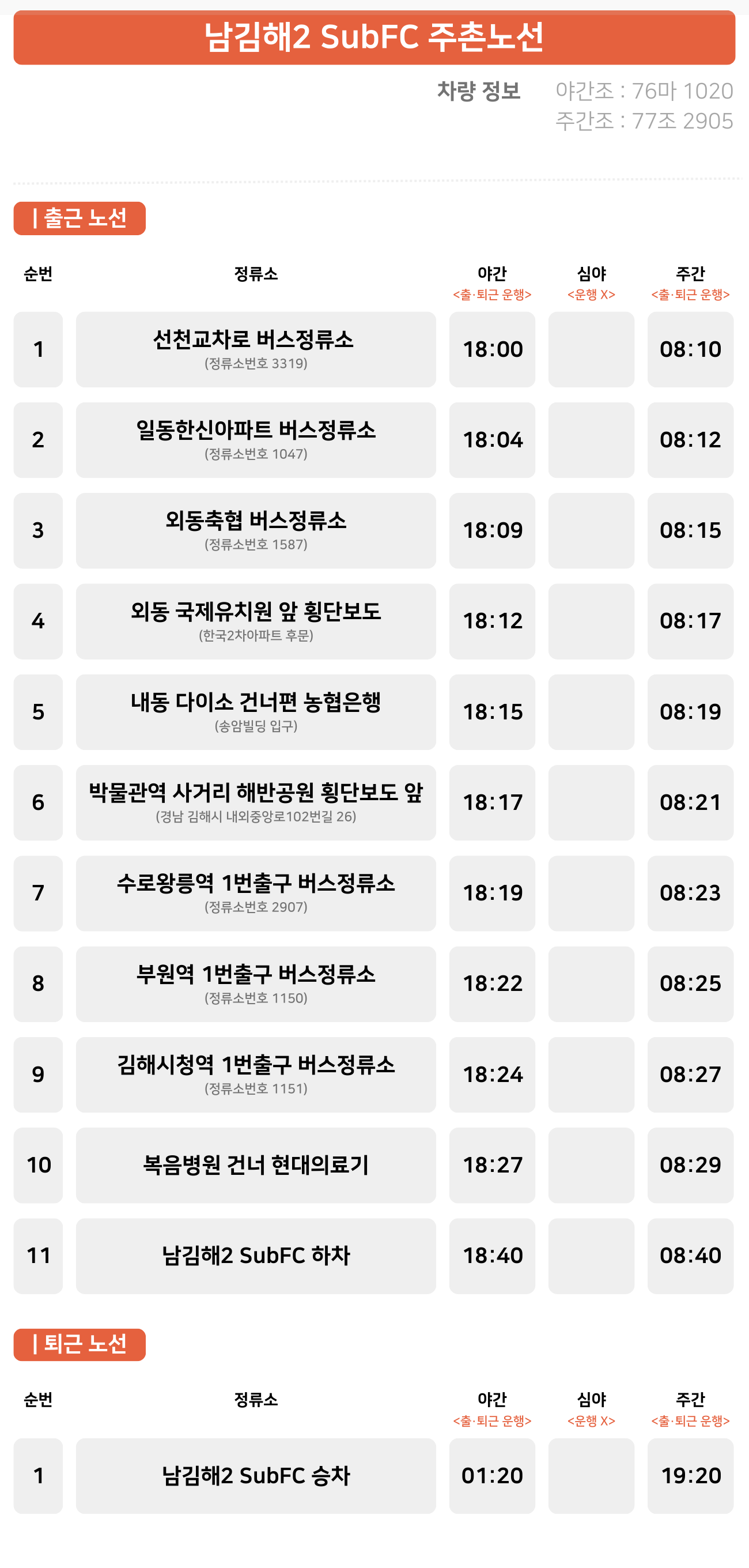 주촌 코스트코쪽 선천교차로 ↔ 일동한신아파트 정문쪽 ↔ 외동축협 주차장 입구 ↔ 외동 국제유치원 앞 횡단보도 ↔ 내동 다이소 건너편 농협은행 앞 ↔ 박물관역 사거리 해반공원 횡단보도 앞 ↔ 수로왕등역 1번출구(김해보건소 방향) ↔ 부원역 1번출구 육교밑 ↔ 김해시청역 1번출구 육교밑 ↔ 복음병원 정문 건너 현대의료기 앞 ↔ 남김해2FC