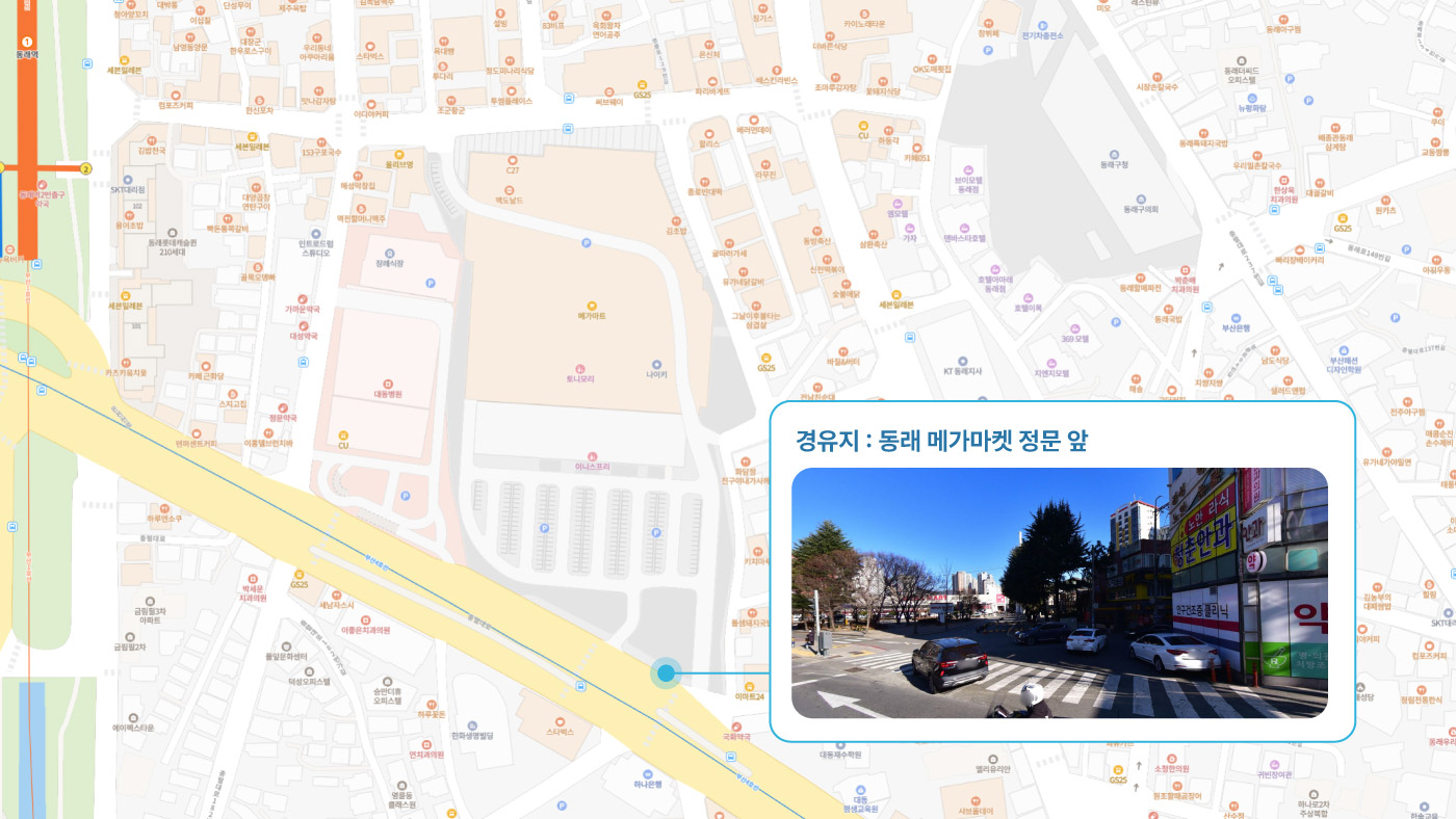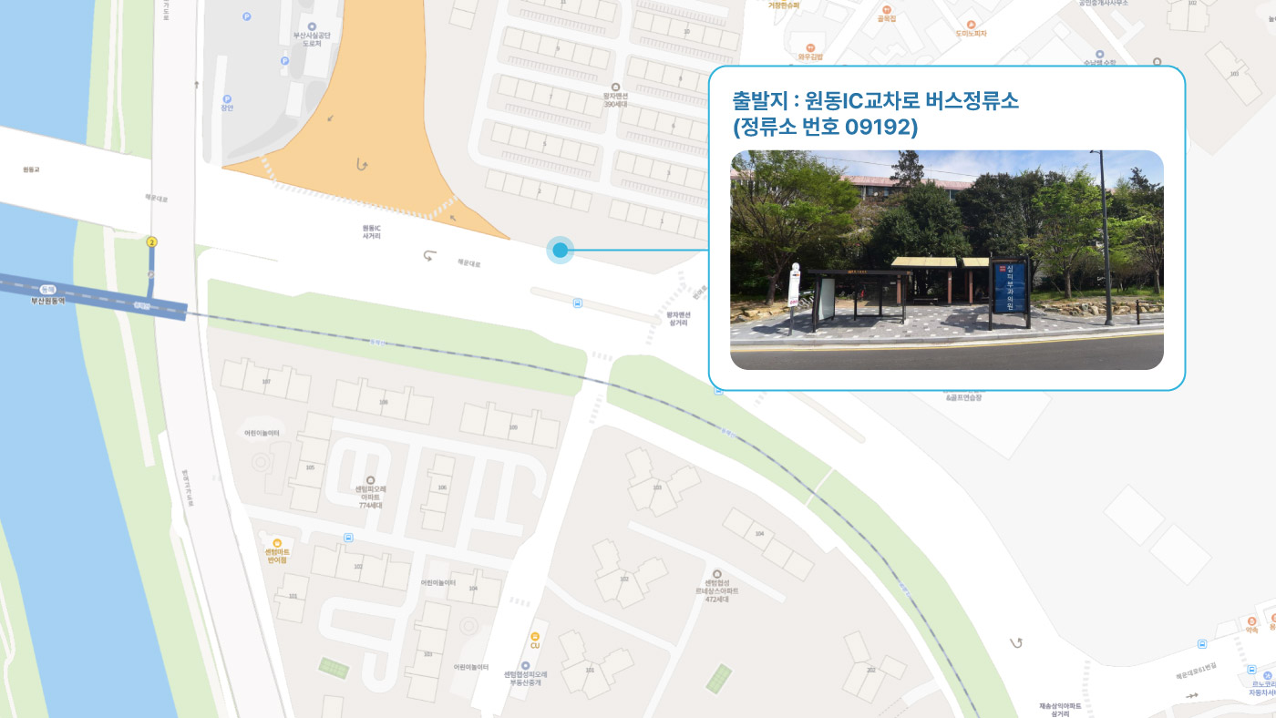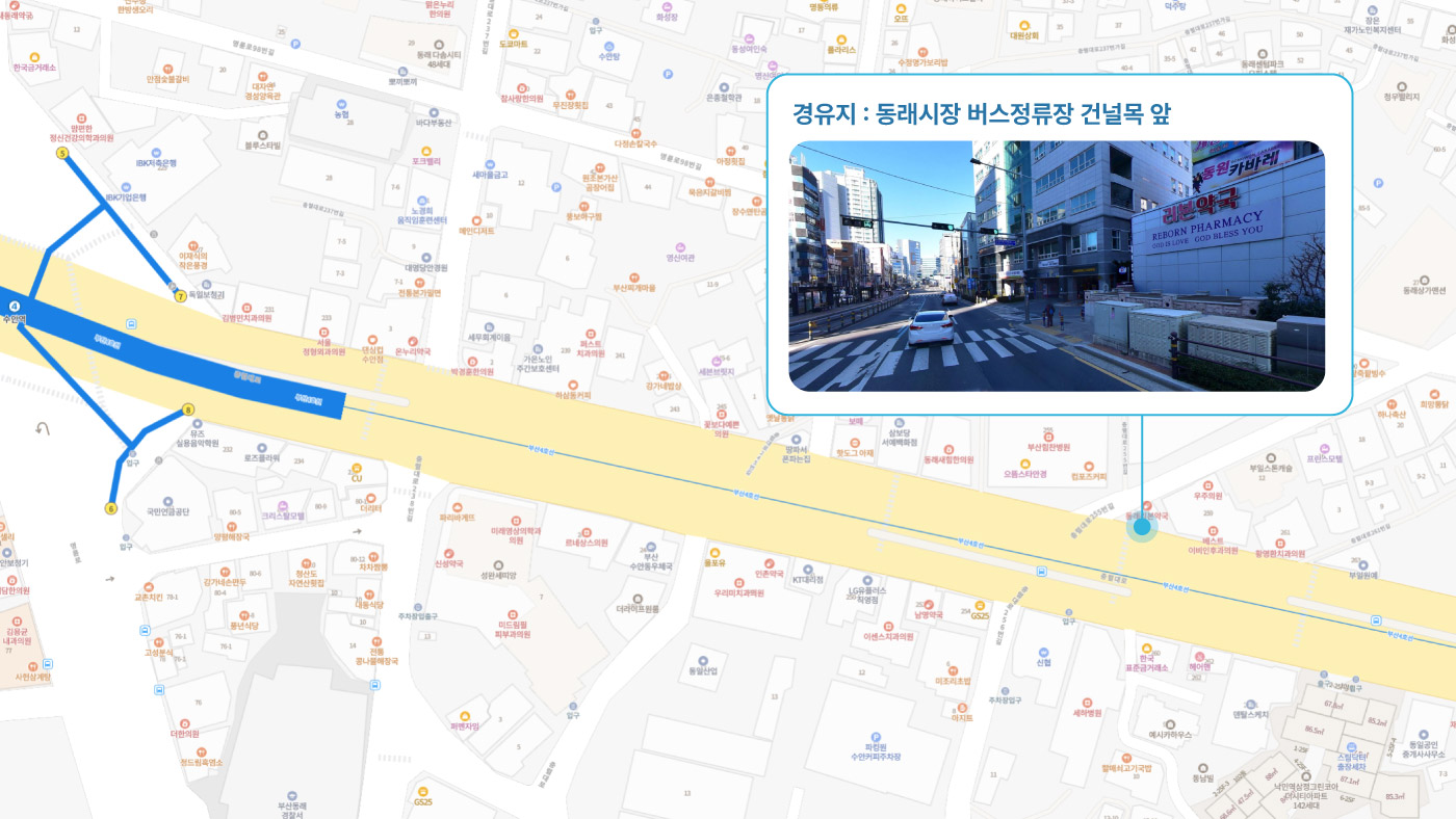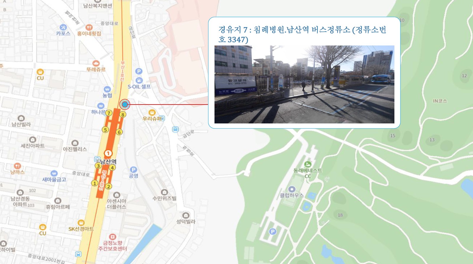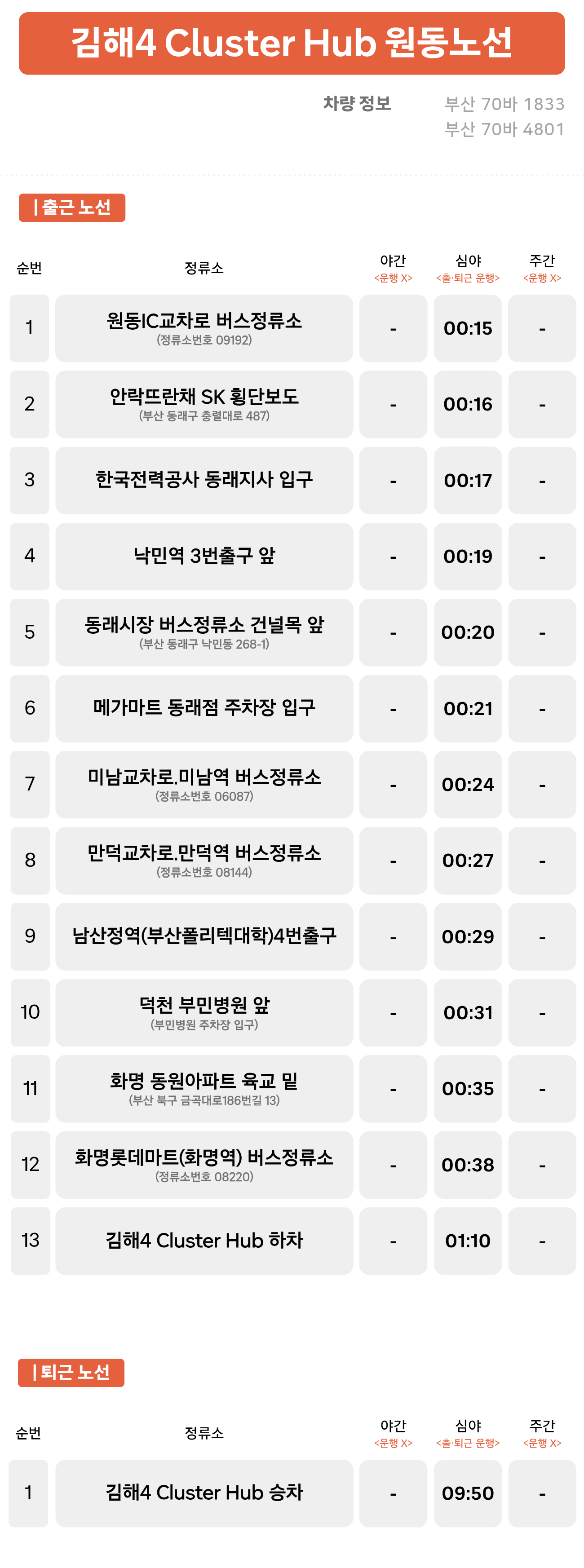 원동IC교차로 ↔ 안락뜨란채 SK ↔ 한국전력공사 동래지사 ↔ 낙민역 3번출구 ↔ 동래시장 버스정류소 건널목 ↔ 메가마트 동래점 ↔ 미남교차로.미남역 ↔ 만덕교차로.만덕역 ↔ 남산정역(부산폴리텍대학) 4번출구 ↔ 덕천 부민병원 ↔ 화명 동원아파트 육교 ↔ 화명롯데마트(화명역) ↔ 김해4 Cluster Hub