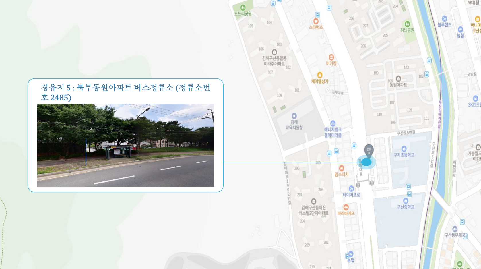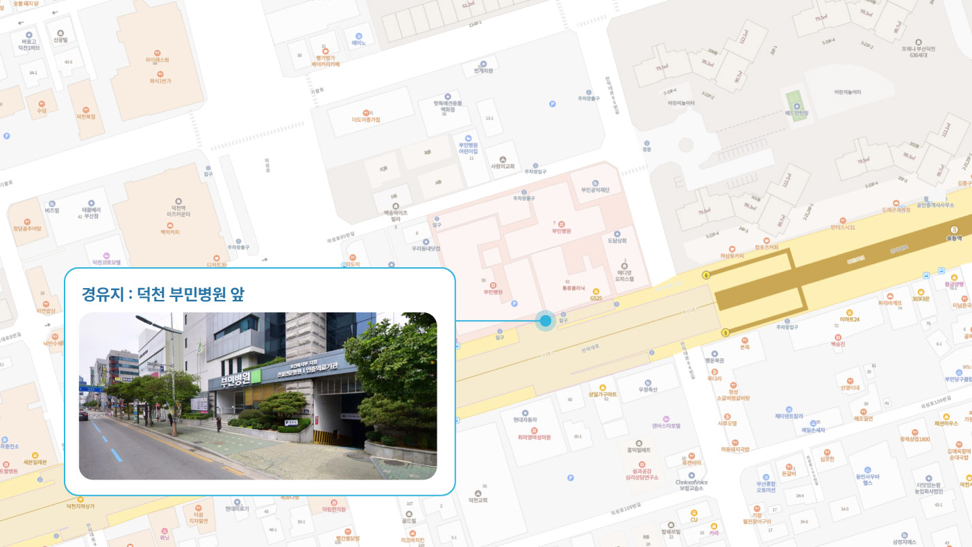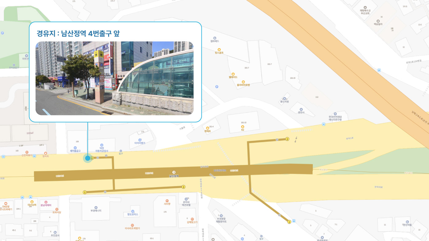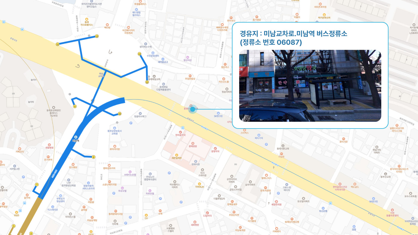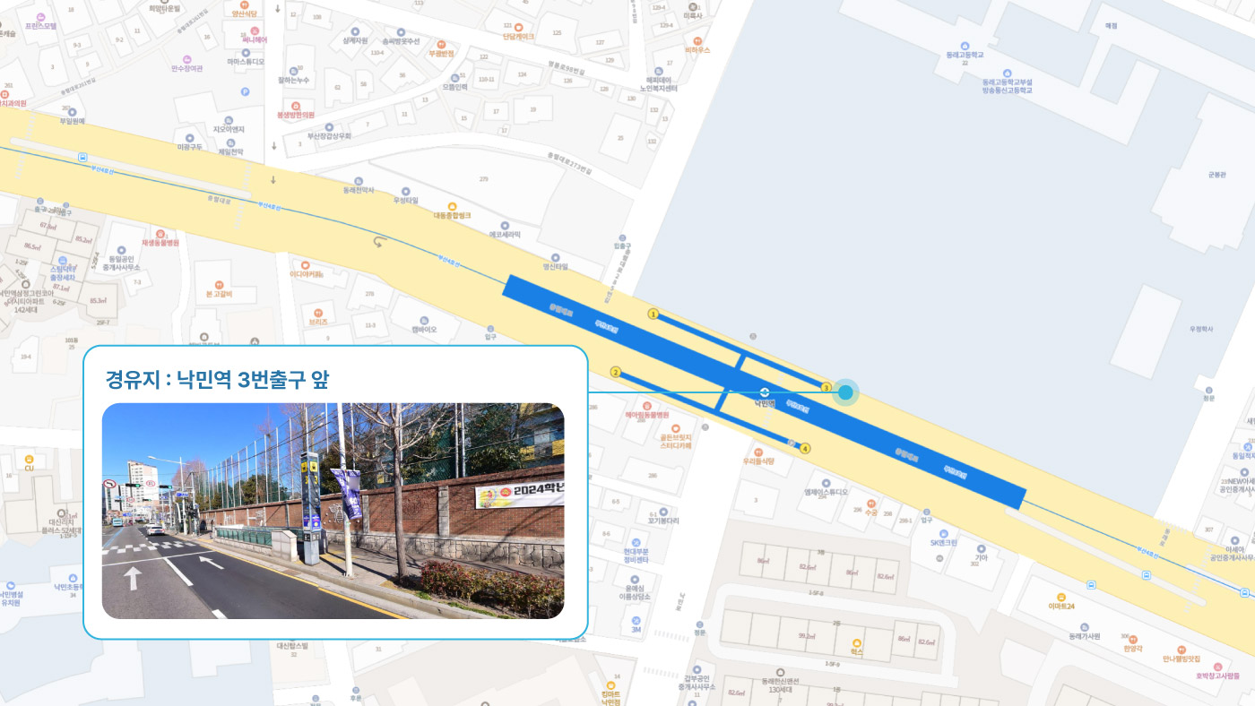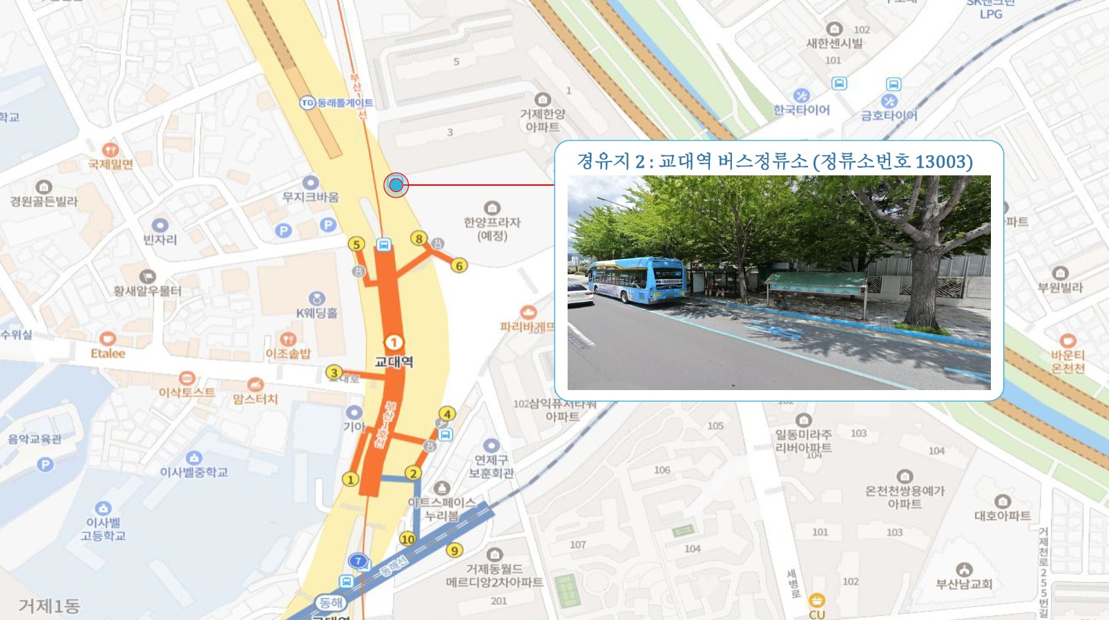 원동IC교차로 ↔ 안락뜨란채 SK ↔ 한국전력공사 동래지사 ↔ 낙민역 3번출구 ↔ 동래시장 버스정류소 건널목 ↔ 메가마트 동래점 ↔ 미남교차로.미남역 ↔ 만덕교차로.만덕역 ↔ 남산정역(부산폴리텍대학) 4번출구 ↔ 덕천 부민병원 ↔ 화명 동원아파트 육교 ↔ 화명롯데마트(화명역) ↔ 김해4 Cluster Hub