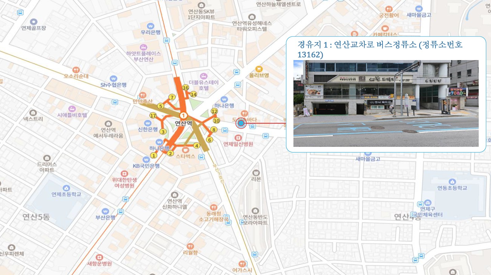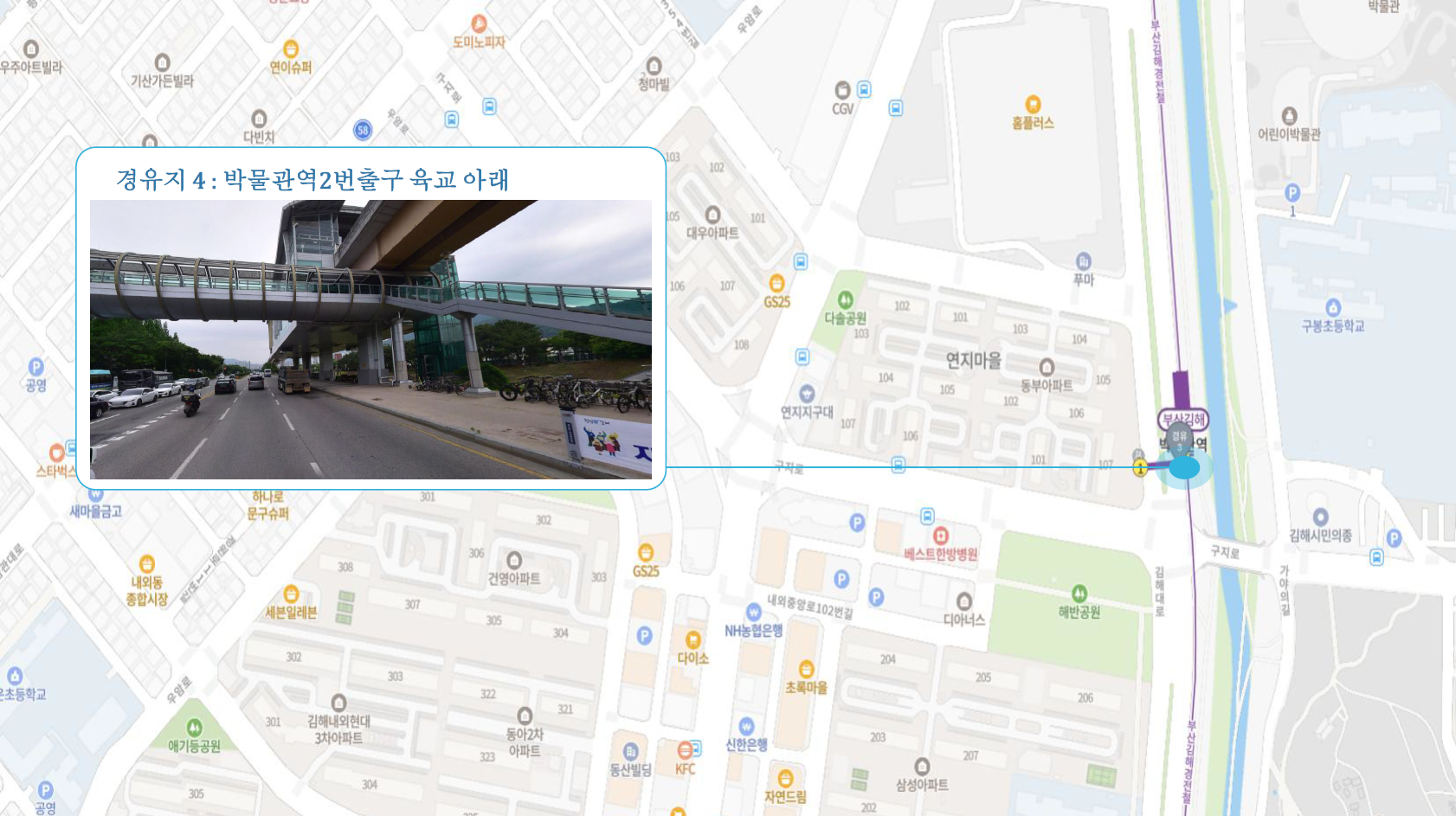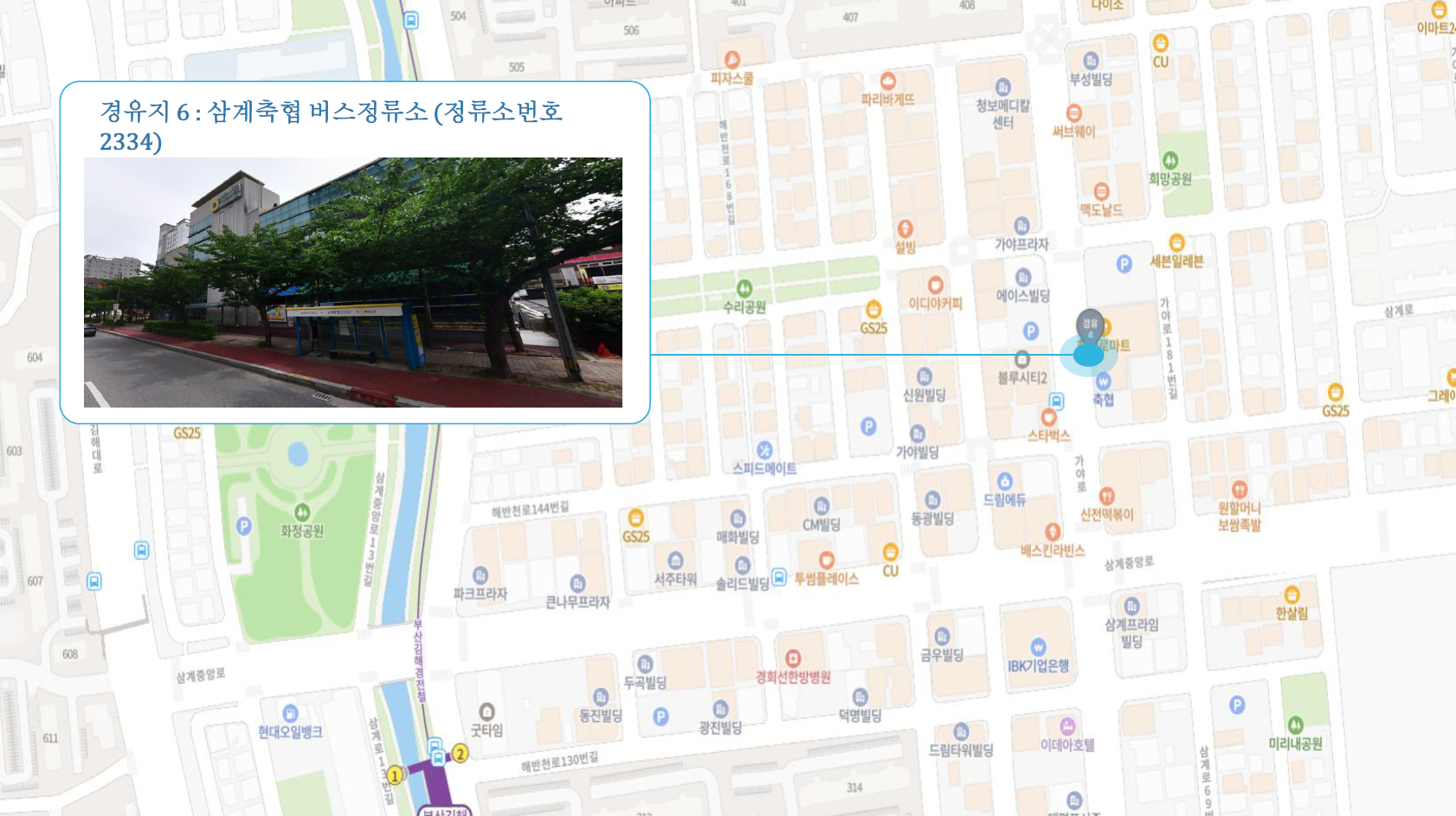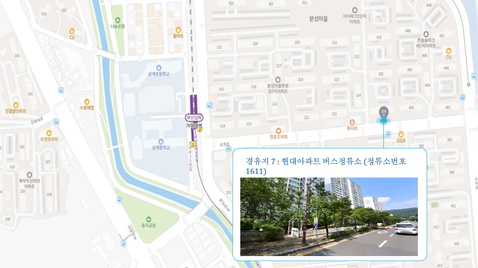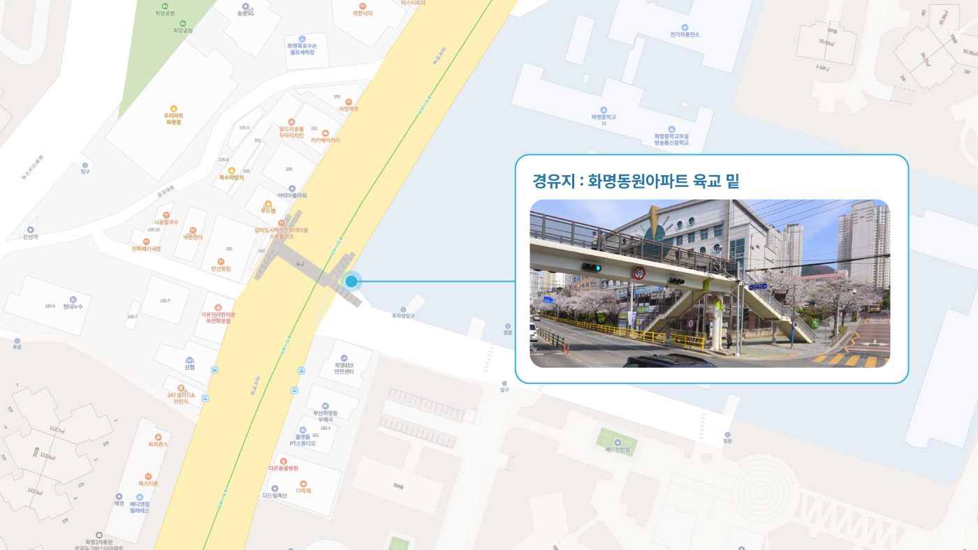원동IC교차로 ↔ 안락뜨란채 SK ↔ 한국전력공사 동래지사 ↔ 낙민역 3번출구 ↔ 동래시장 버스정류소 건널목 ↔ 메가마트 동래점 ↔ 미남교차로.미남역 ↔ 만덕교차로.만덕역 ↔ 남산정역(부산폴리텍대학) 4번출구 ↔ 덕천 부민병원 ↔ 화명 동원아파트 육교 ↔ 화명롯데마트(화명역) ↔ 김해4 Cluster Hub