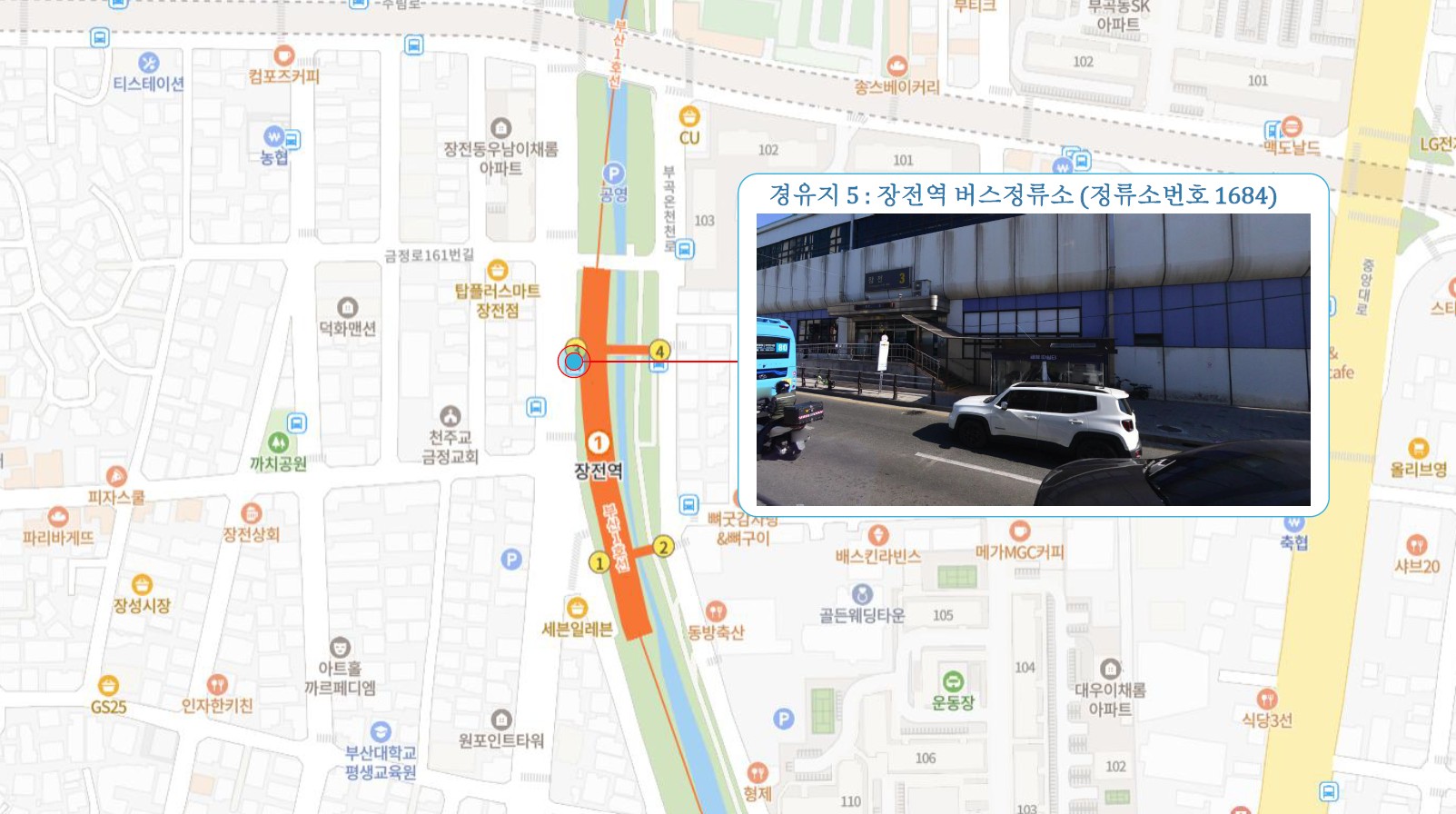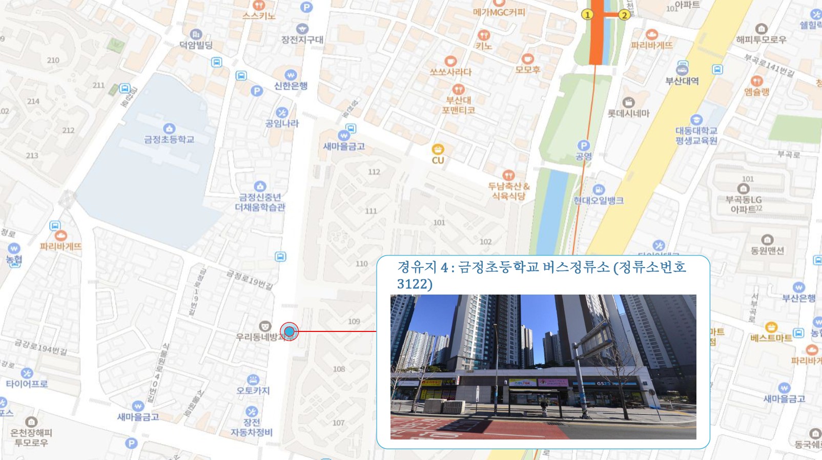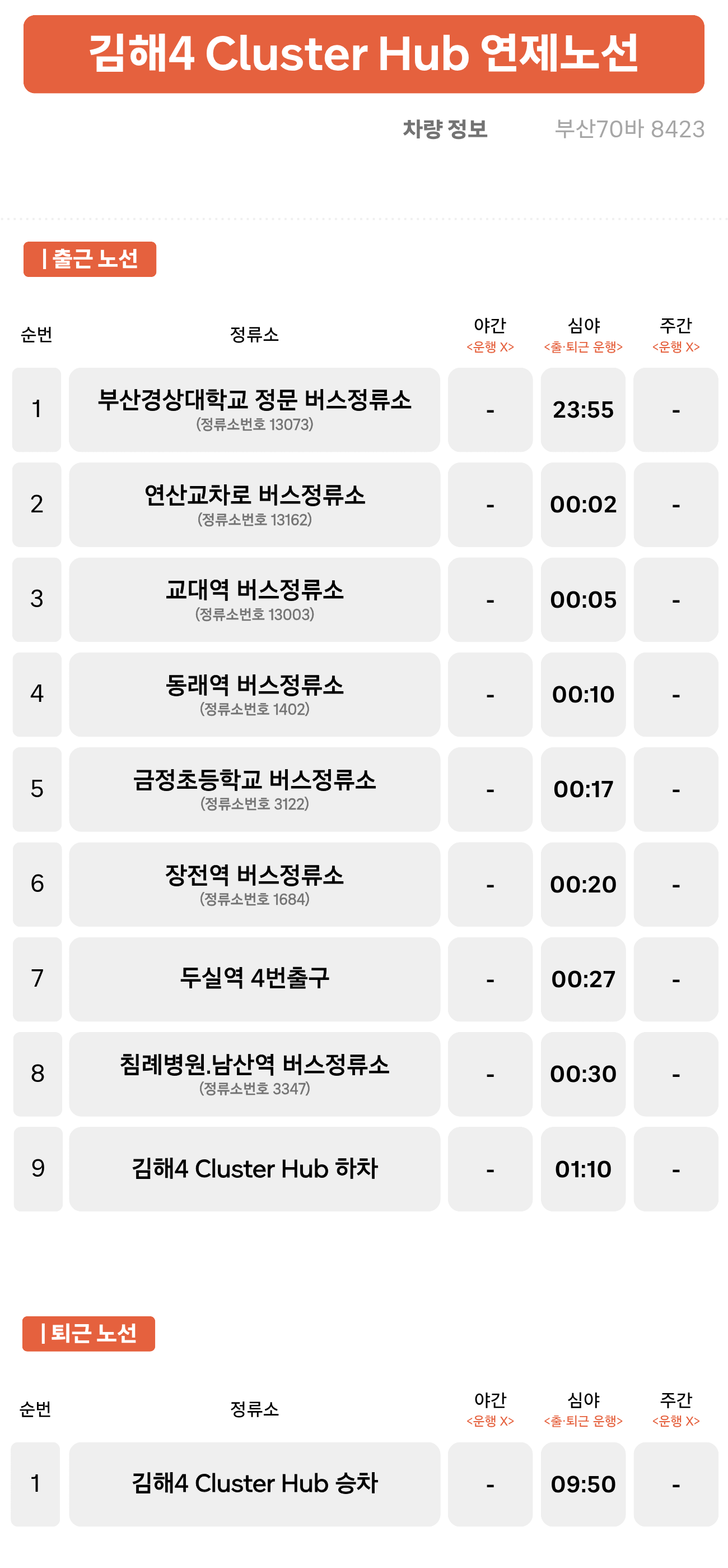 부산경상대학교 ↔ 연산교차로 ↔ 교대역 ↔ 동래역 ↔ 금정초등학교 ↔ 장전역 ↔ 두실역 ↔ 침례병원.남산역 ↔ 김해4 Cluster Hub