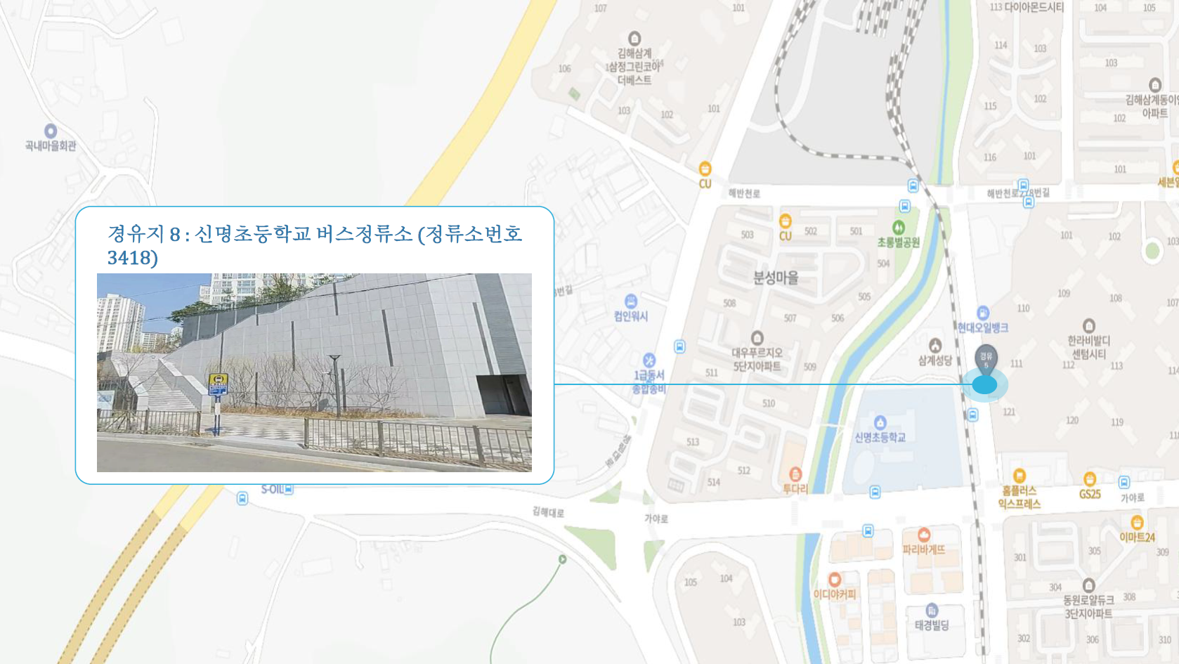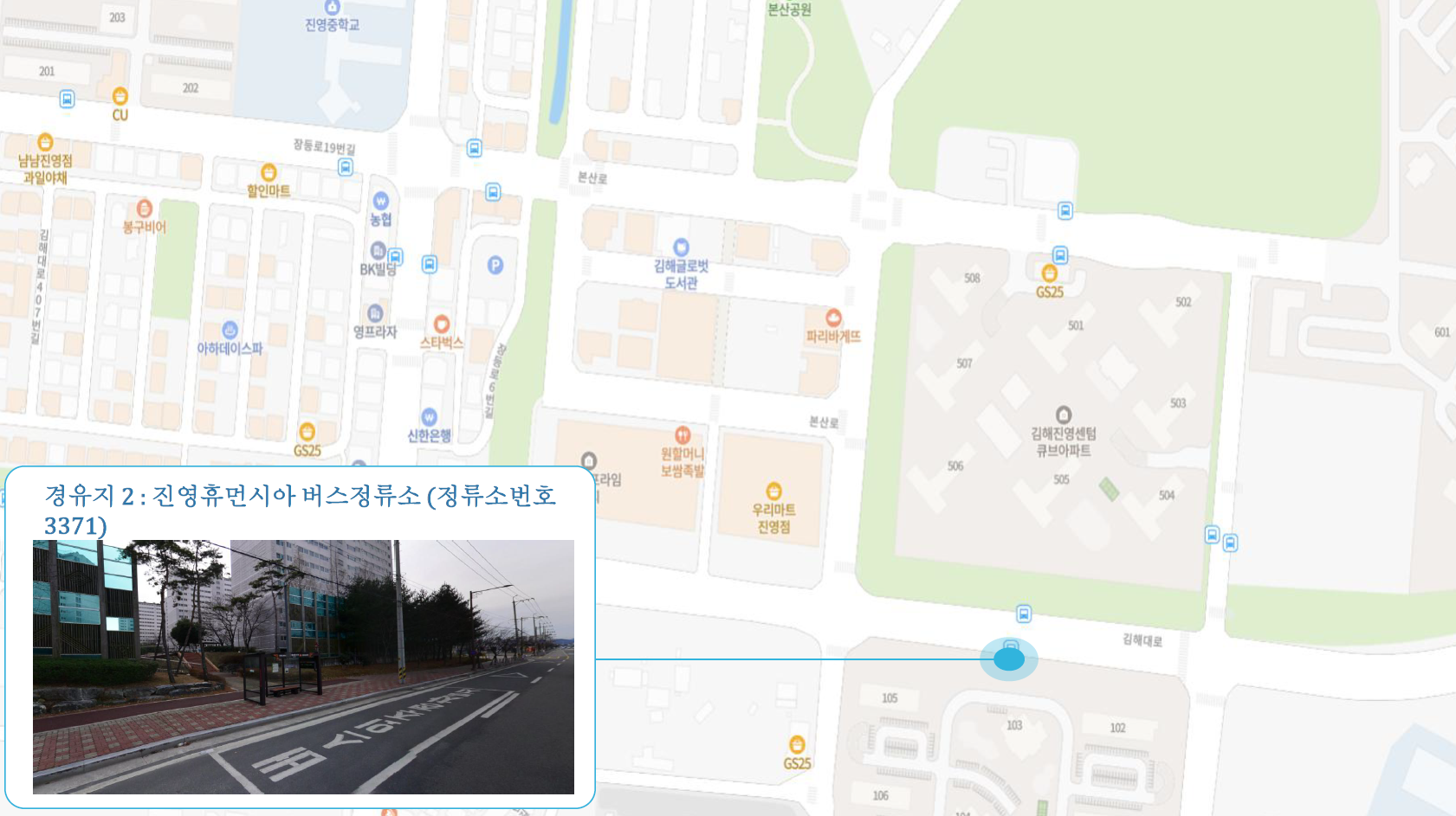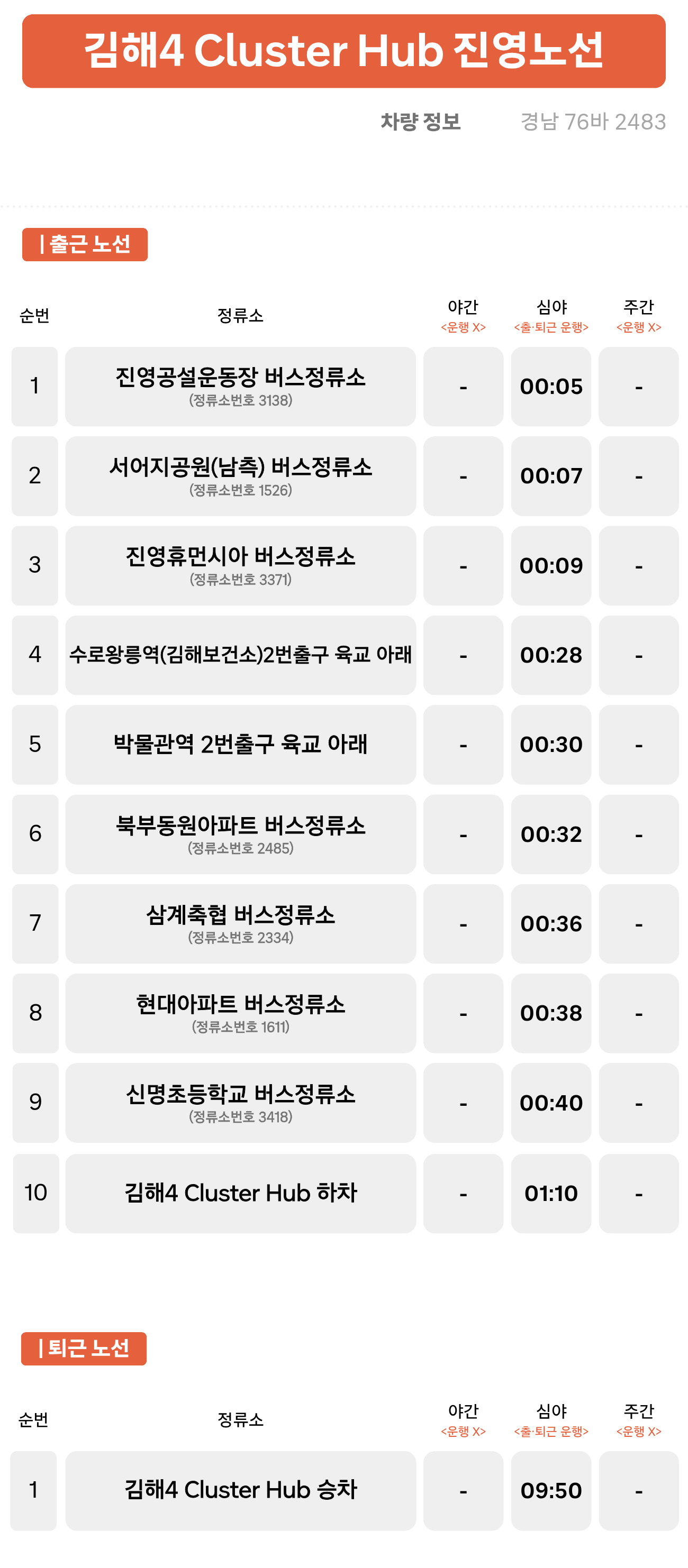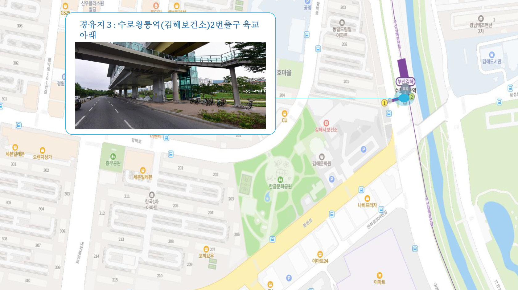 진영공설운동장 ↔ 서어지공원(남측) ↔ 진영휴먼시아 ↔ 수로왕릉역 2번출구 ↔ 박물관역 2번출구 ↔ 북부동원아파트 ↔ 삼계축협 ↔ 삼계현대아파트 ↔ 신명초등학교 ↔ 김해4 Cluster Hub