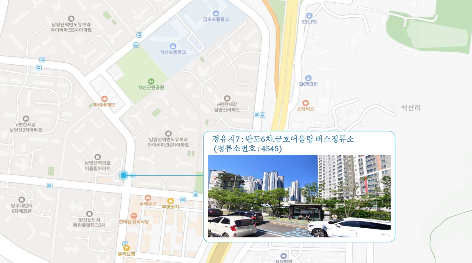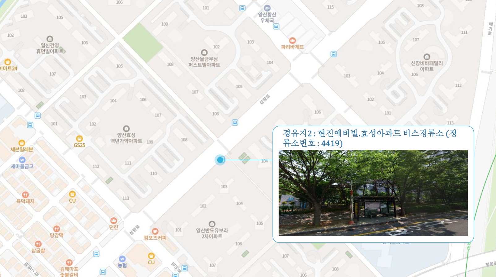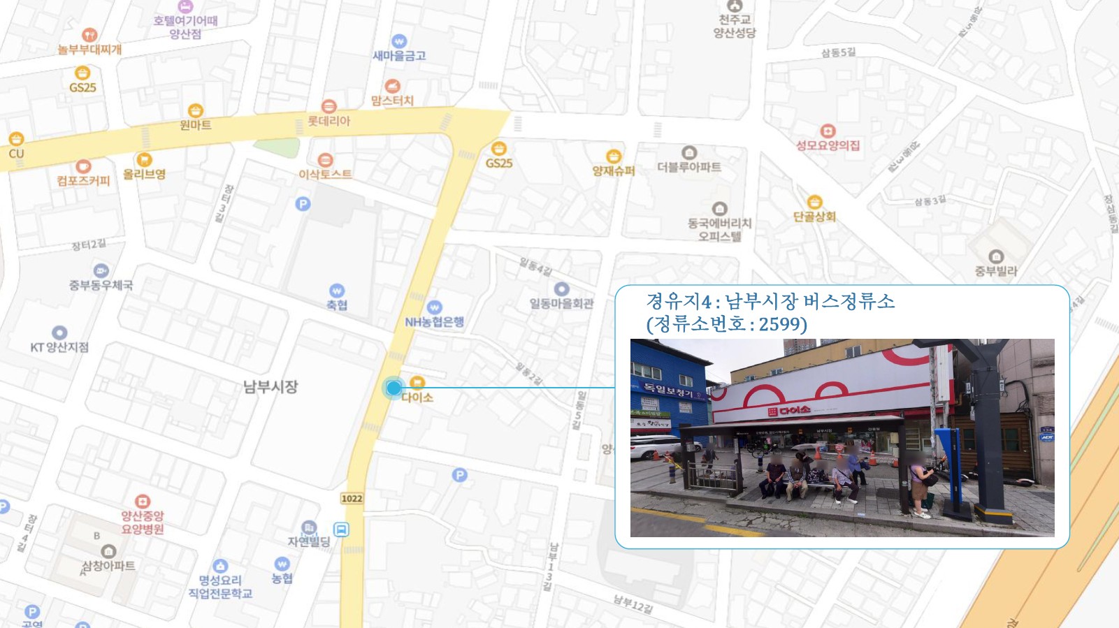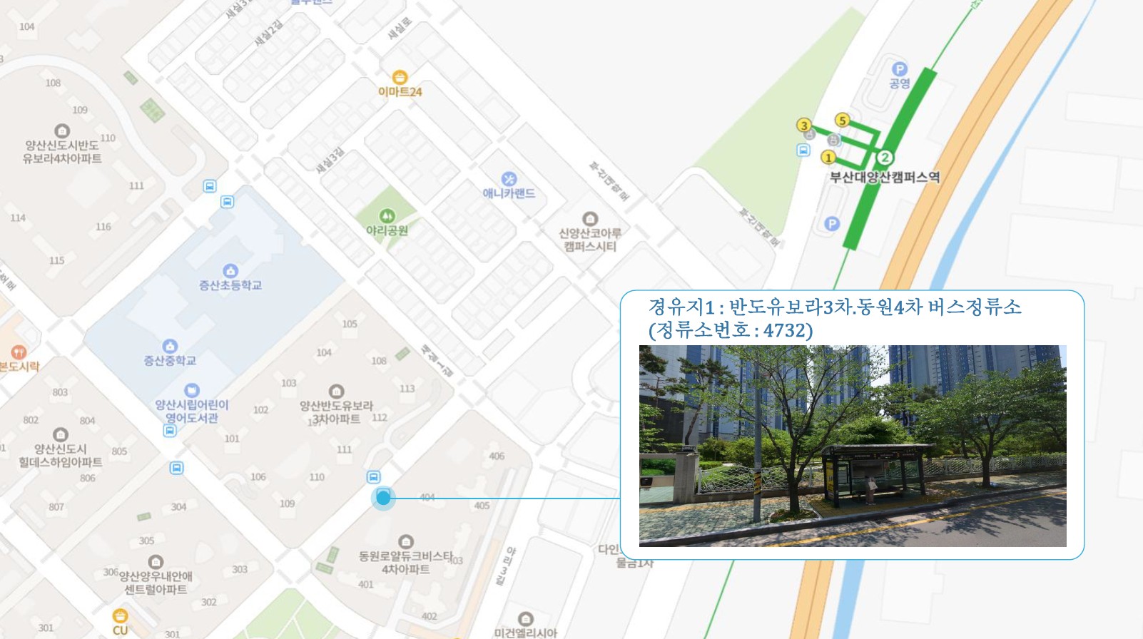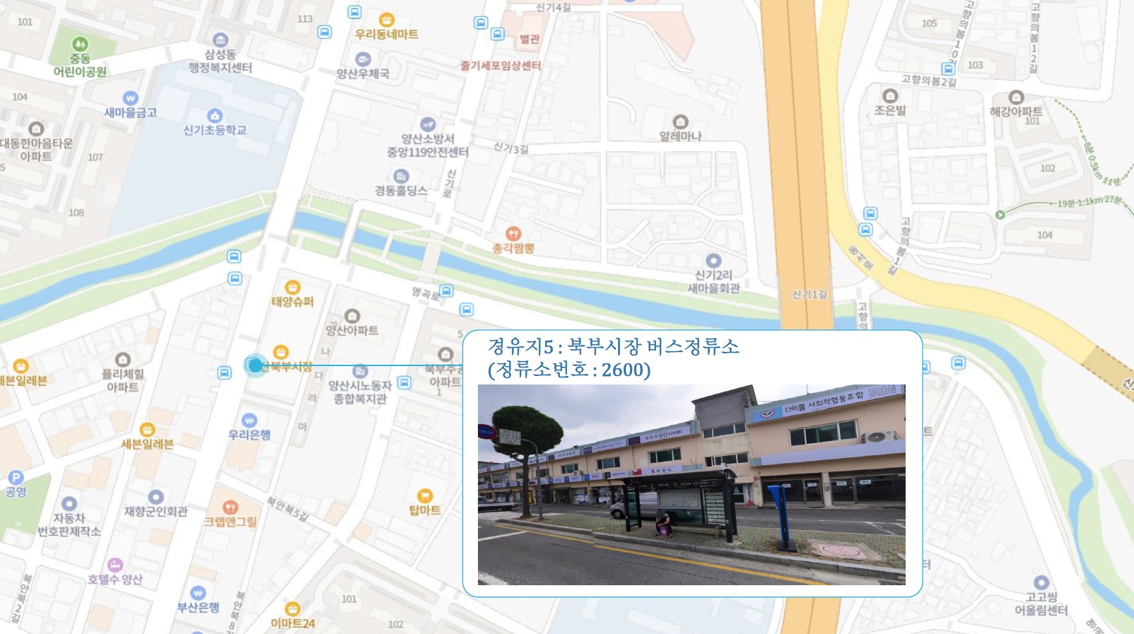 이지더원2차.한양수자인 ↔ 반도유보라3차.동원4차 ↔ 현진에버빌.효성아파트 ↔ 시외버스터미널 ↔ 남부시장 ↔ 북부시장 ↔ 남양산e편한2차.반도5차 ↔ 반도6차.금호어울림 ↔ 금산금빛마을 ↔ 남김해2 SubFC