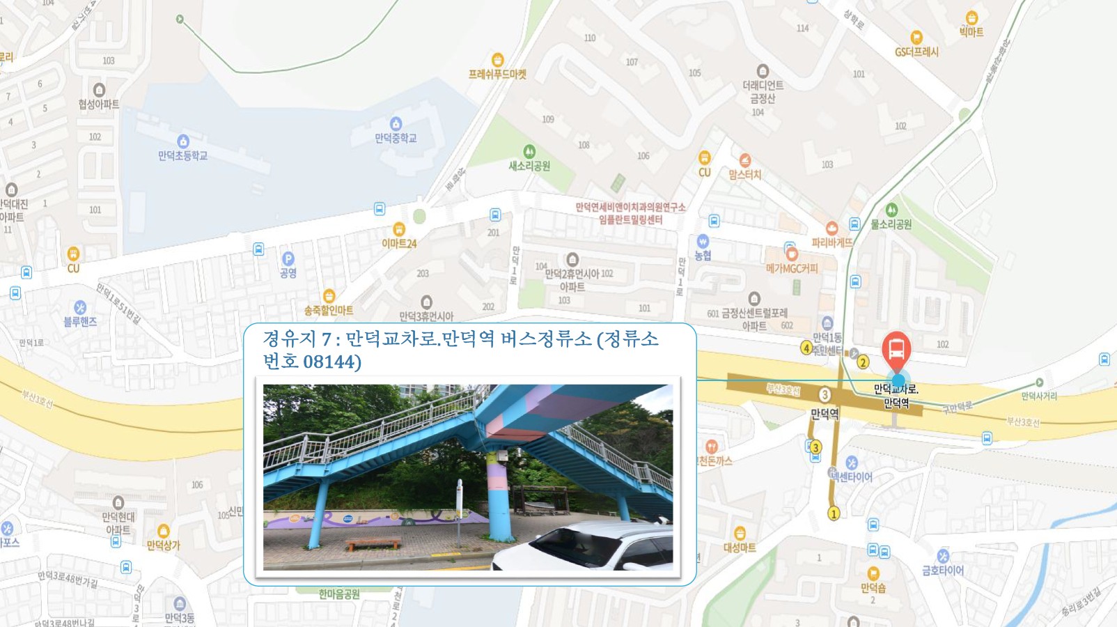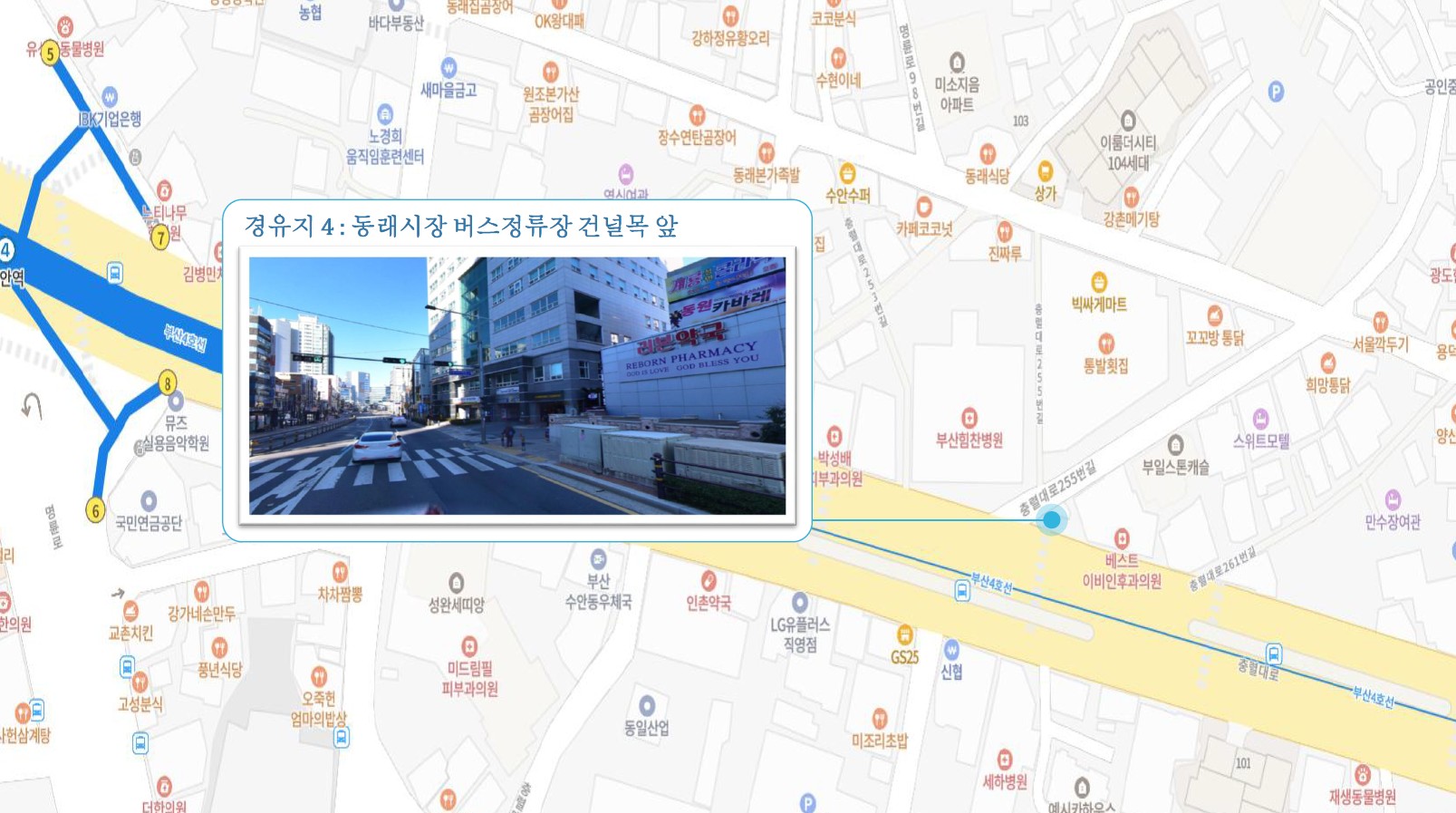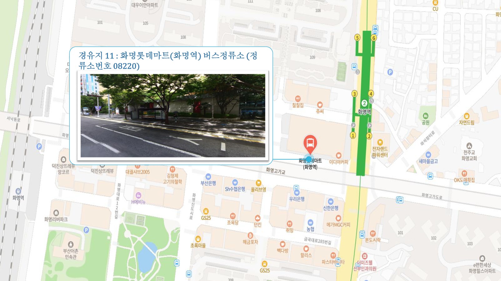 원동IC교차로 버스정류소 ↔ 안락뜨란채SK 횡단보도 ↔ 한국전력공사 동래지사 ↔ 낙민역 ↔ 동래시장 버스정류소 건널목 앞 ↔ 메가마트 동래점 주차장 입구 ↔ 미남교차로.미남역 ↔ 만덕교차로.만덕역 ↔ 남산정역 ↔ 덕천부민병원 ↔ 화명동원아파트 육교 밑 ↔ 화명롯데마트(화명역) ↔ 남김해2 SubFC