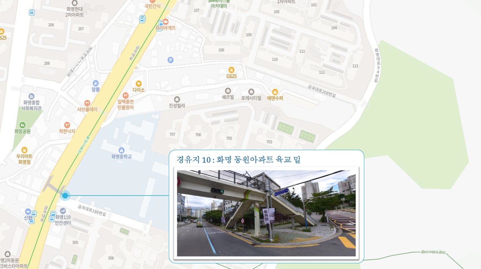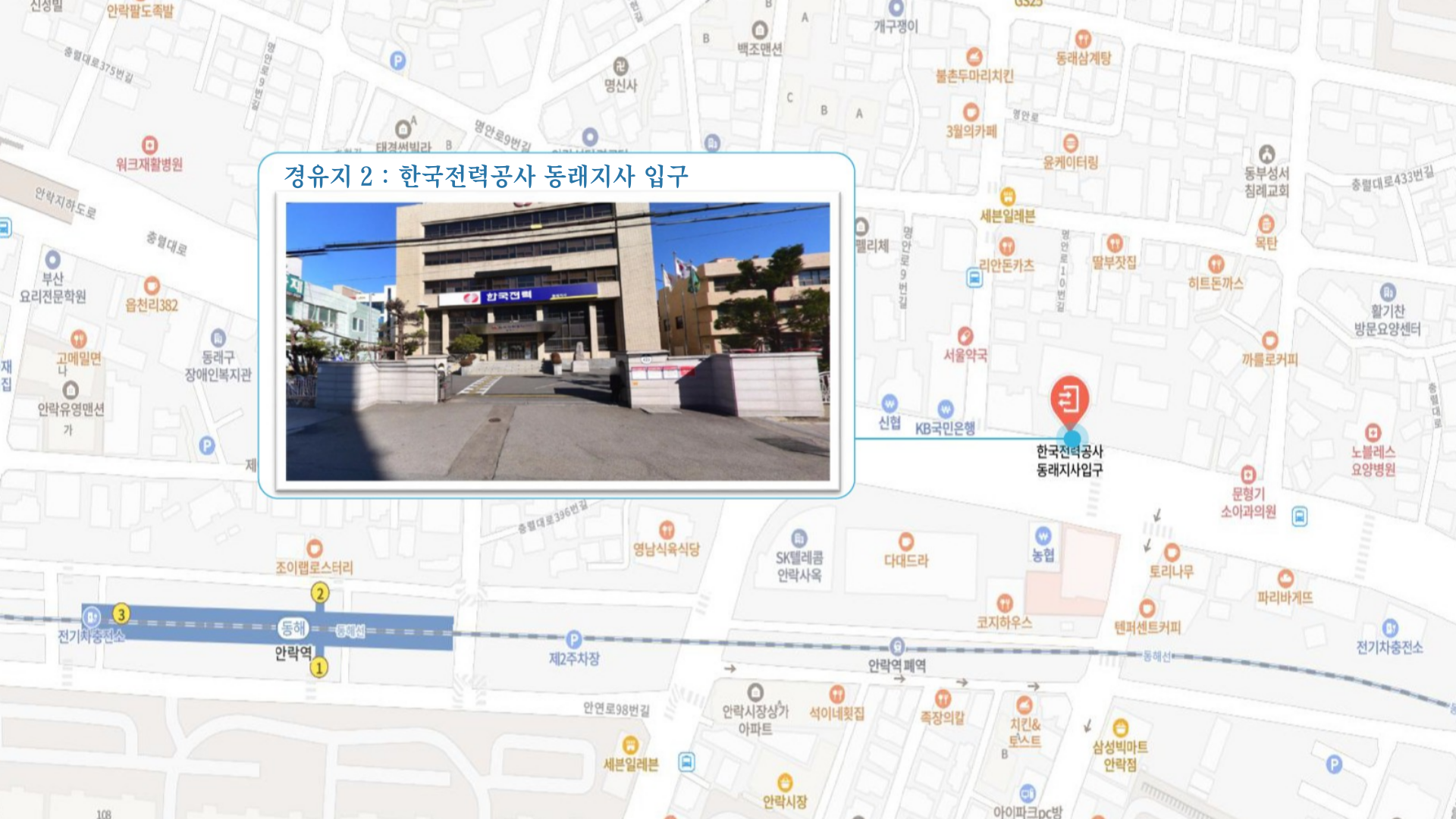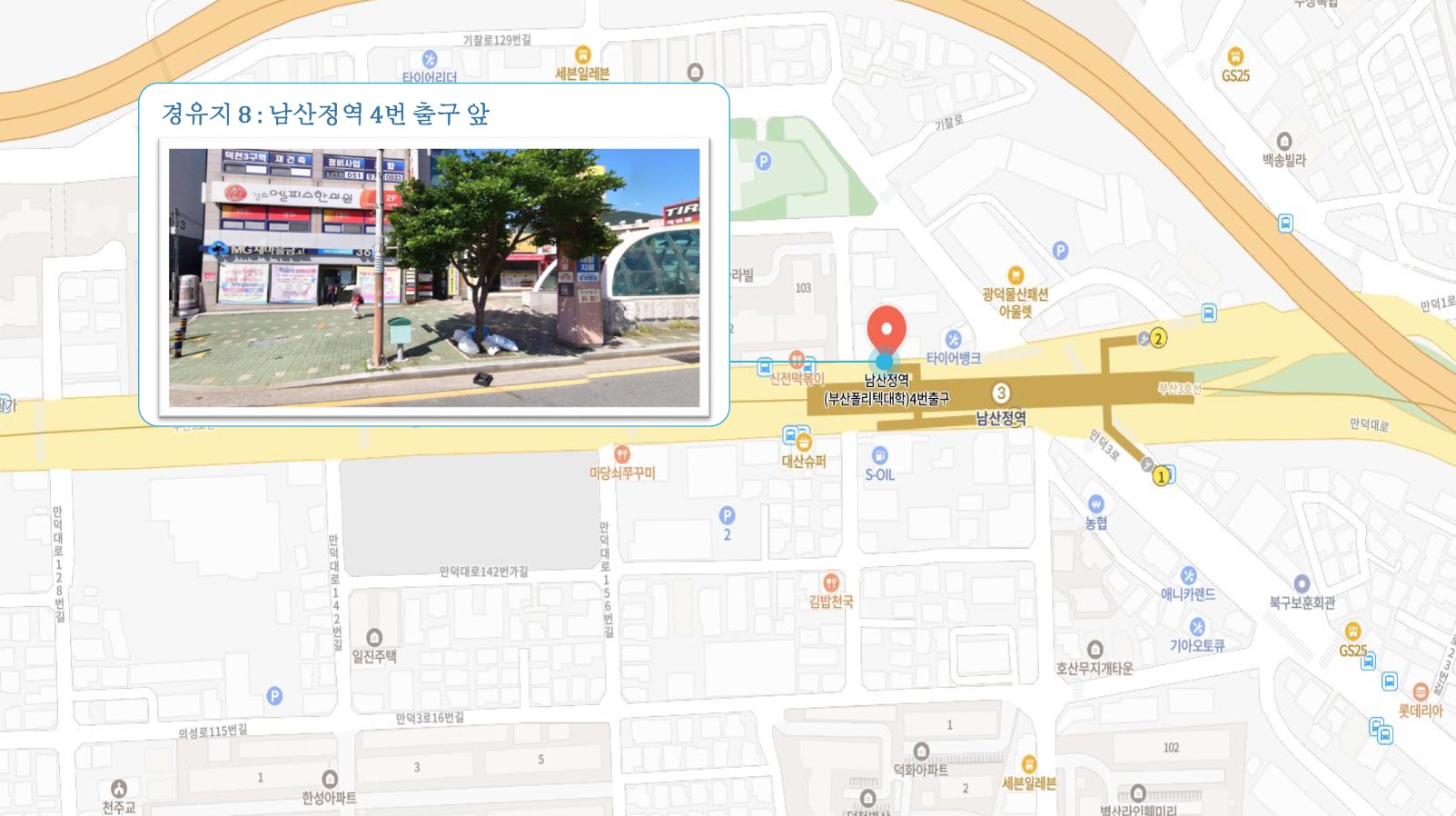 원동IC교차로 버스정류소 ↔ 안락뜨란채SK 횡단보도 ↔ 한국전력공사 동래지사 ↔ 낙민역 ↔ 동래시장 버스정류소 건널목 앞 ↔ 메가마트 동래점 주차장 입구 ↔ 미남교차로.미남역 ↔ 만덕교차로.만덕역 ↔ 남산정역 ↔ 덕천부민병원 ↔ 화명동원아파트 육교 밑 ↔ 화명롯데마트(화명역) ↔ 남김해2 SubFC