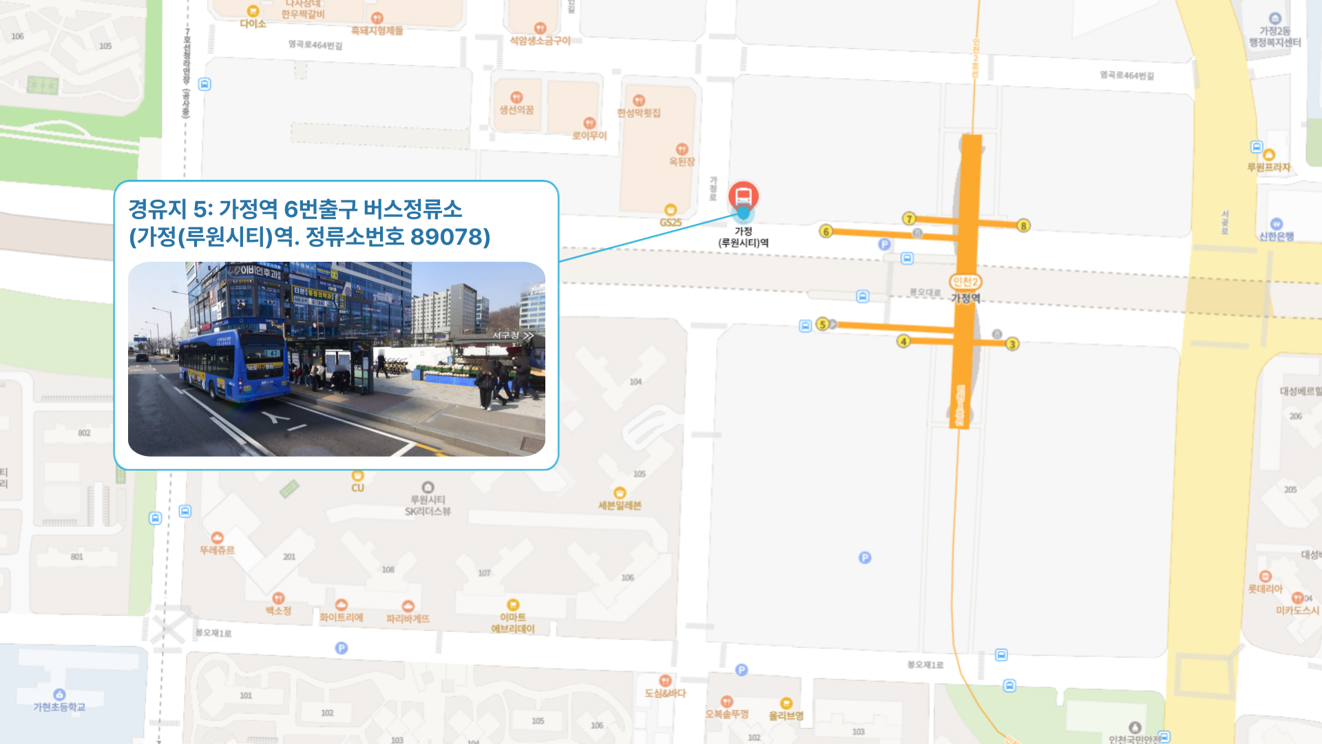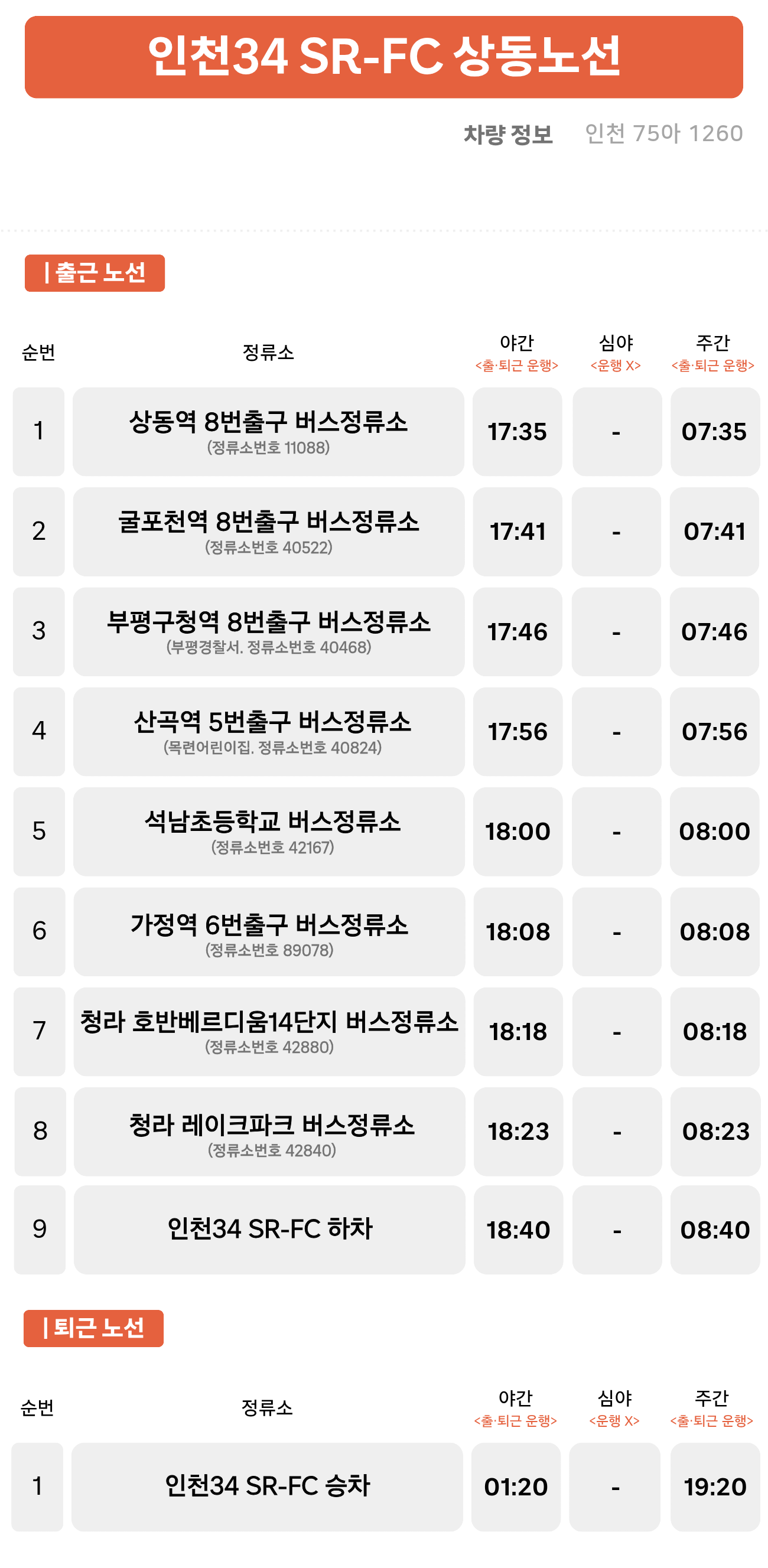 상동역 ↔ 굴포천역 ↔ 부평구청역 ↔ 산곡역 ↔ 석남초등학교 ↔ 가정역 ↔ 청라 호반베르디움14단지 ↔ 청라 레이크파크 ↔ 인천34 SR-FC