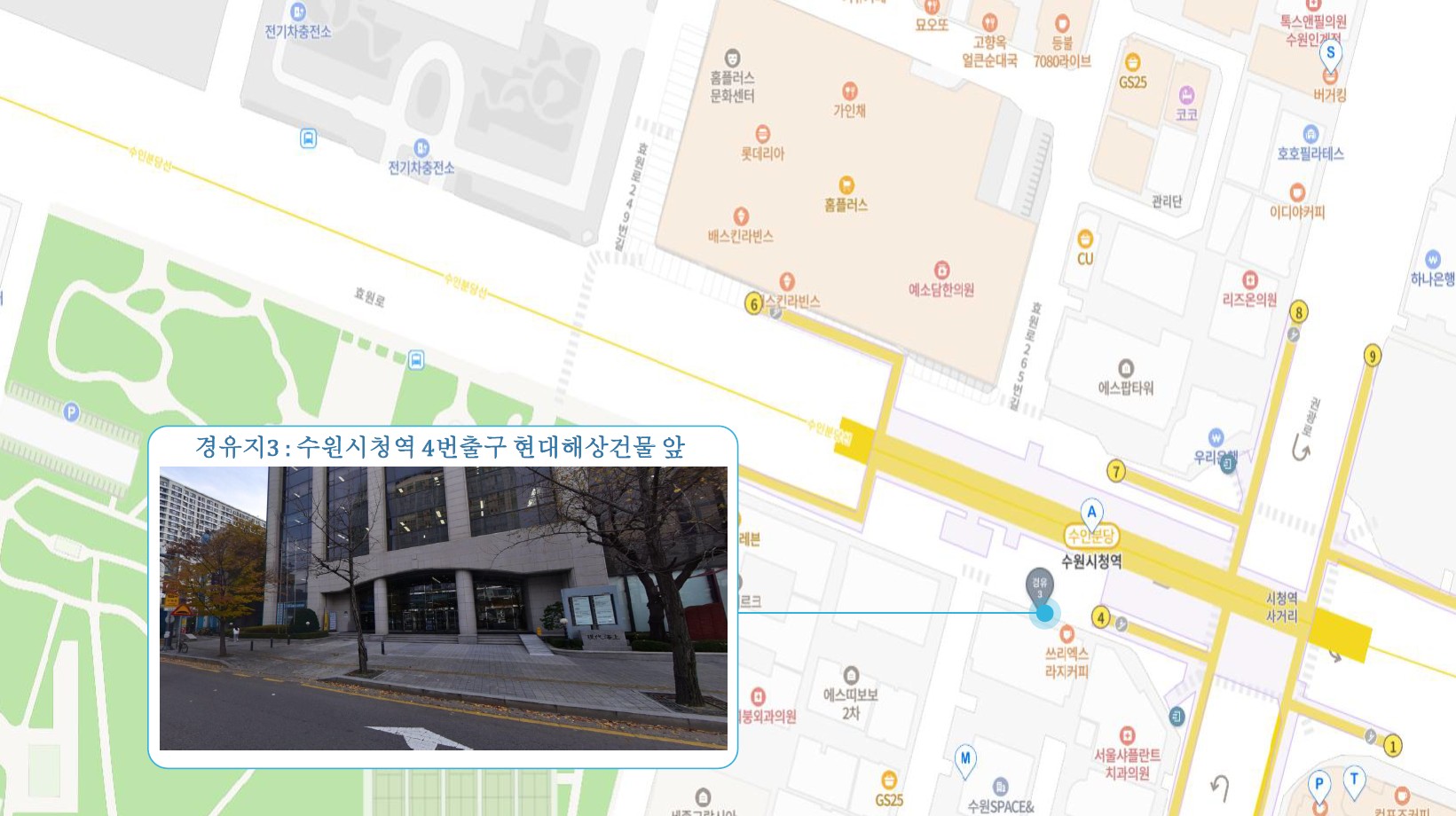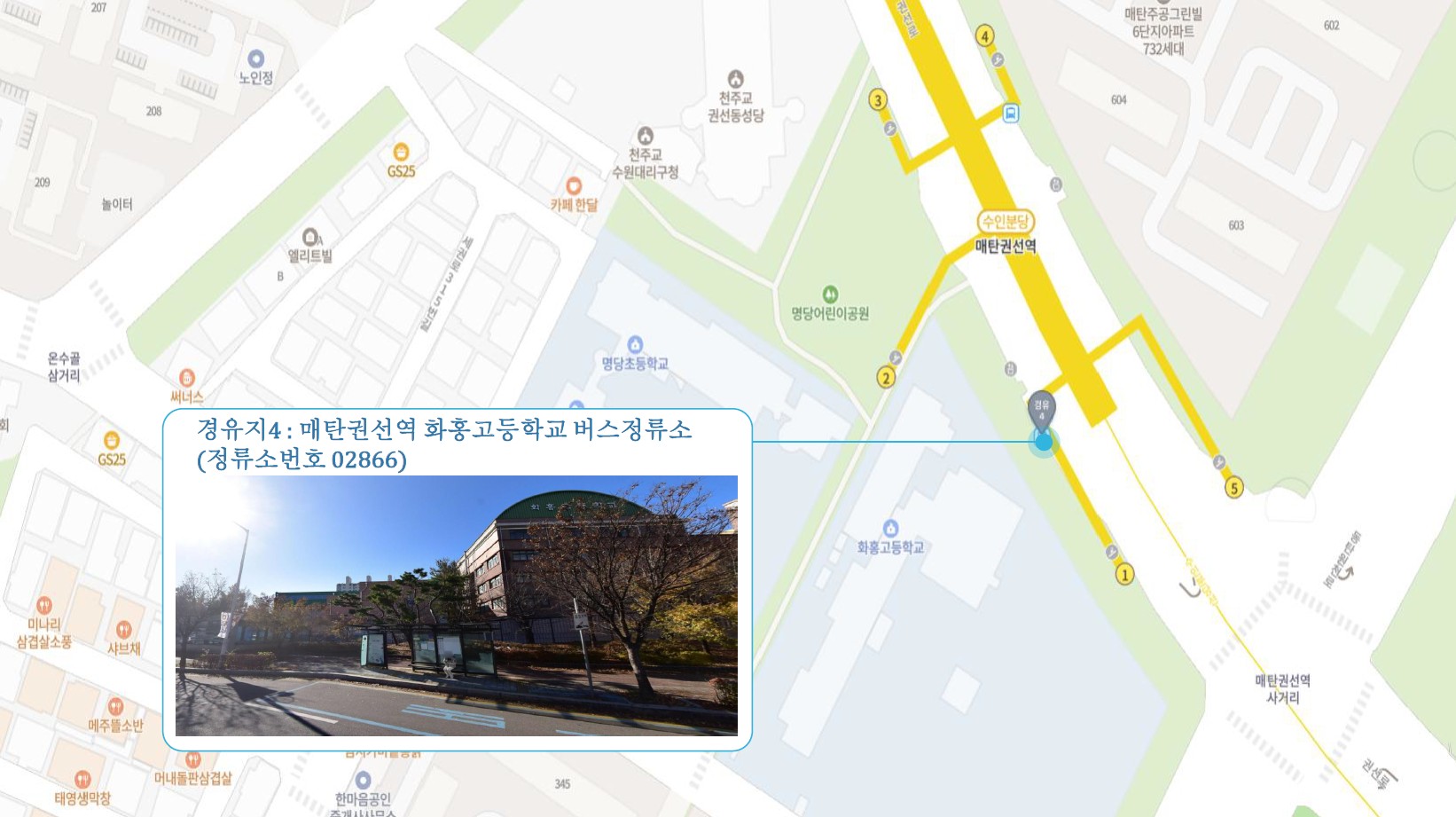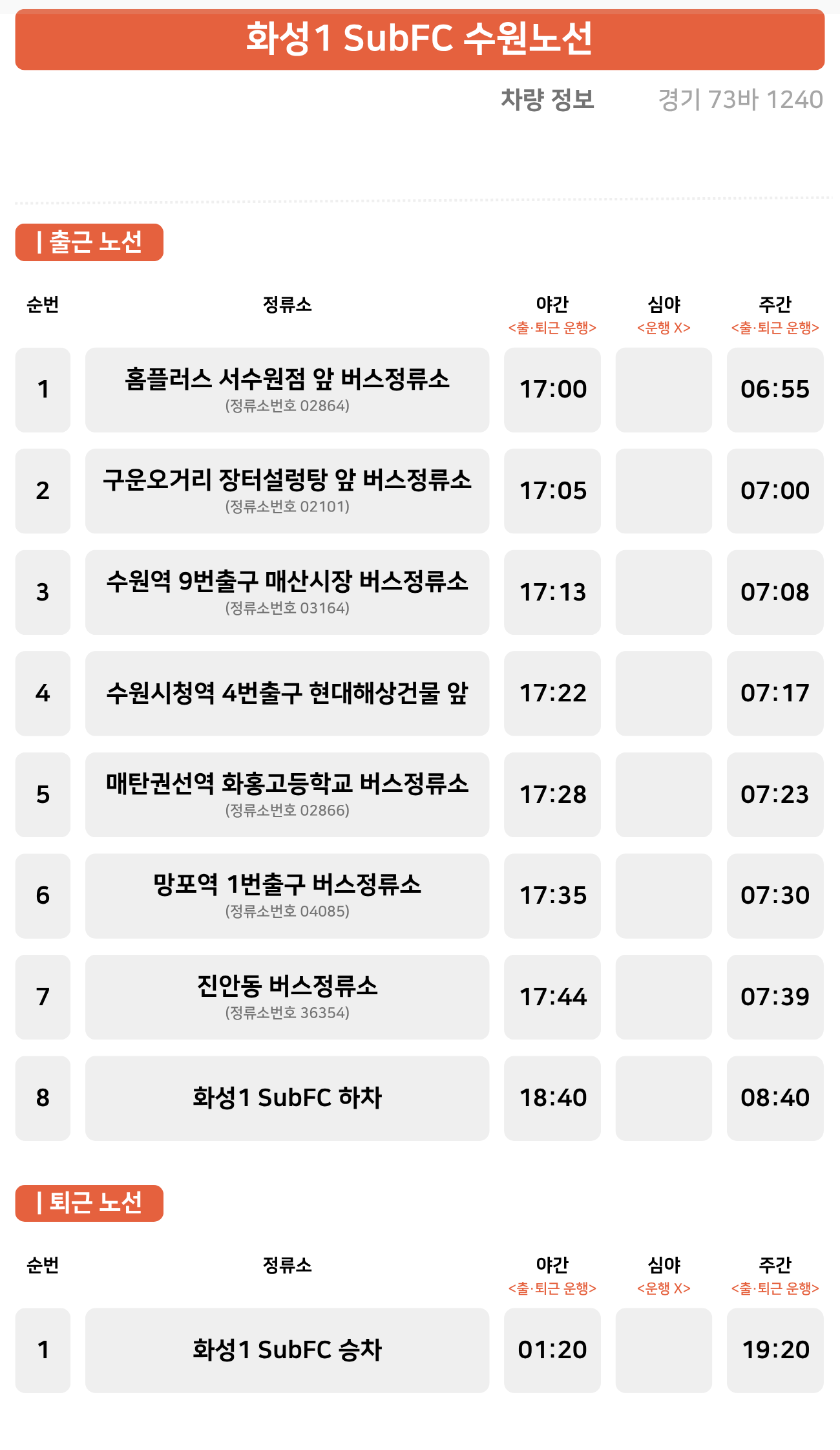 홈플러스 서수원점 ↔ 구운오거리 장터설렁탕 ↔ 수원역 ↔ 수원시청역 ↔ 매탄권선역 화홍고등학교 ↔ 망포역 ↔ 진안동 ↔ 화성1 SubFC