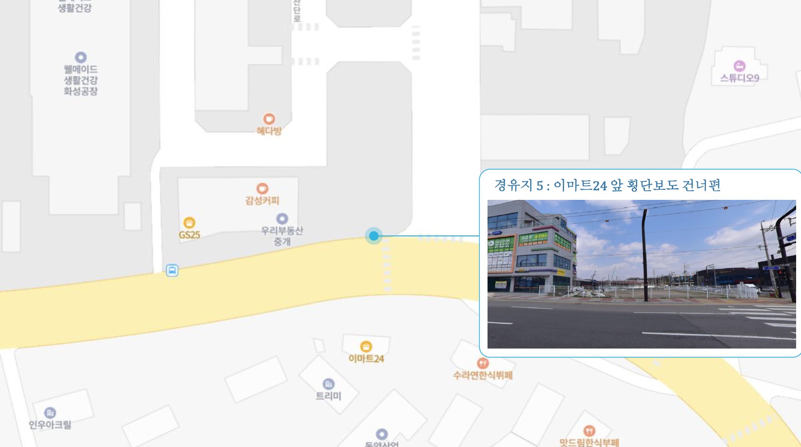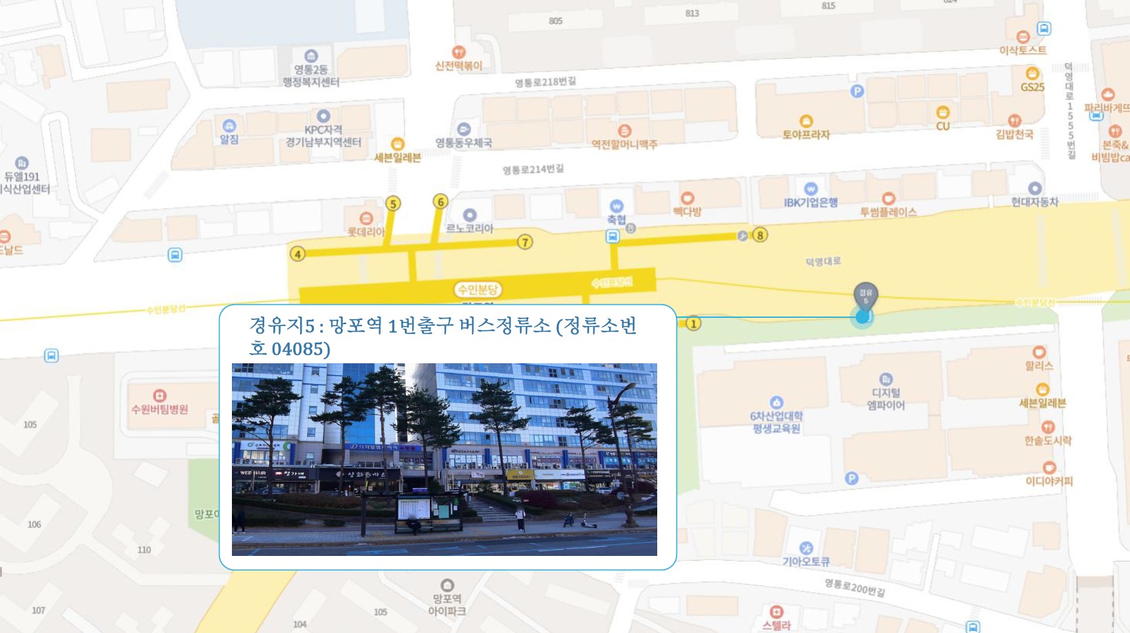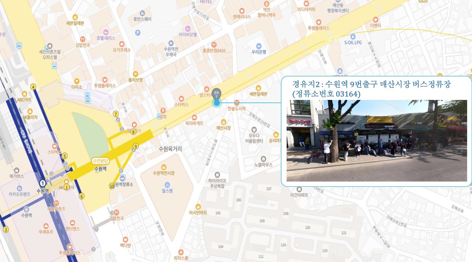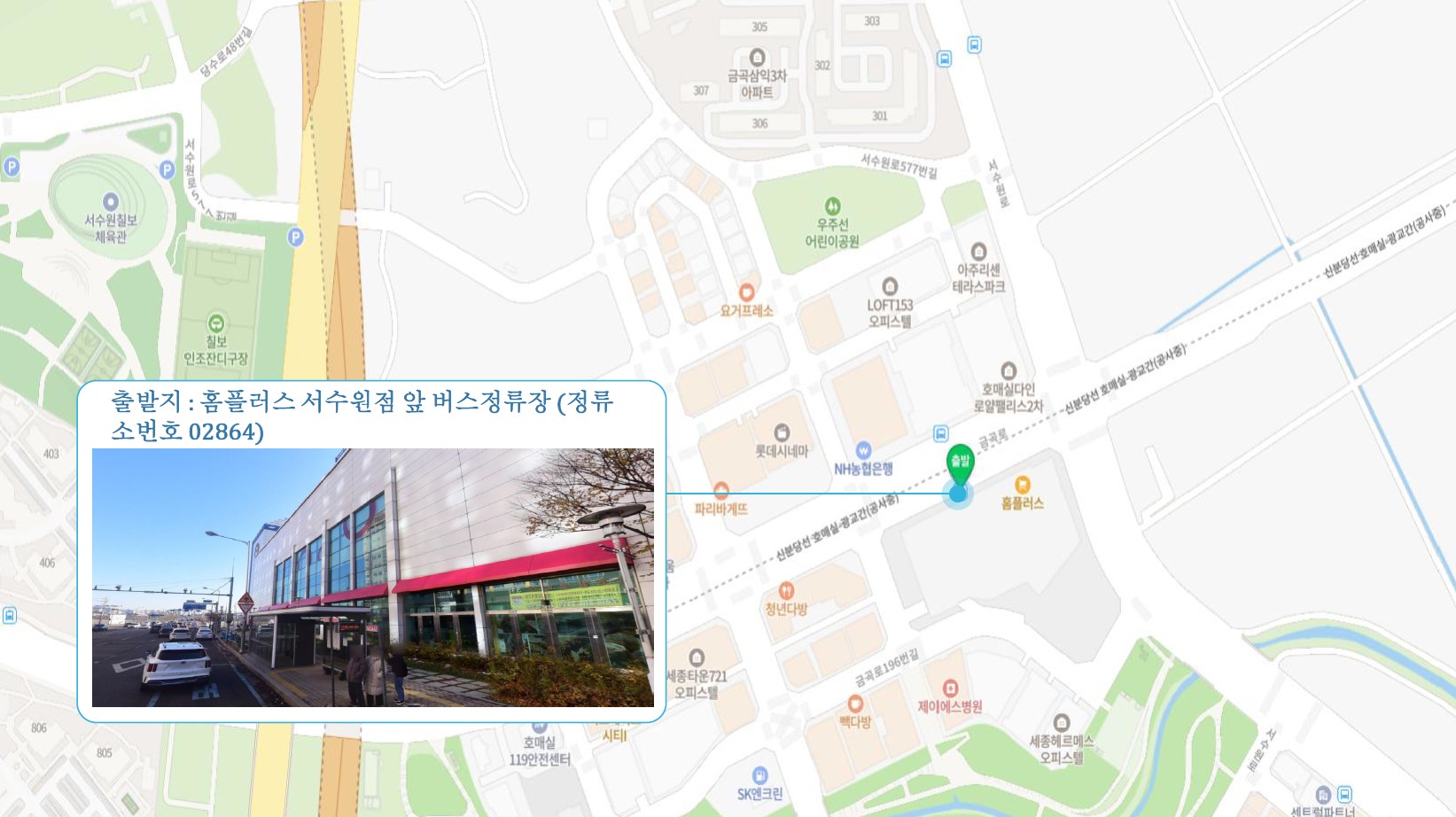 홈플러스 서수원점 ↔ 구운오거리 장터설렁탕 ↔ 수원역 ↔ 수원시청역 ↔ 매탄권선역 화홍고등학교 ↔ 망포역 ↔ 진안동 ↔ 화성1 SubFC