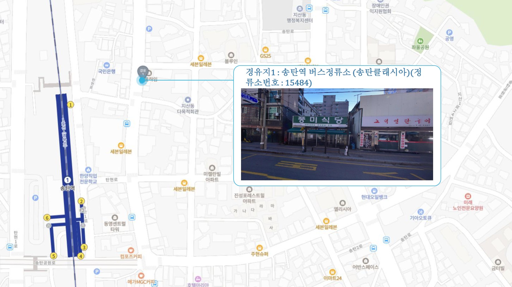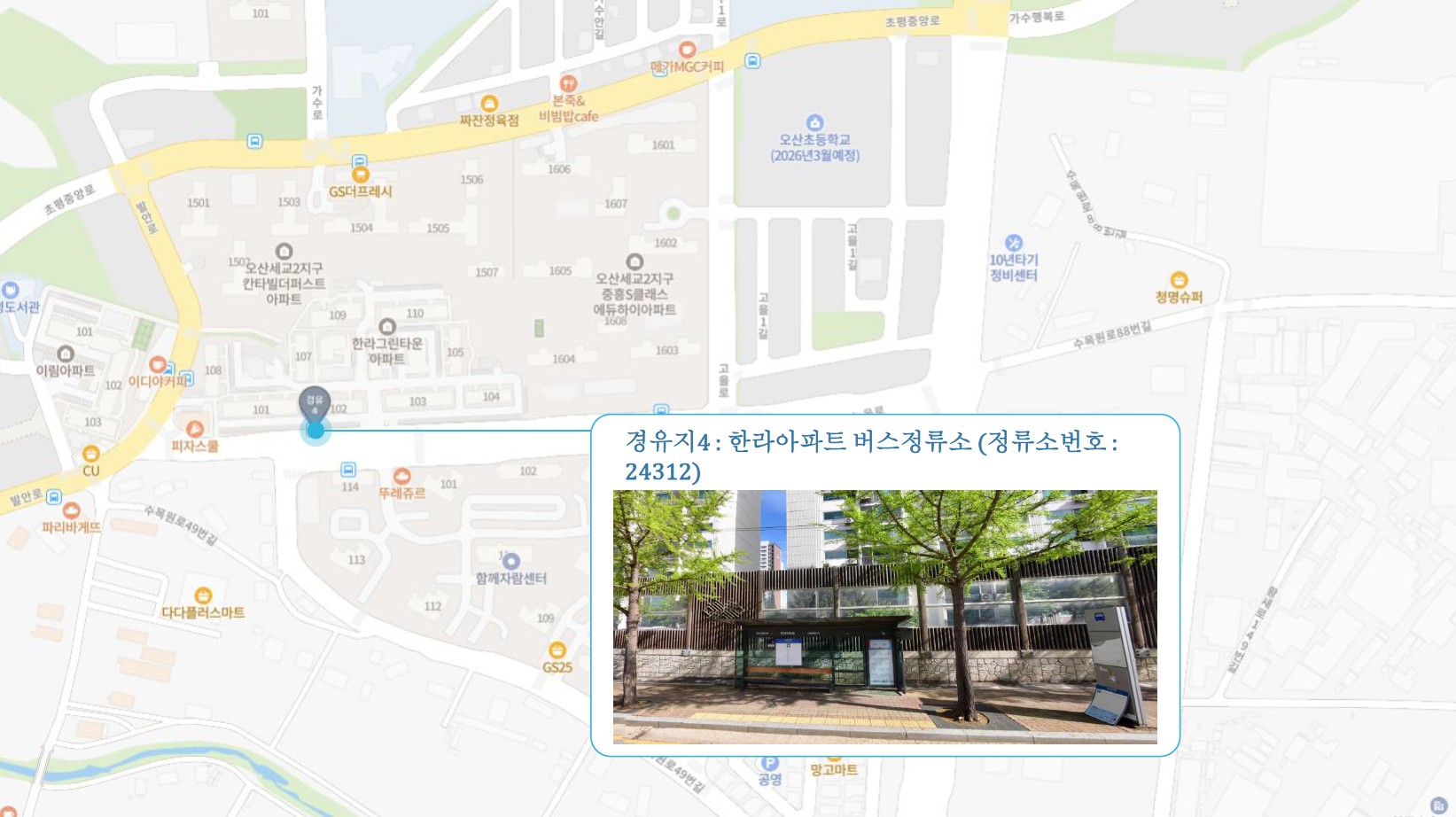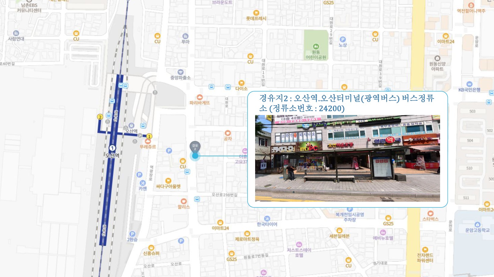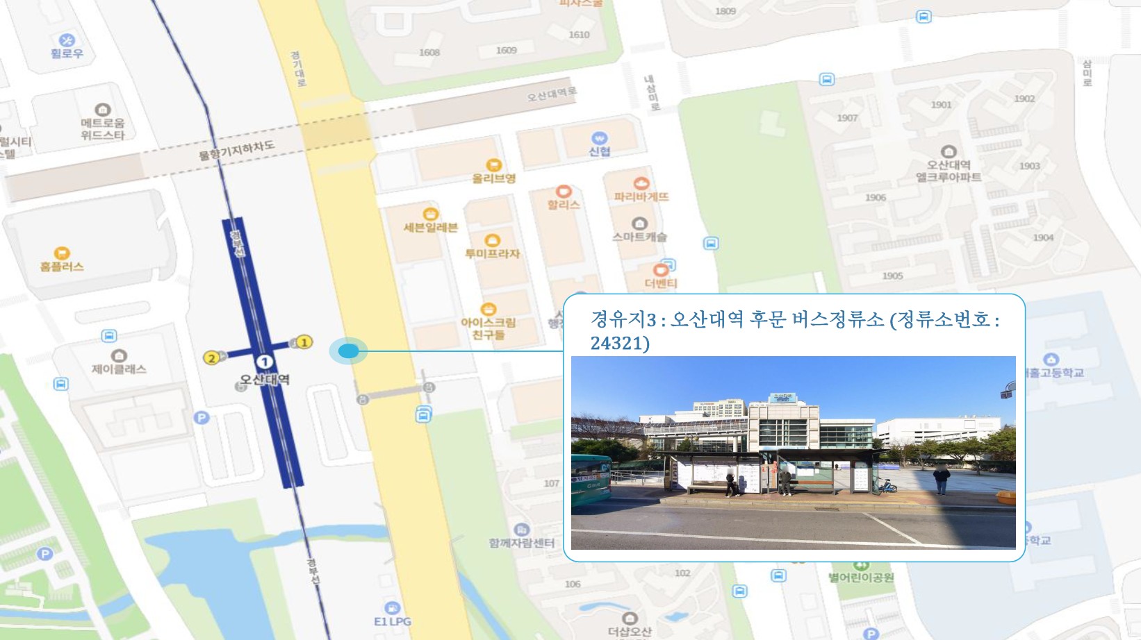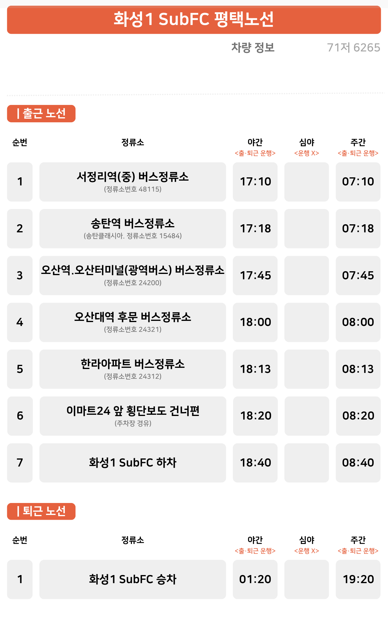서정리역 ↔ 송탄역(송탄클래시아) ↔ 오산역.오산터미널(광역버스) ↔ 오산대역 ↔ 한라아파트 이마트24 앞 횡단보도 건너편(주차장 경유) 화성1 SubFC