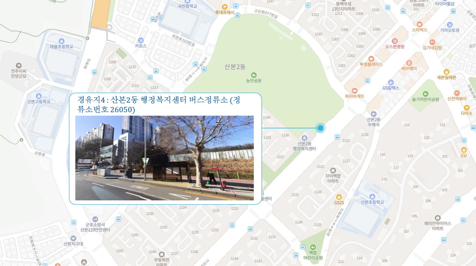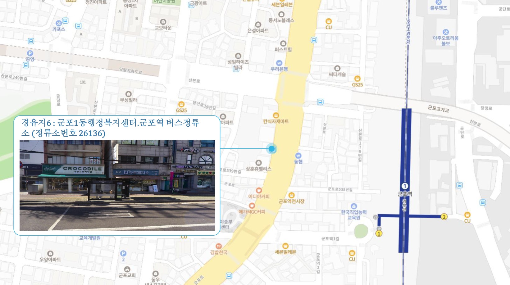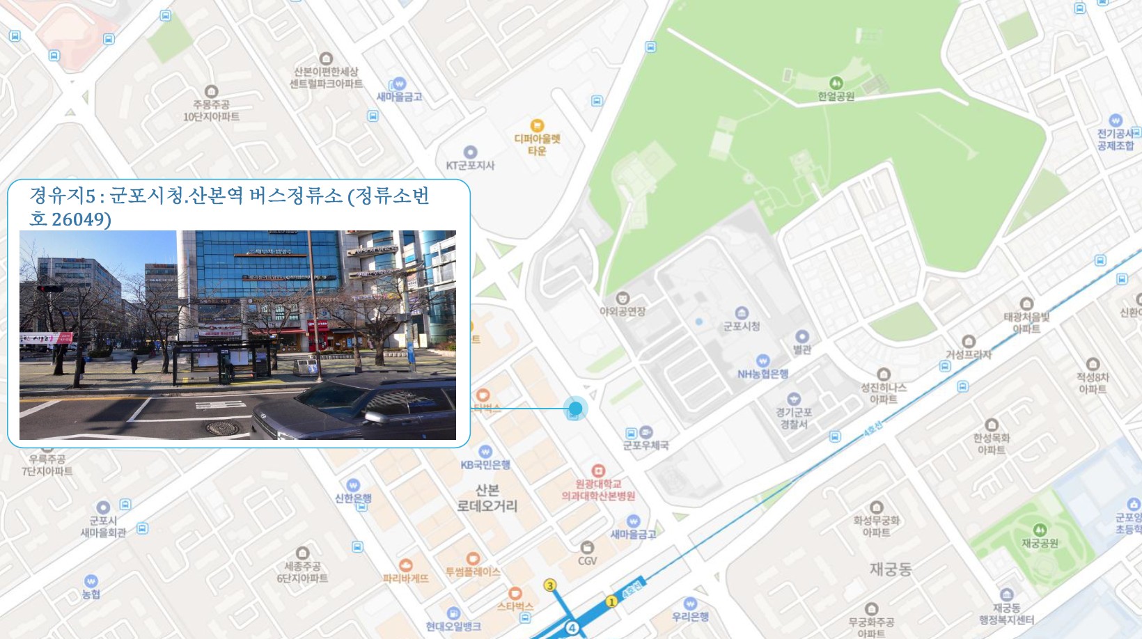 석수교회 ↔ 안양시외버스정류소.교보생명 버스정류소 ↔ 안양센트럴헤센.KCC스위첸 ↔ 명학초교 버스정류소 ↔ 산본2동 행정복지센터 ↔ 군포시청.산본역 ↔ 군포1동 행정복지센터.군포역 ↔ 용호고등학교 화성1 SubFC
