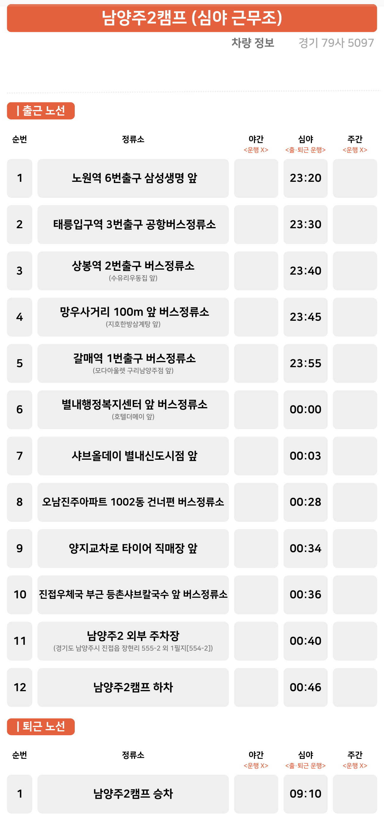 노원역 ↔ 태릉입구역 ↔ 별내행정복지센터 ↔ 양지교차로 ↔ 연평교차로 ↔ 남양주2 캠프