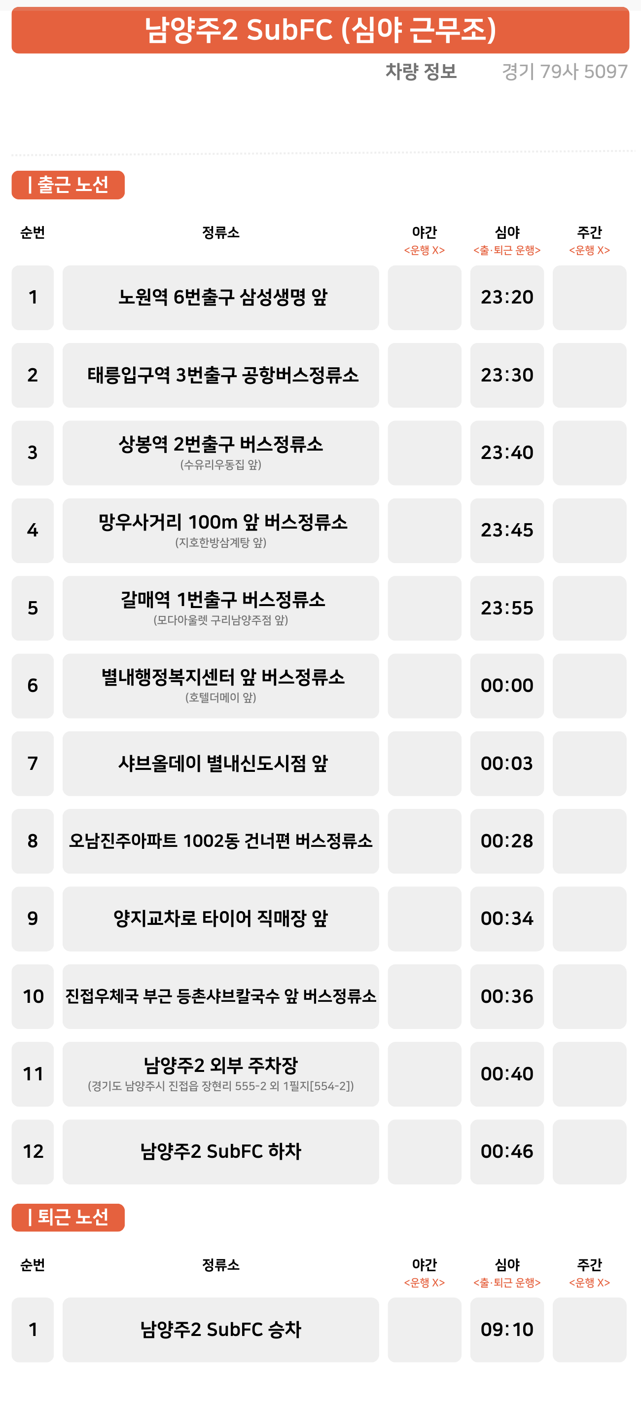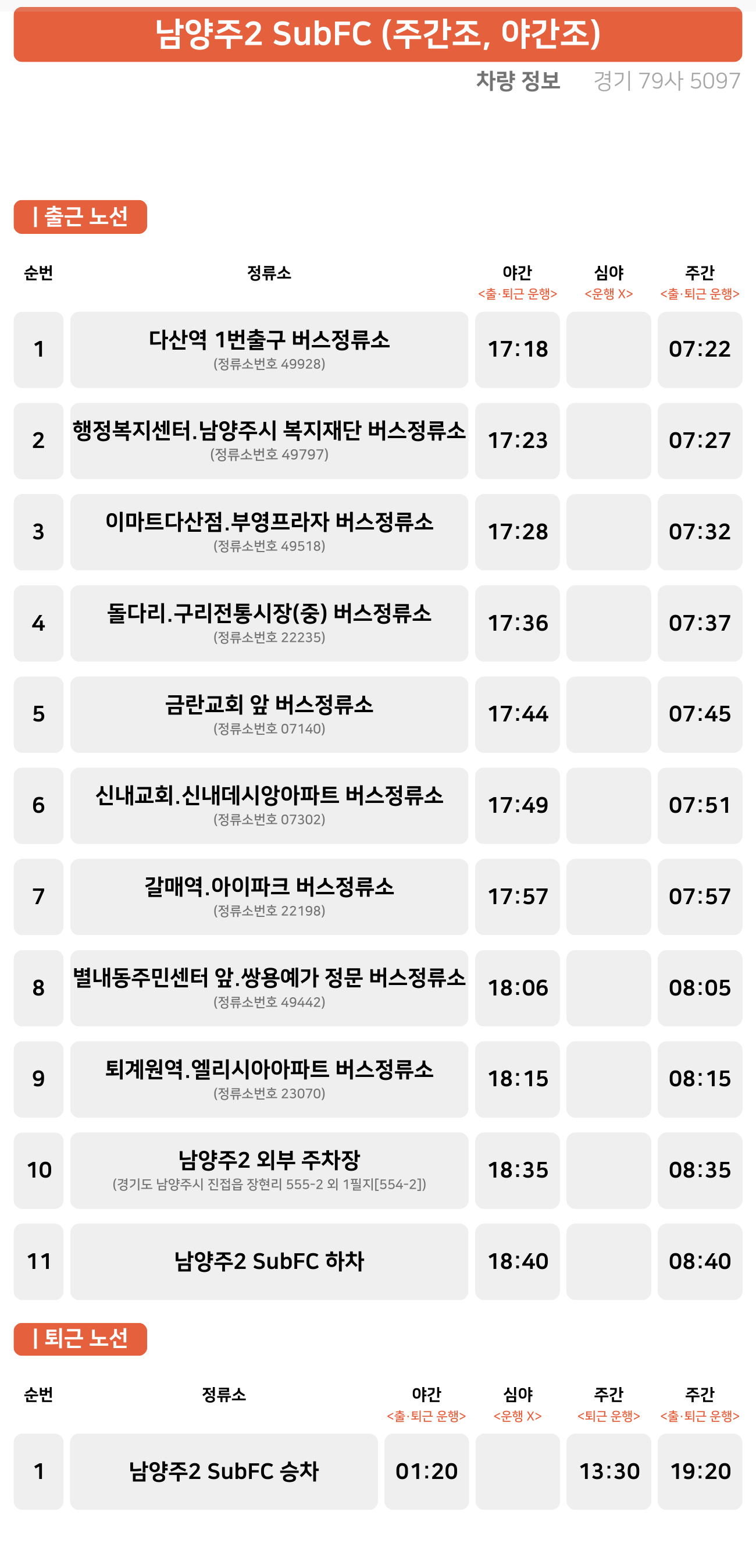 다산역 ↔ 남양주시 복지재단 ↔ 이마트 다산점 ↔ 돌다리 ↔ 금란교회 ↔ 신내교회 ↔ 갈매역 ↔ 별내동 주민센터↔ 퇴계원역 ↔ 남양주2 외부 주차장 ↔ 남양주2 SubFC