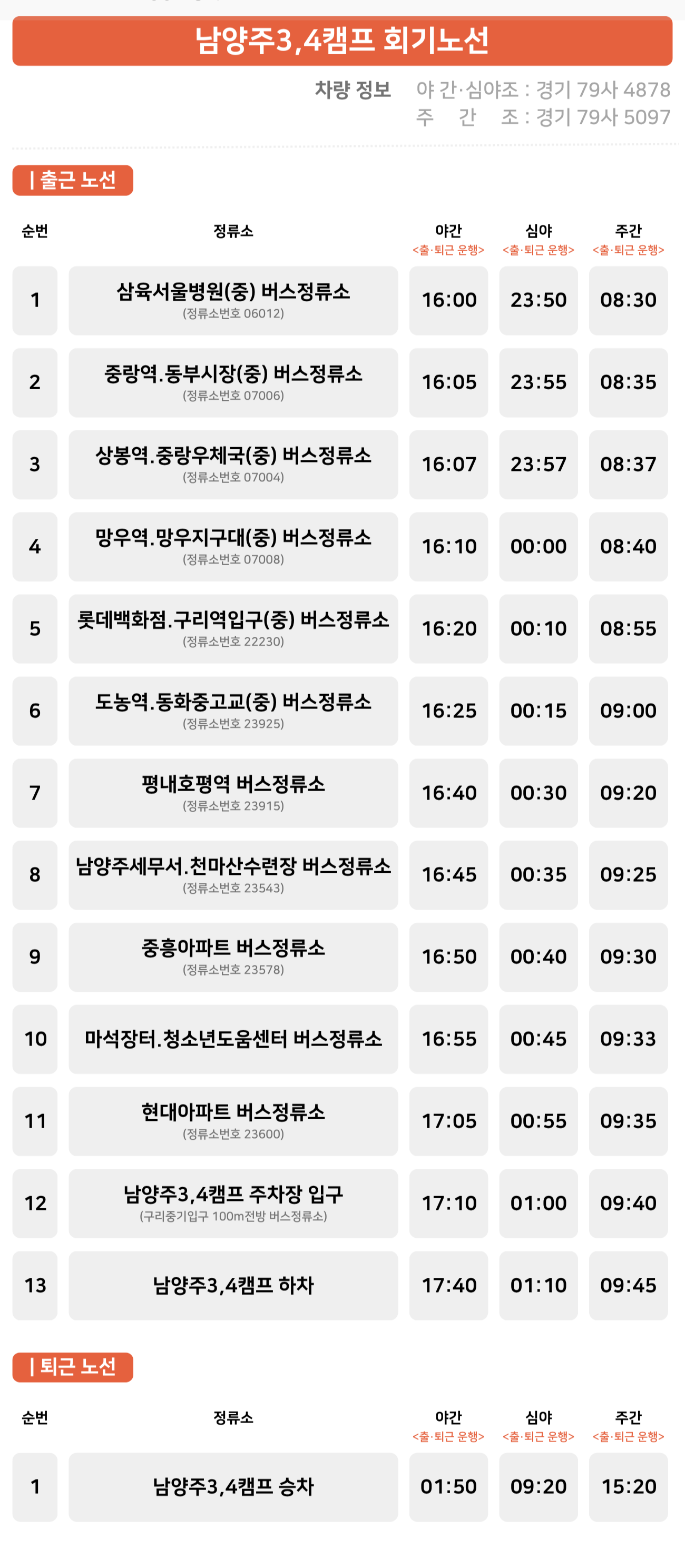 회기역 ↔ 중랑역 ↔ 상봉역 ↔ 망우역 ↔ 구리역 ↔ 도농역 ↔ 평내호평역 ↔ 남양주세무서 ↔ 스타벅스화도DT점 ↔ 주차장 ↔ 남양주3 캠프