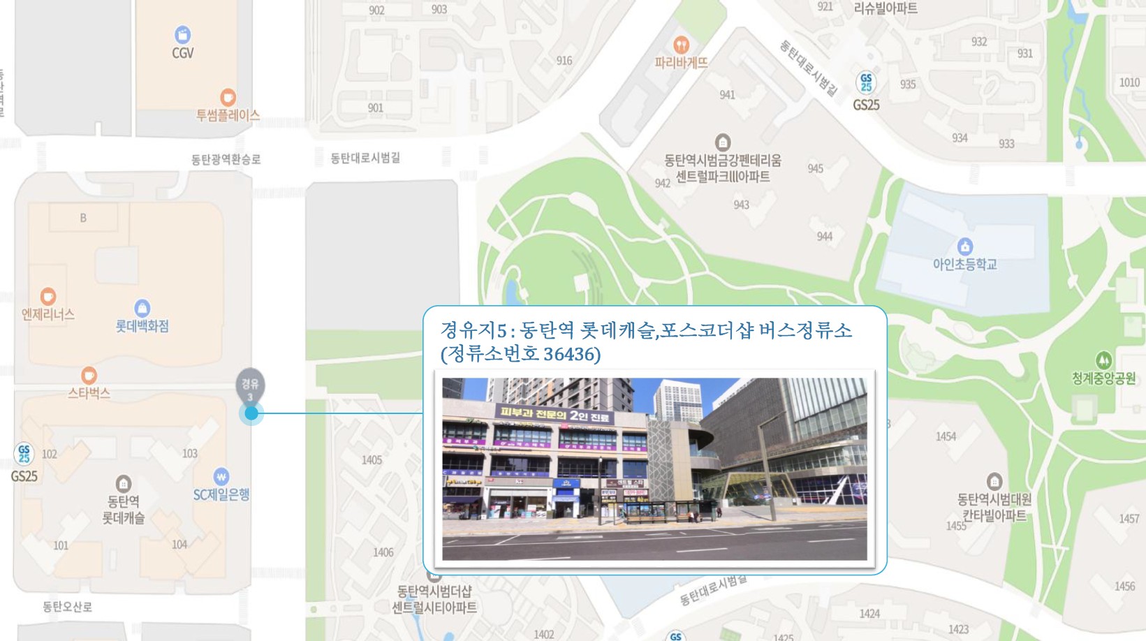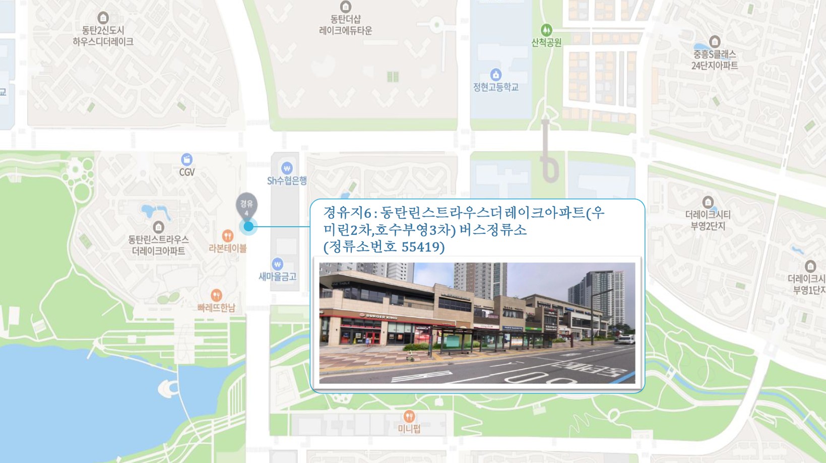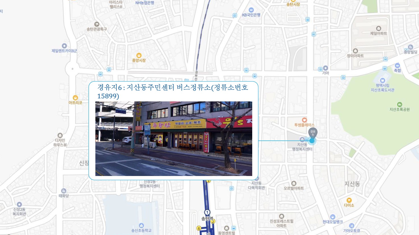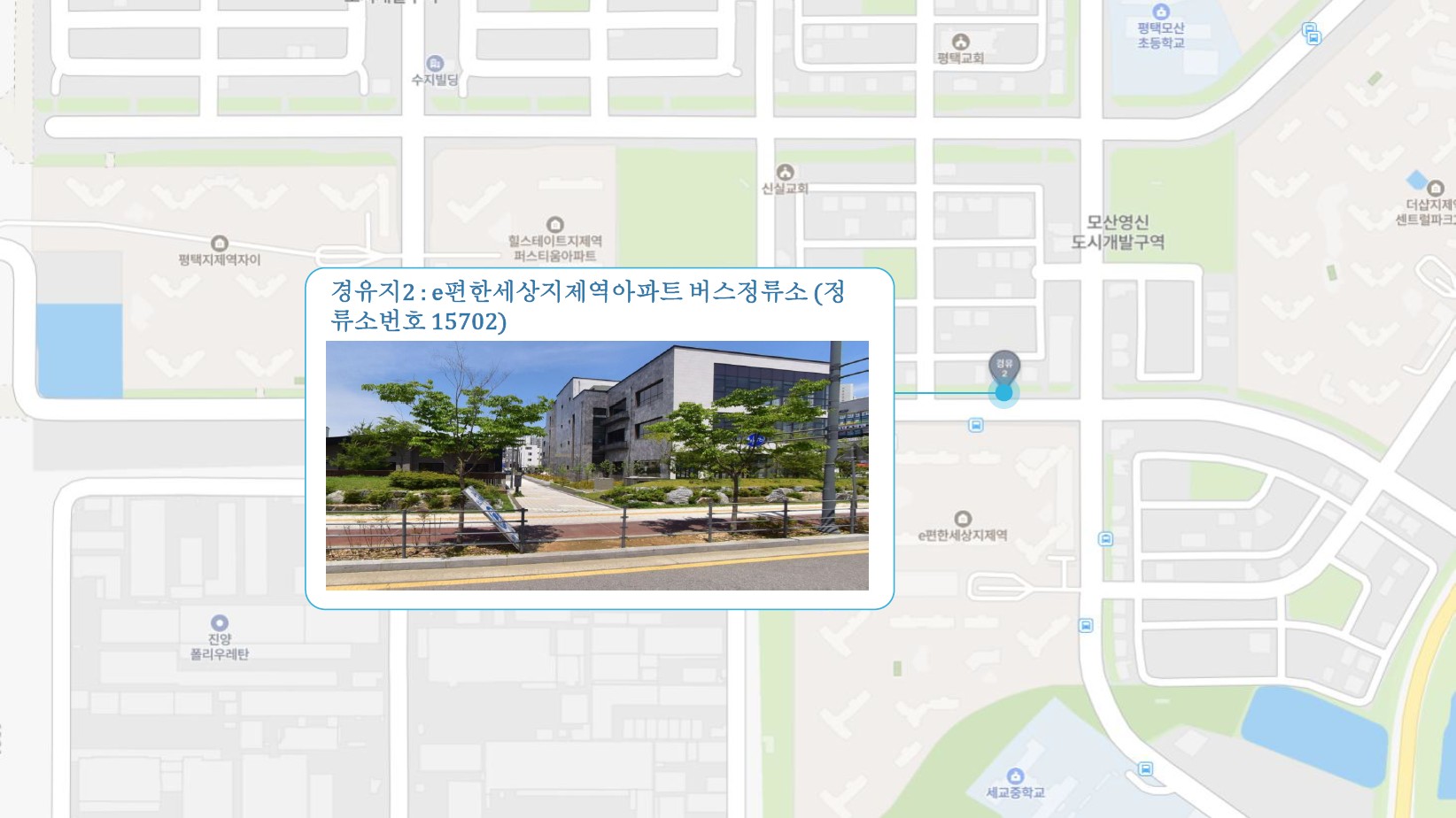 외기노조C지구.새한아파트 ↔ 이곡마을6단지 ↔ e편한세상지제역아파트 ↔ 고덕LH12단지 ↔ 고덕파라곤 ↔ 송일초등학교.미송아파트 ↔ 지산동 주민센터 ↔ 한전사거리 ↔ 오산경찰서 ↔ 동탄1 캠프
