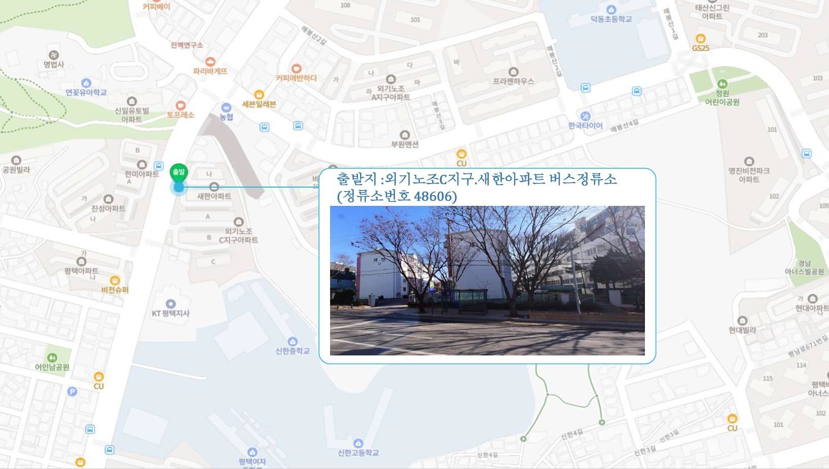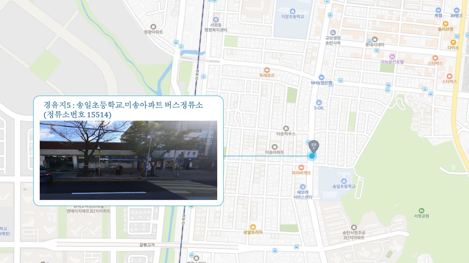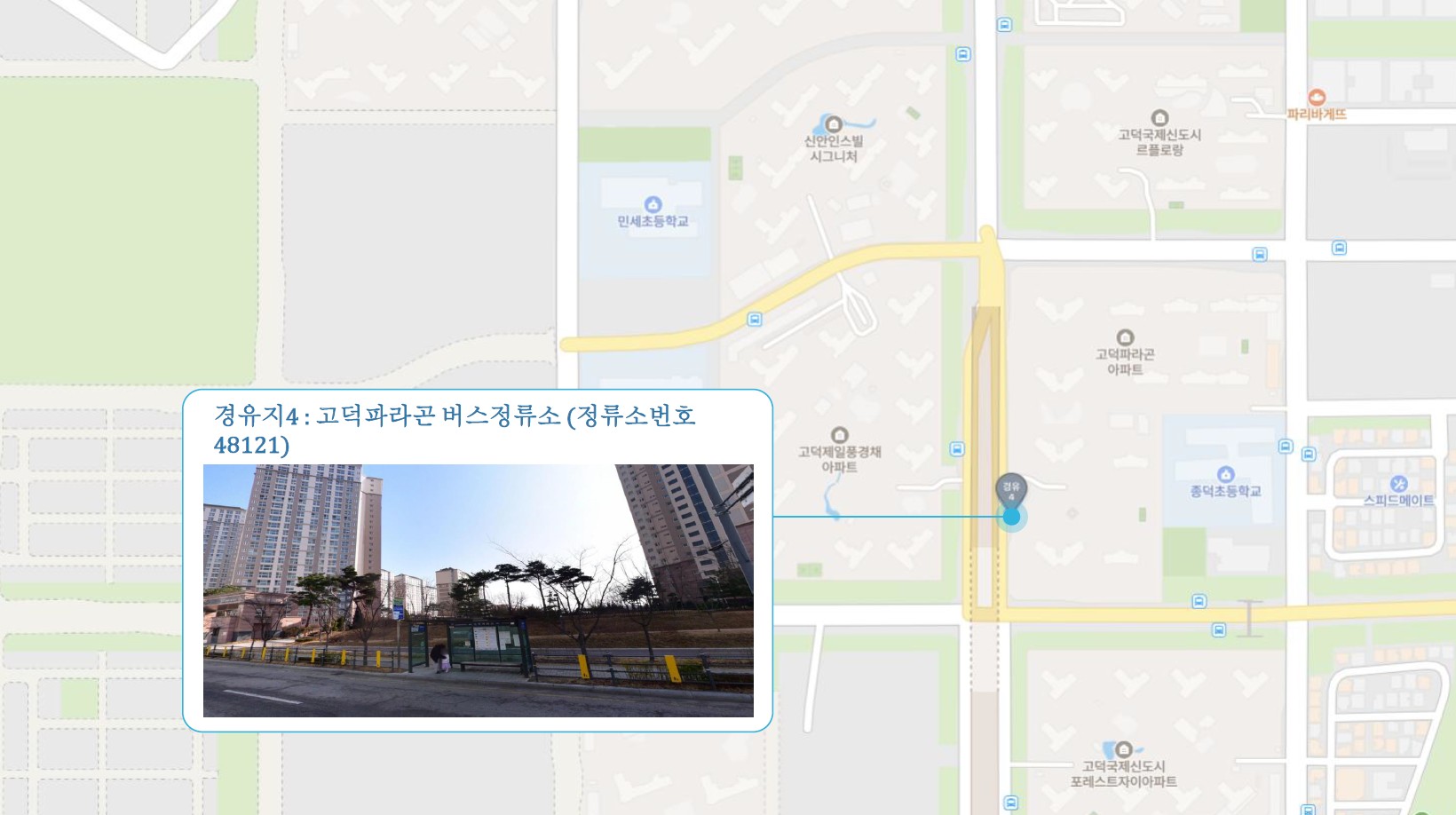 외기노조C지구.새한아파트 ↔ 이곡마을6단지 ↔ e편한세상지제역아파트 ↔ 고덕LH12단지 ↔ 고덕파라곤 ↔ 송일초등학교.미송아파트 ↔ 지산동 주민센터 ↔ 한전사거리 ↔ 오산경찰서 ↔ 동탄1 캠프