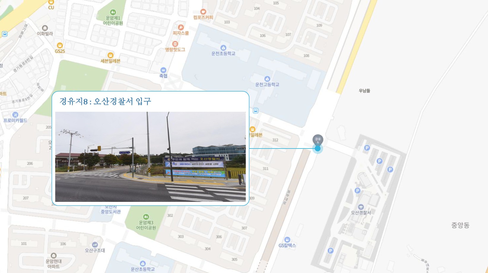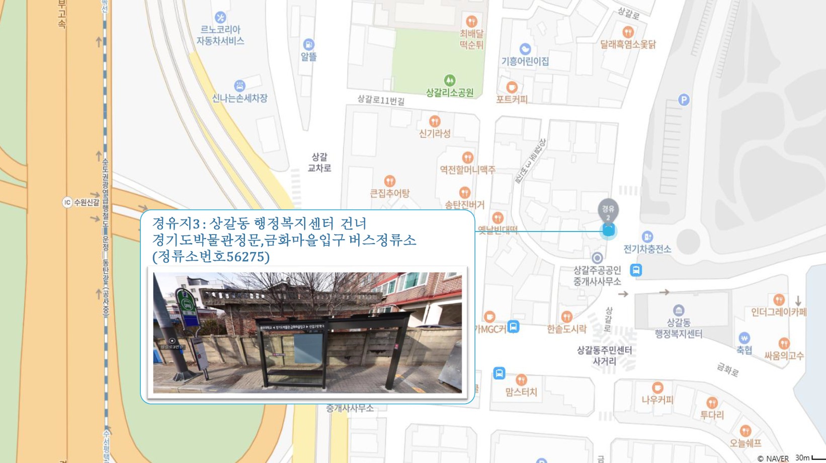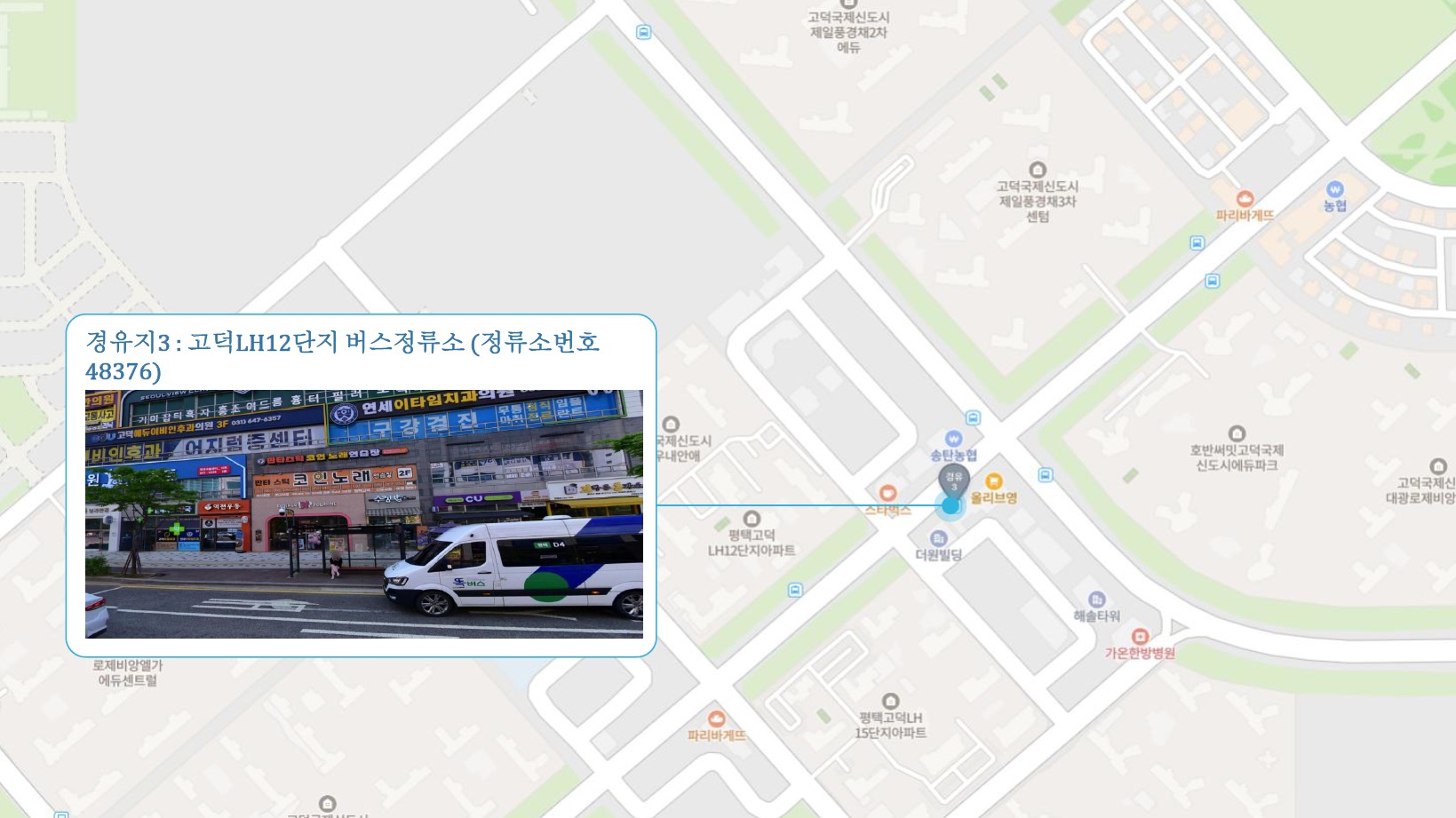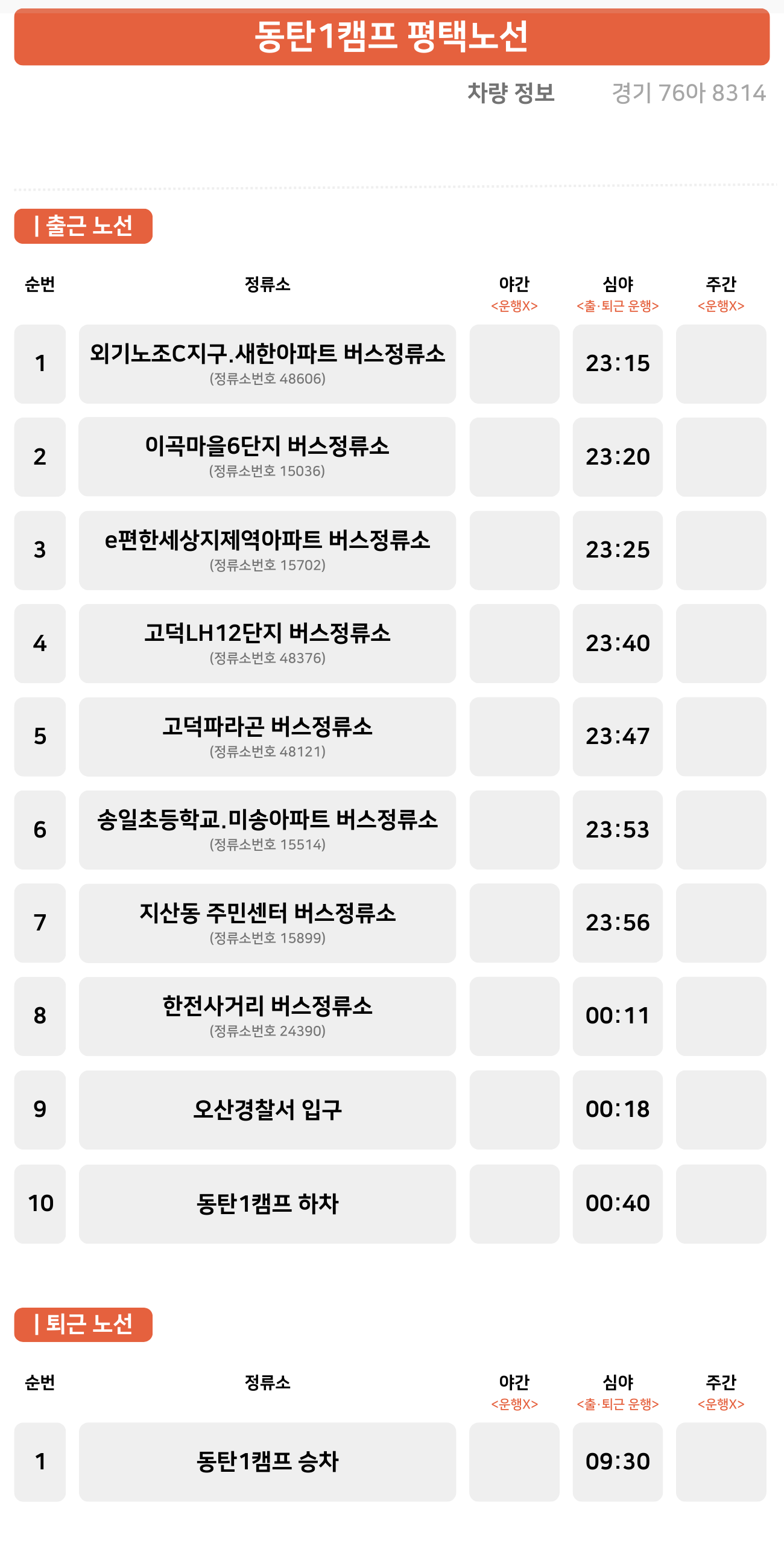 외기노조C지구.새한아파트 ↔ 이곡마을6단지 ↔ e편한세상지제역아파트 ↔ 고덕LH12단지 ↔ 고덕파라곤 ↔ 송일초등학교.미송아파트 ↔ 지산동 주민센터 ↔ 한전사거리 ↔ 오산경찰서 ↔ 동탄1 캠프