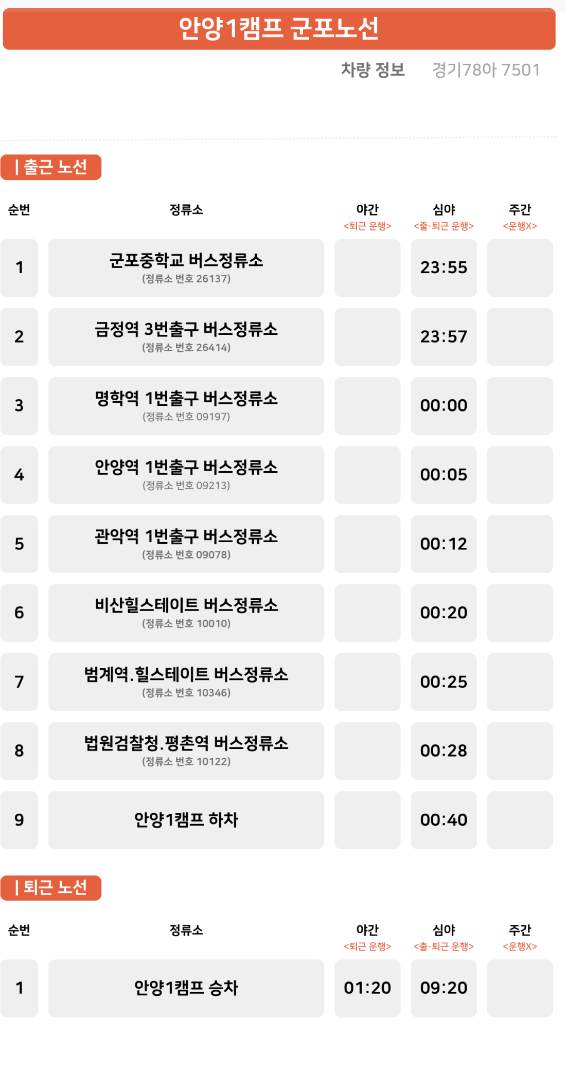 야간 근무조 출근버스는 미운행 야간근무조 퇴근 , 심야근무조 출/퇴근 운행