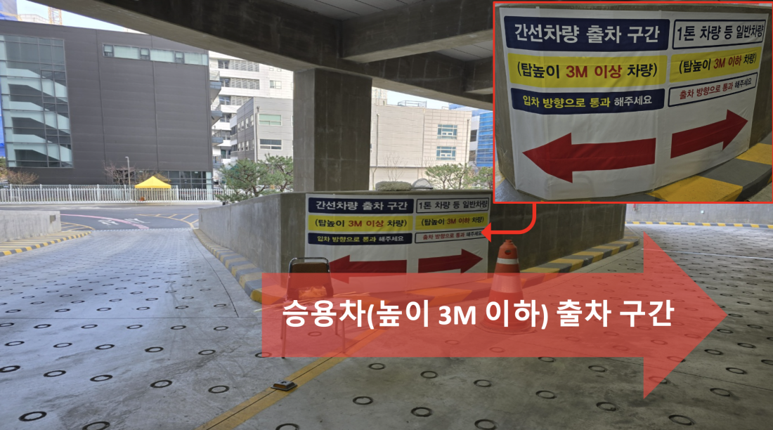 입차 전, 출차하는 대형(간선)차량 확인 후, 안전에 유의하여 진입필수!