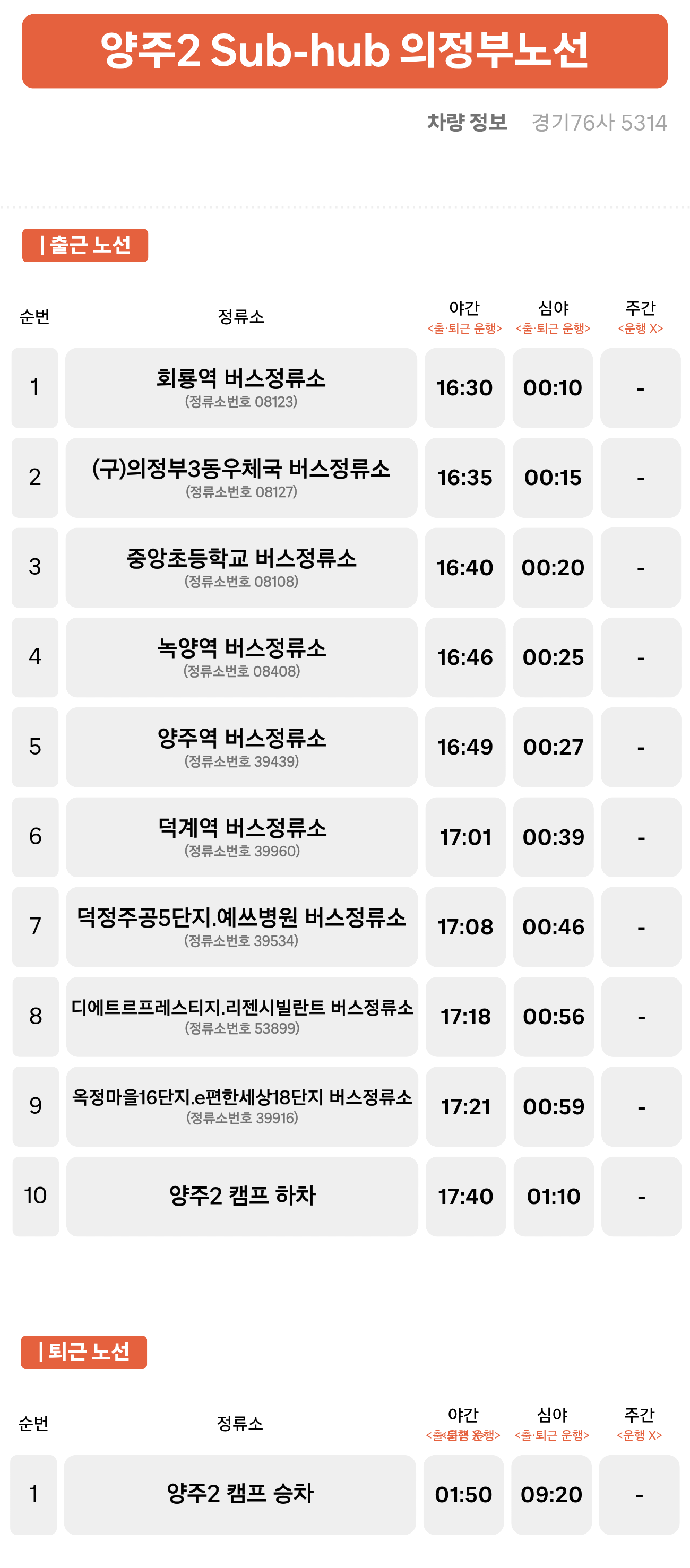 회룡역 버스정류소 ↔ (구)의정부3동우체국 버스정류소 ↔ 중앙초등학교 버스정류소 ↔ 녹양역 버스정류소 ↔ 양주역 버스정류소 ↔ 덕계역 버스정류소 ↔ 덕정주공5단지, 예쓰병원 버스정류소 ↔ 디에트르프레스티지, 리젠시빌란트 버스정류소 ↔ 옥정마을 16단지, e편한세상18단지 버스정류소 ↔ 양주2 캠프