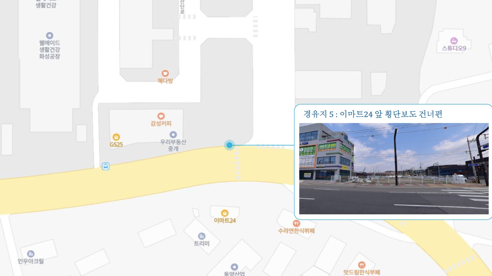 봉담수정동남메리트 버스정류소 ↔ 봉담중·고등학교 버스정류소 ↔ 하나로마트.화성고용센터 버스정류소 ↔ 병점역 후문 버스정류소 ↔ 화성1 캠프