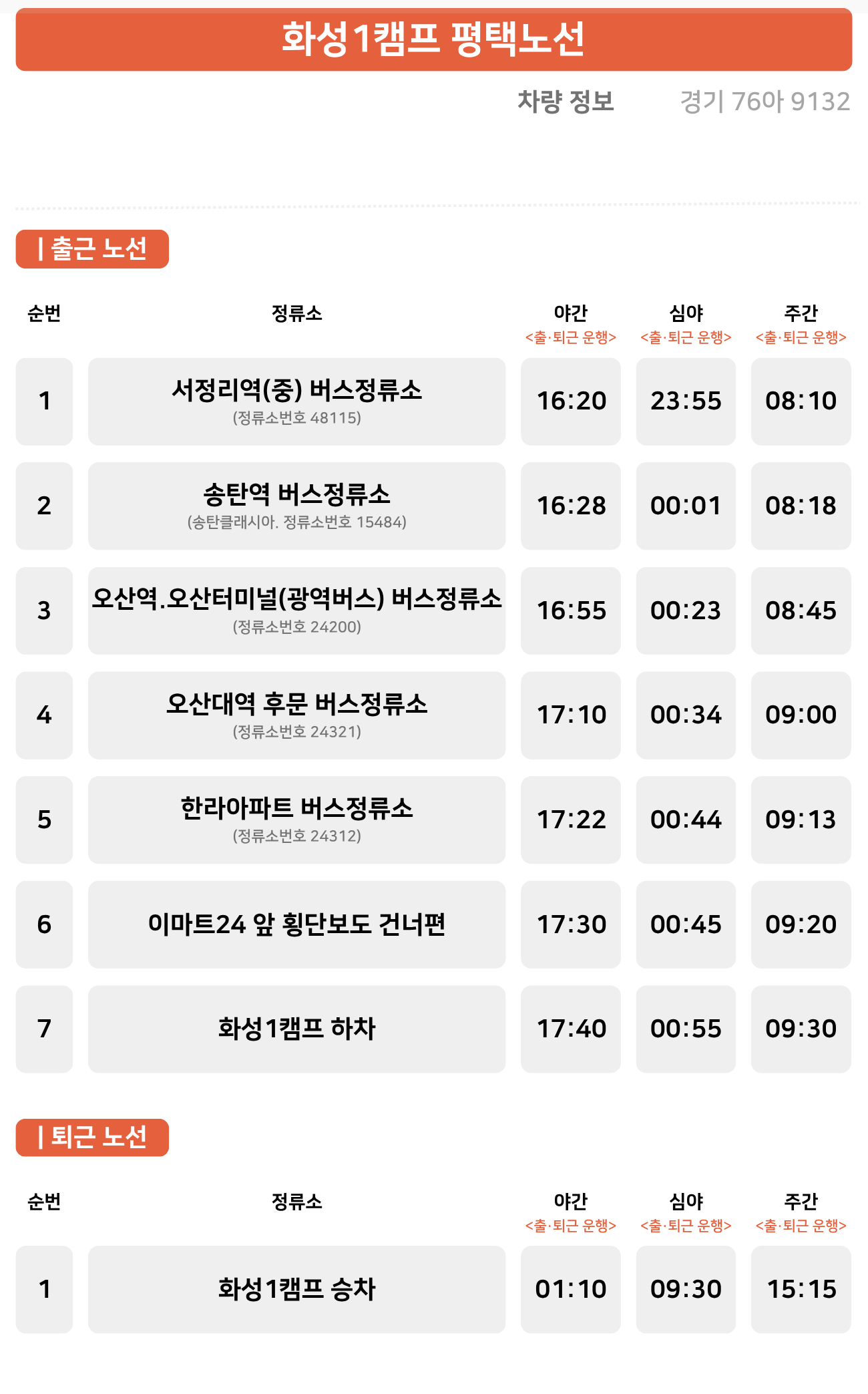 셔틀 버스 수원 노선 (야간, 심야 근무조)