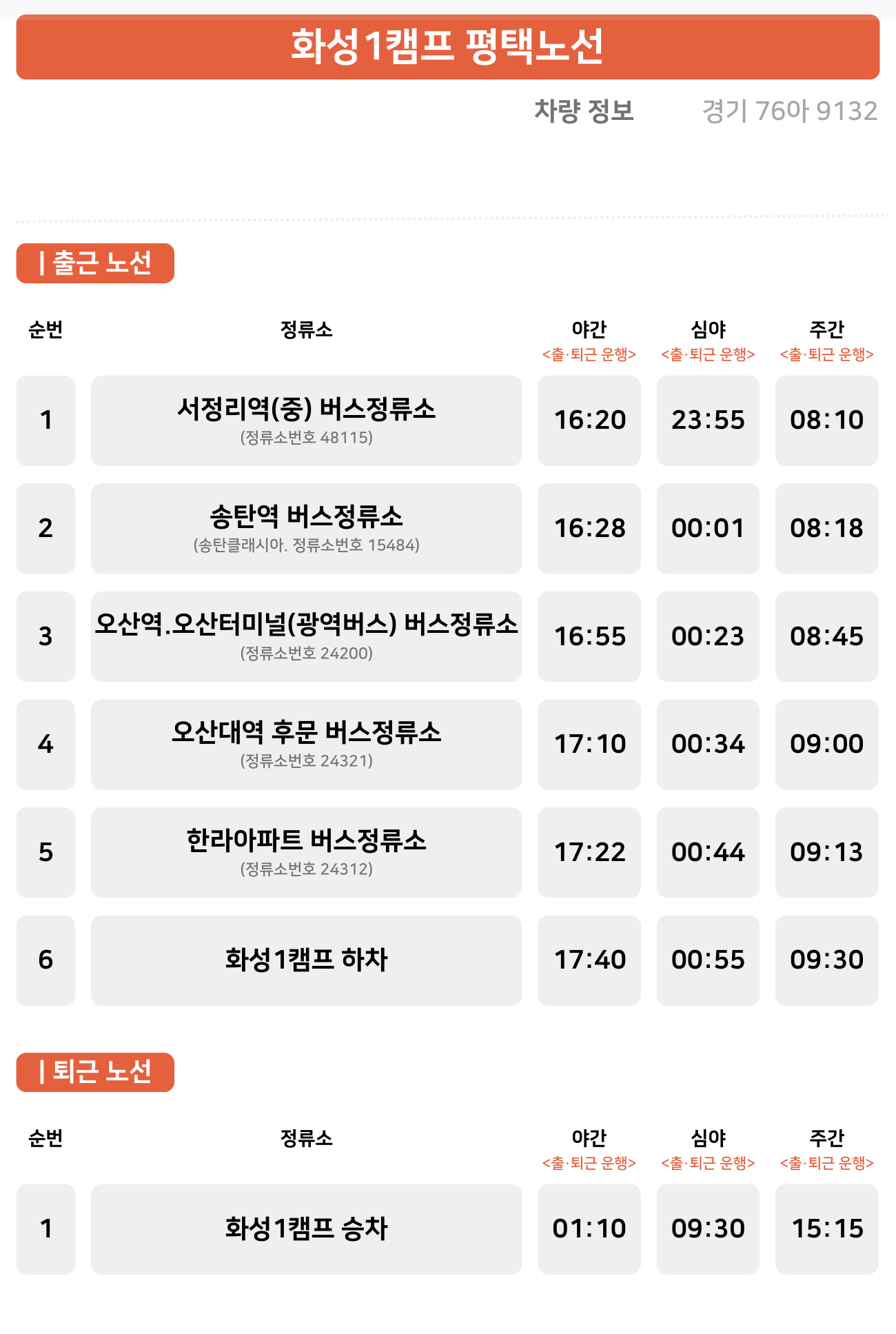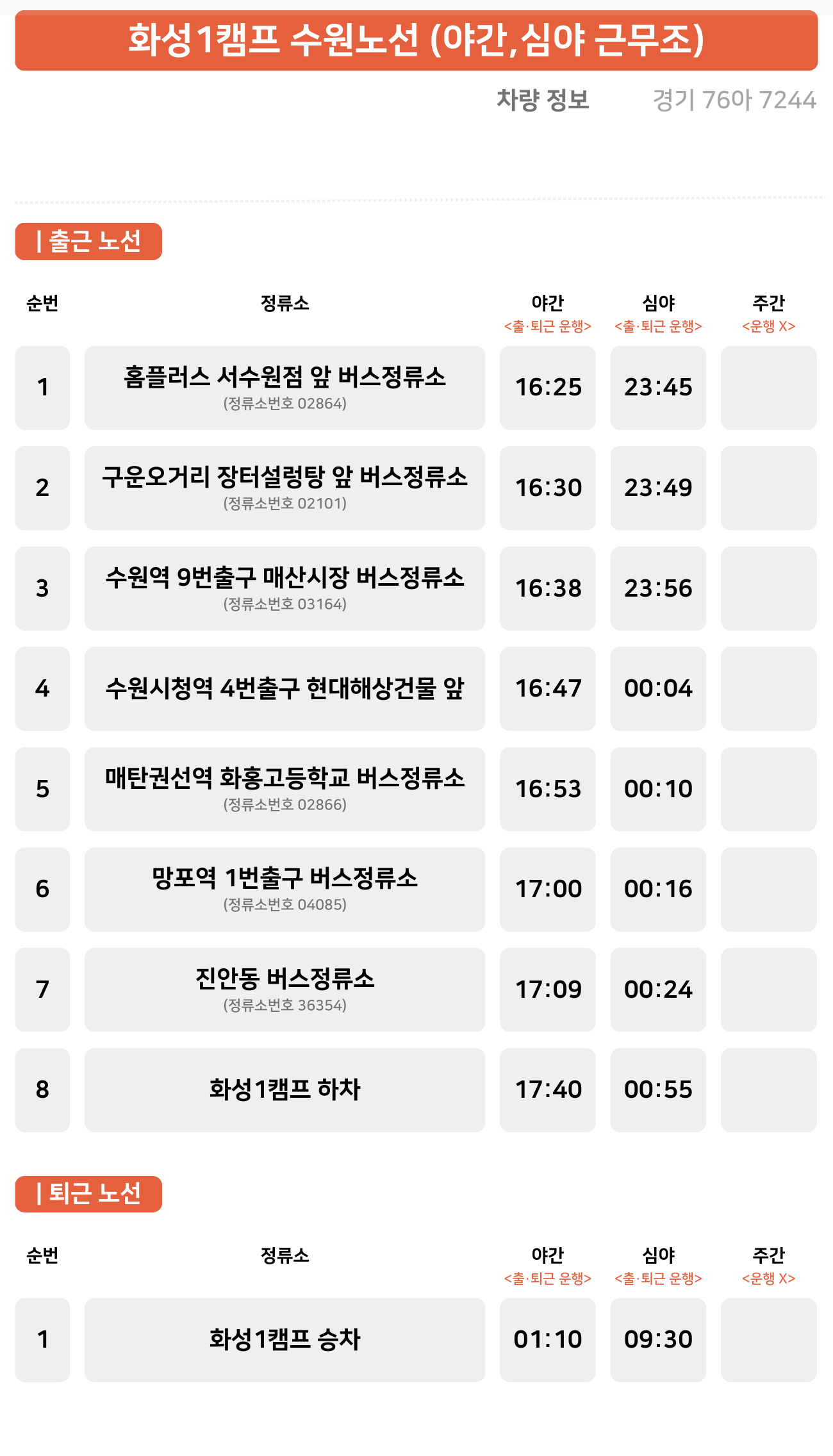 셔틀 버스 수원 노선 (야간, 심야 근무조)