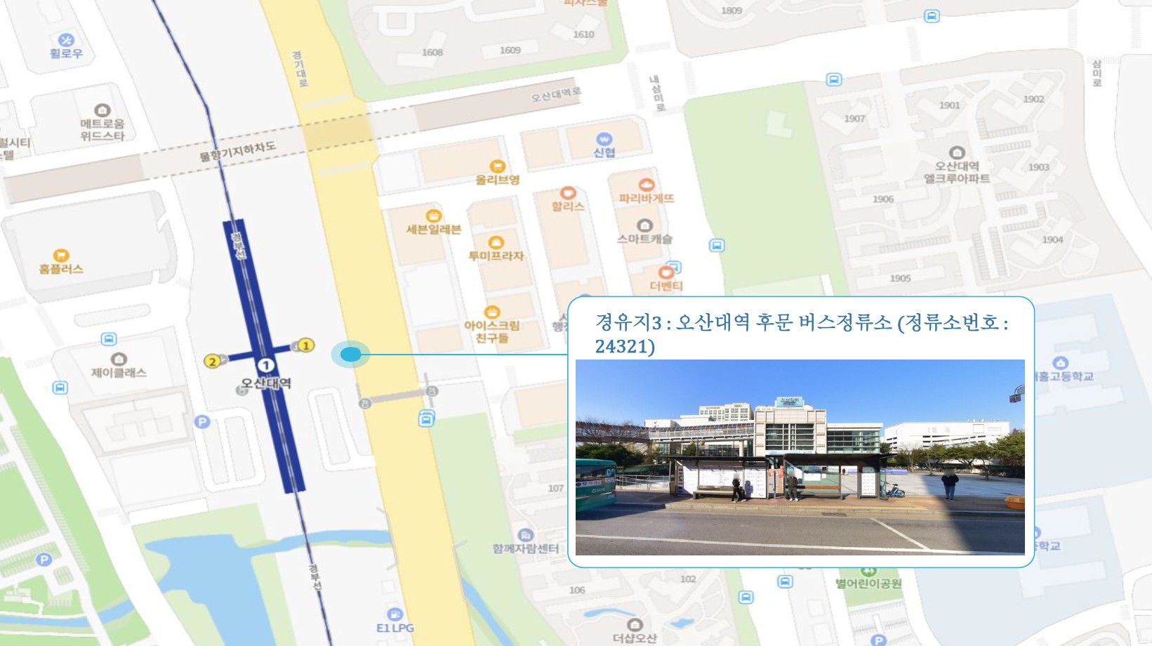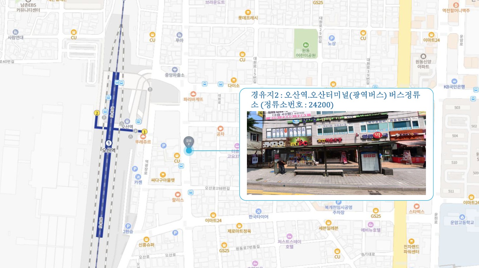 서정리역(중) 버스정류소 ↔ 송탄역 버스정류소(송탄클래시아) ↔ 오산역.오산터미널(광역버스) 버스정류소 ↔ 오산대역 후문 버스정류소 ↔ 한라아파트 버스정류소↔ 화성1 캠프