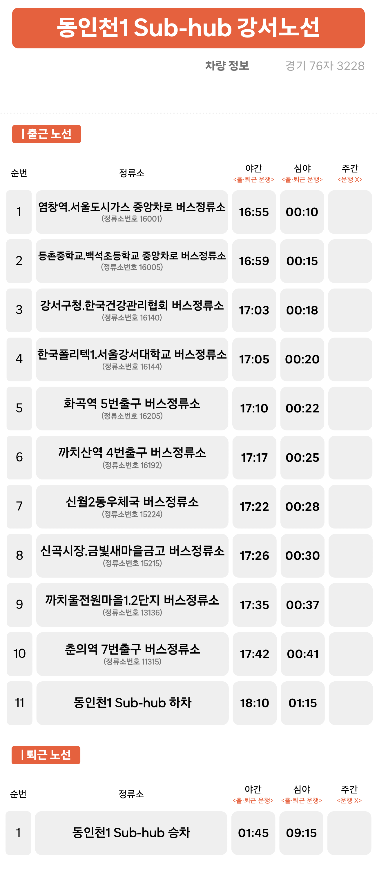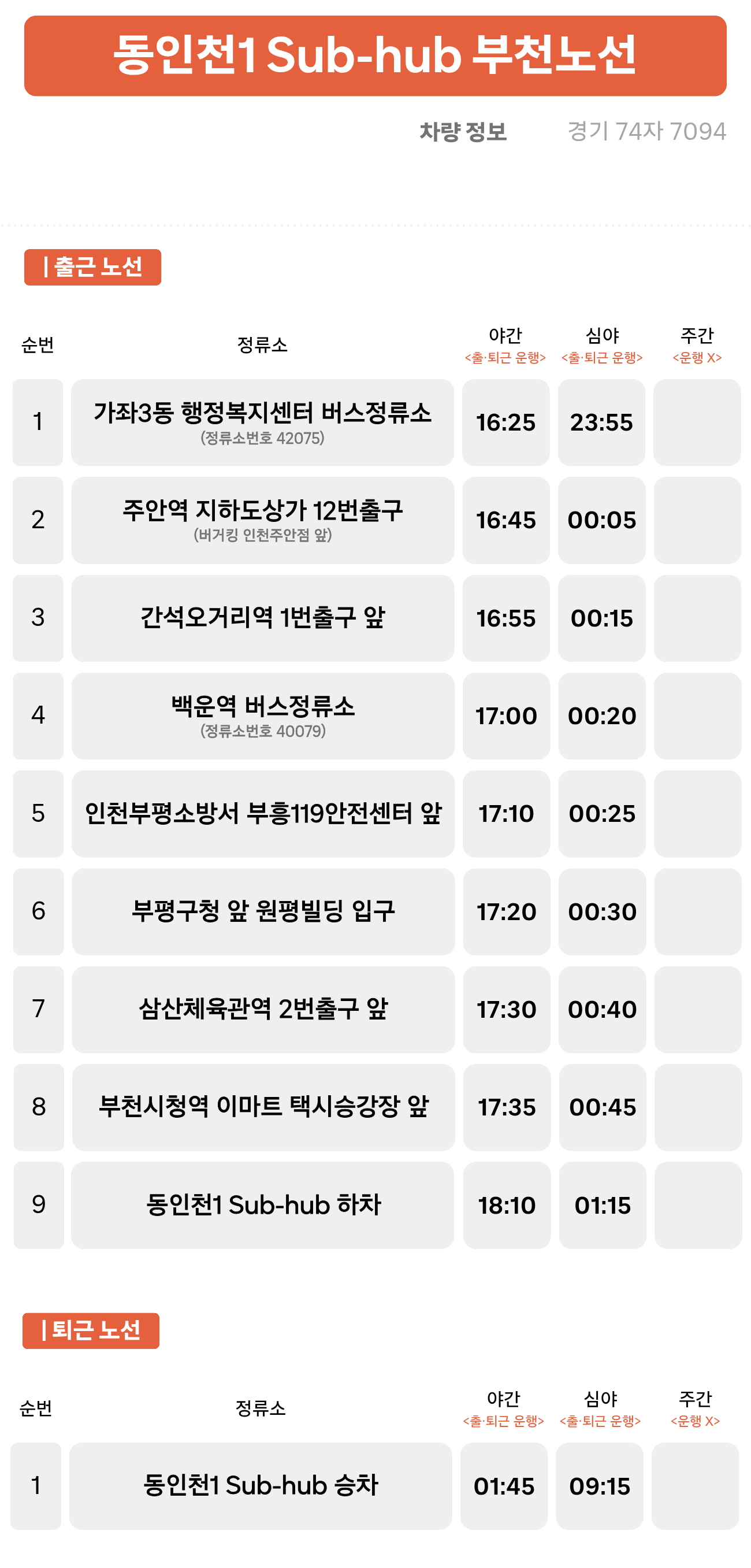 가좌3동 행정복지센터 버스정류소 ↔ 주안역 ↔ 간석오거리역 ↔ 백운역 ↔ 인천부평소방서 부흥119안전센터 앞 ↔ 부평구청 ↔ 삼산체육관역 ↔ 부천시청역 ↔ 동인천1 Sub-hub