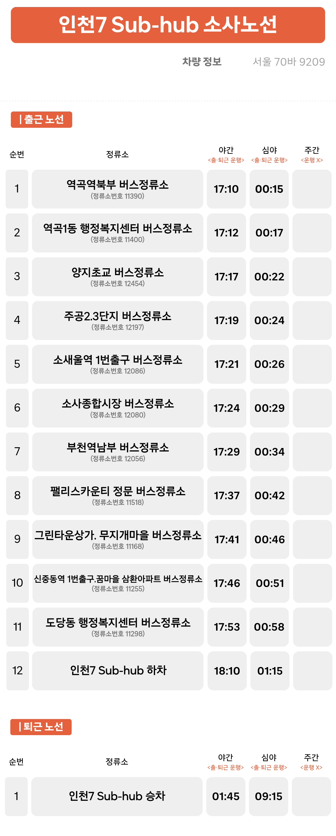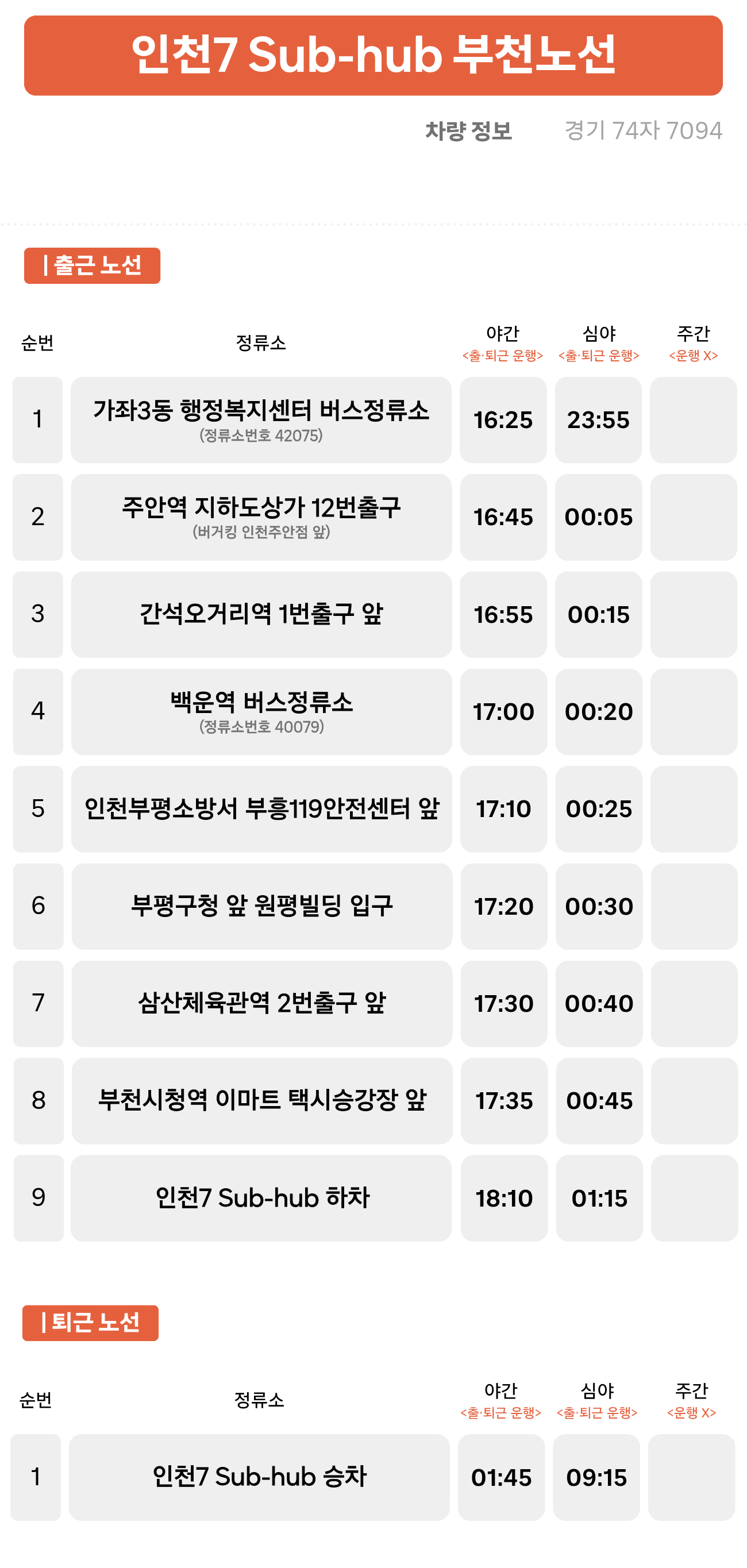 가좌3동 행정복지센터 버스정류소 ↔ 주안역 ↔ 간석오거리역 ↔ 백운역 ↔ 인천부평소방서 부흥119안전센터 앞 ↔ 부평구청 ↔ 삼산체육관역 ↔ 부천시청역 ↔ 인천7 Sub-hub
