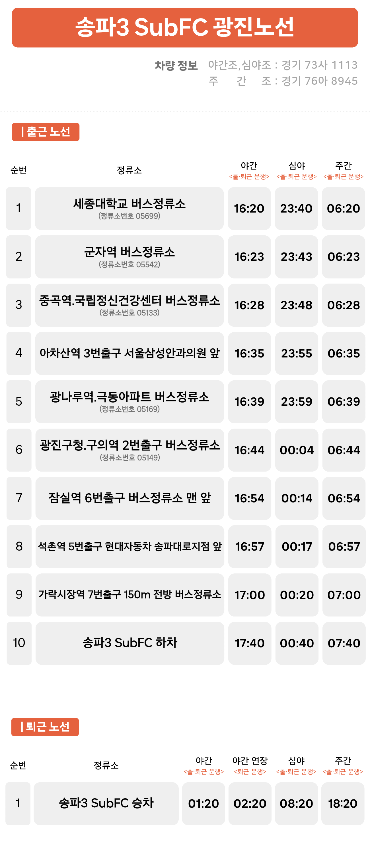 세종대학교 ↔ 군자역 ↔ 중곡역.국립정신건강센터 ↔ 아차산역 ↔ 광나루역.극동아파트 ↔ 광진구청.구의역 ↔ 잠실역 ↔ 석촌역 ↔ 가락시장역 ↔ 송파3 Sub FC