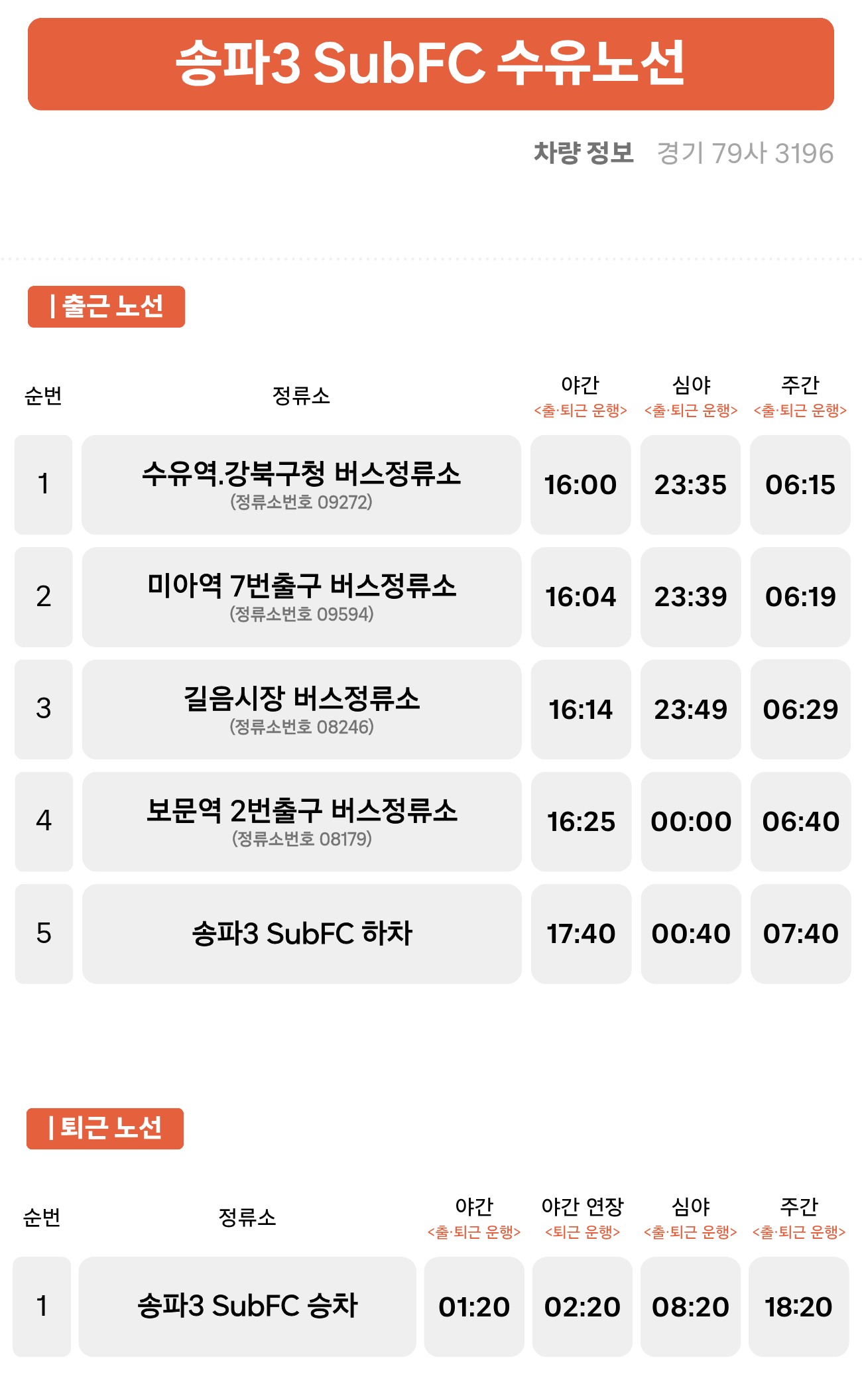 수유역 ↔ 미아역 ↔ 길음시장 버스정류소 ↔ 보문역 ↔ 송파3 Sub FC