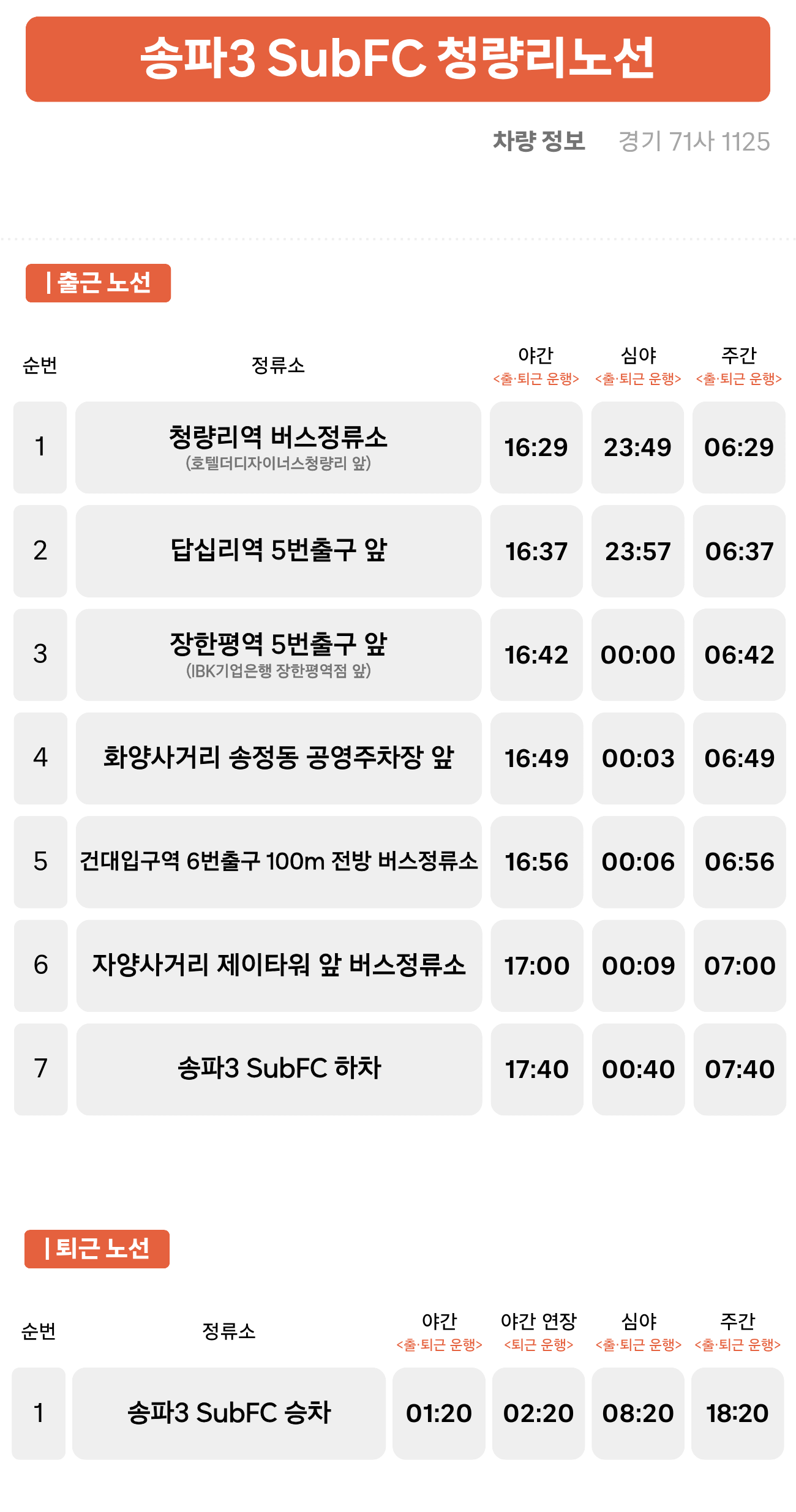 청량리역 ↔ 답십리역 ↔ 장한평역 ↔ 화양사거리 ↔ 건대입구역 ↔ 자양사거리 ↔ 송파3 Sub FC