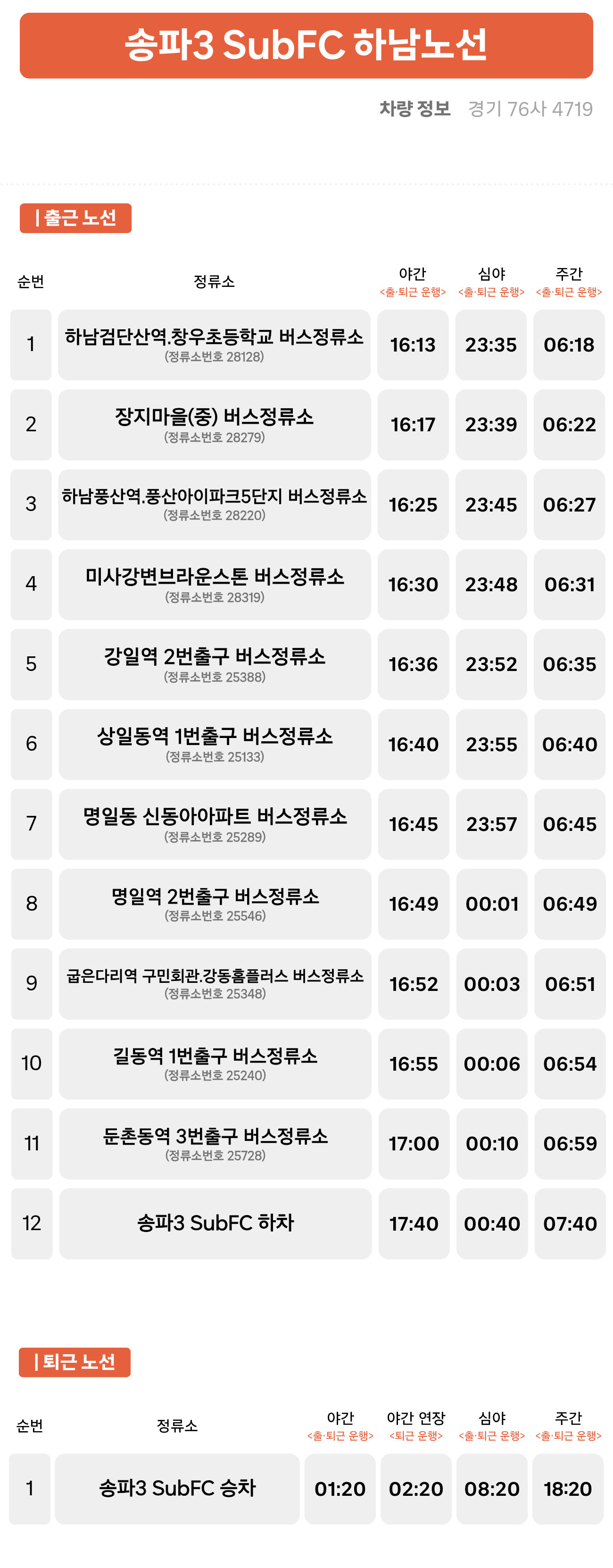 하남검단산역.창우초교 ↔ 장지마을(중) 버스정류소 ↔ 하남풍산역.풍산아이파크5단지 ↔ 미사강변브라운스톤 ↔ 강일역 ↔ 상일동역↔ 명일동 신동아아파트 ↔ 명일역 ↔ 굽은다리역구민회관.강동홈플러스 ↔ 길동역 ↔ 둔촌동역 ↔ 송파3 Sub FC