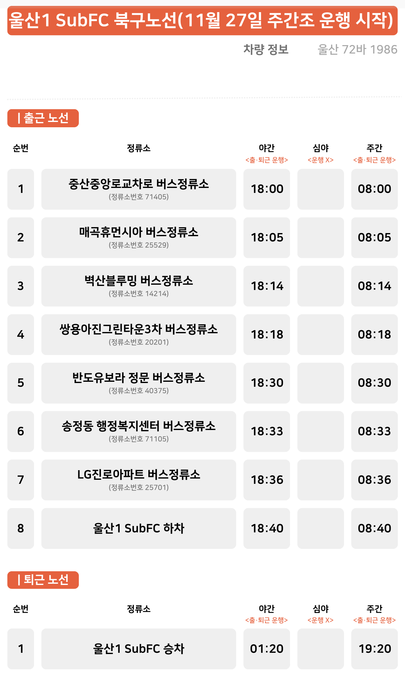중산중앙로교차로 ↔ 매곡휴먼시아 ↔ 벽산블루밍 ↔ 쌍용아진그린타운3차 ↔ 반도유보라 ↔ 송정동 행정복지센터 ↔ LG진로아파트 ↔ 울산1 Sub FC